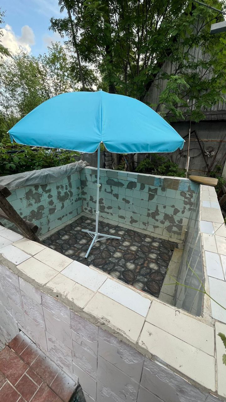 От бани идет площадка с бассейном, вылитым из камня своими руками. На площадке остается качеля, стол и стулья.