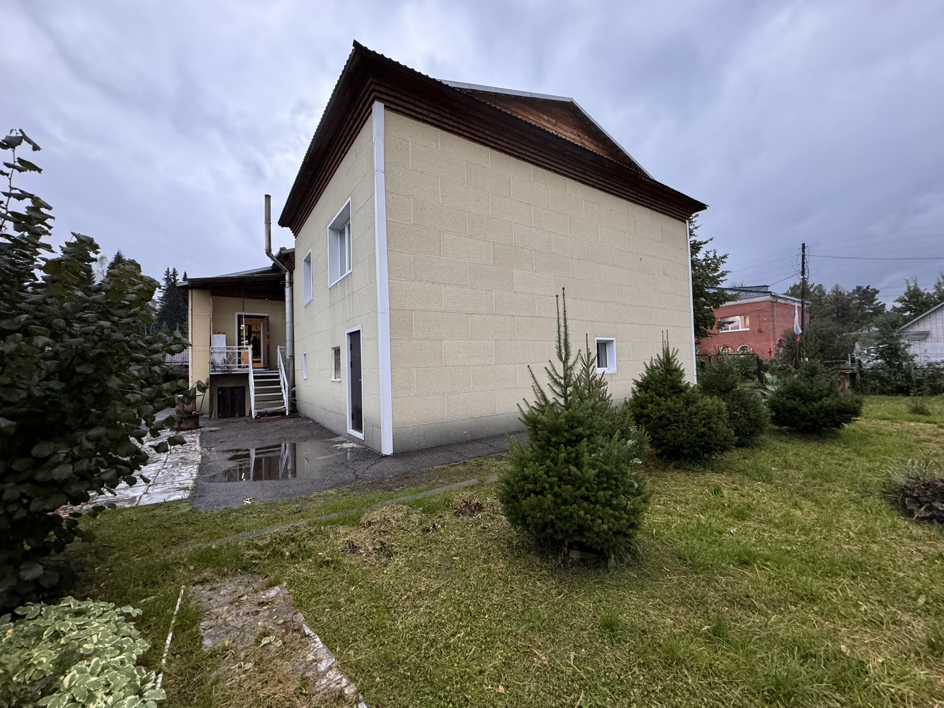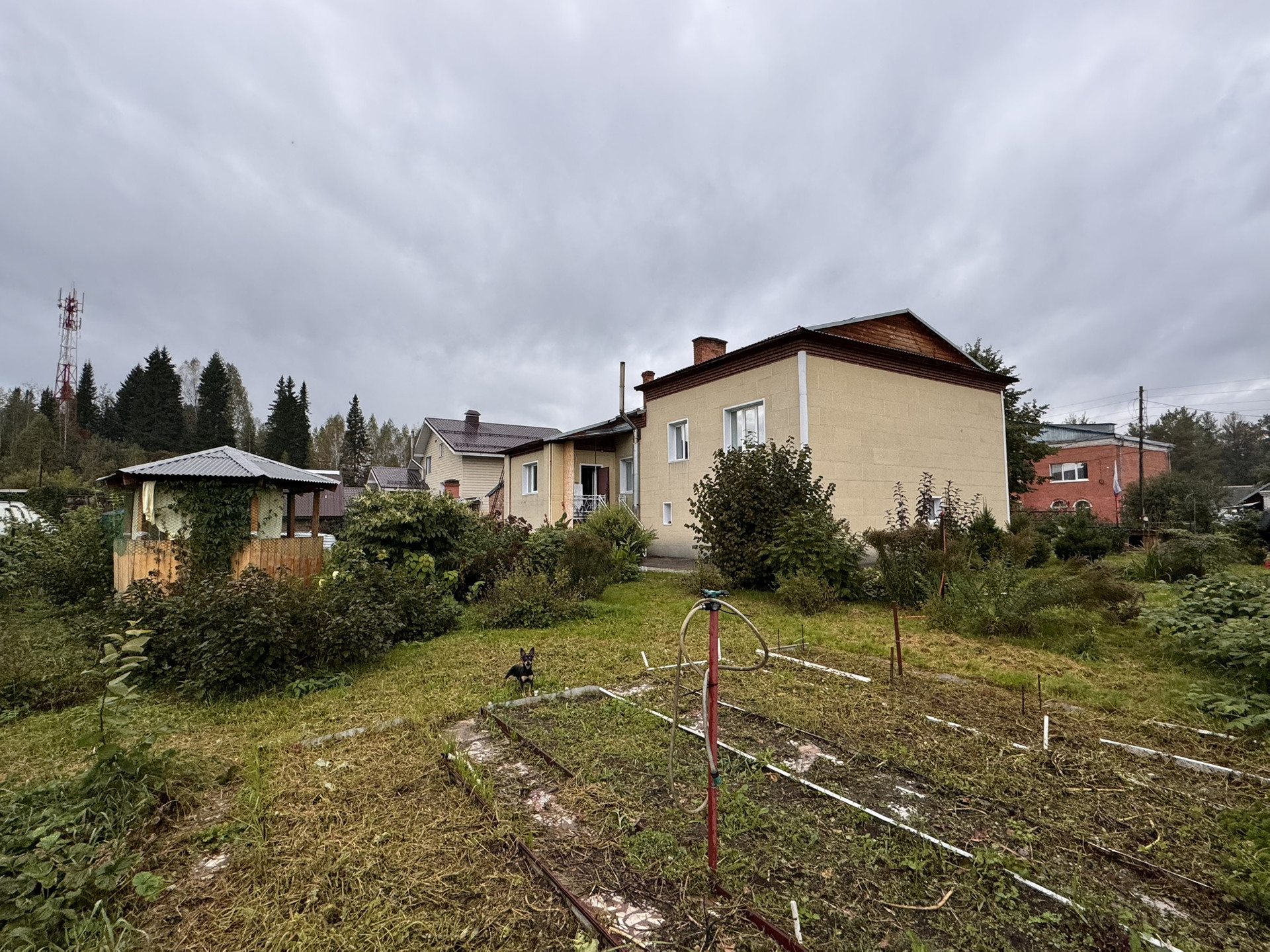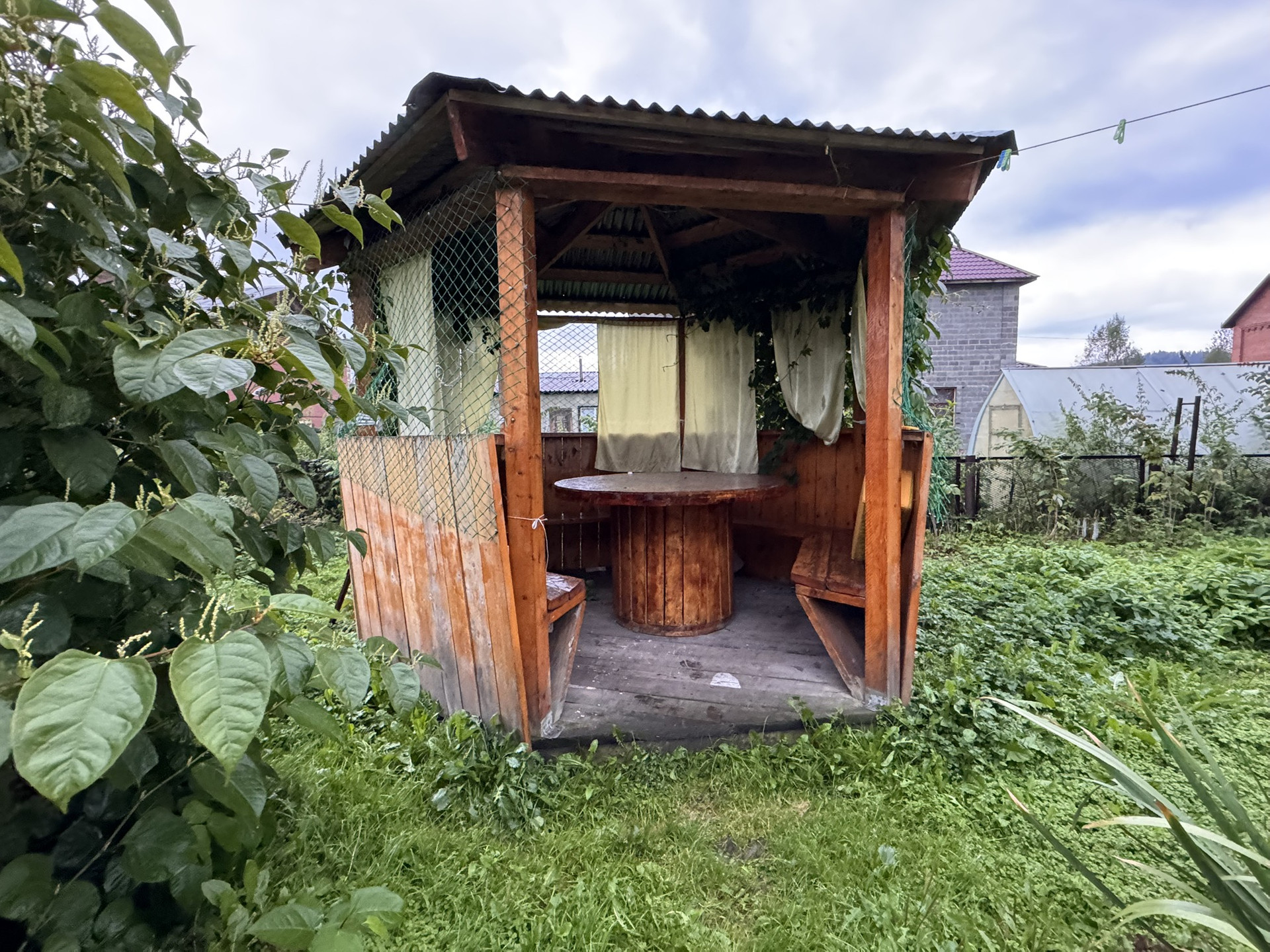 Дом построен из кирпича, вода центральная, имеются баня, гараж, беседка, парник, множество культурных растений.