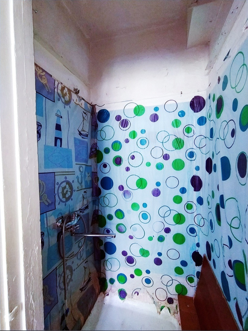 Есть отдельная кухонная зона с небольшой раковиной. Санузел - свой, в квартире, душевая требует ремонта.