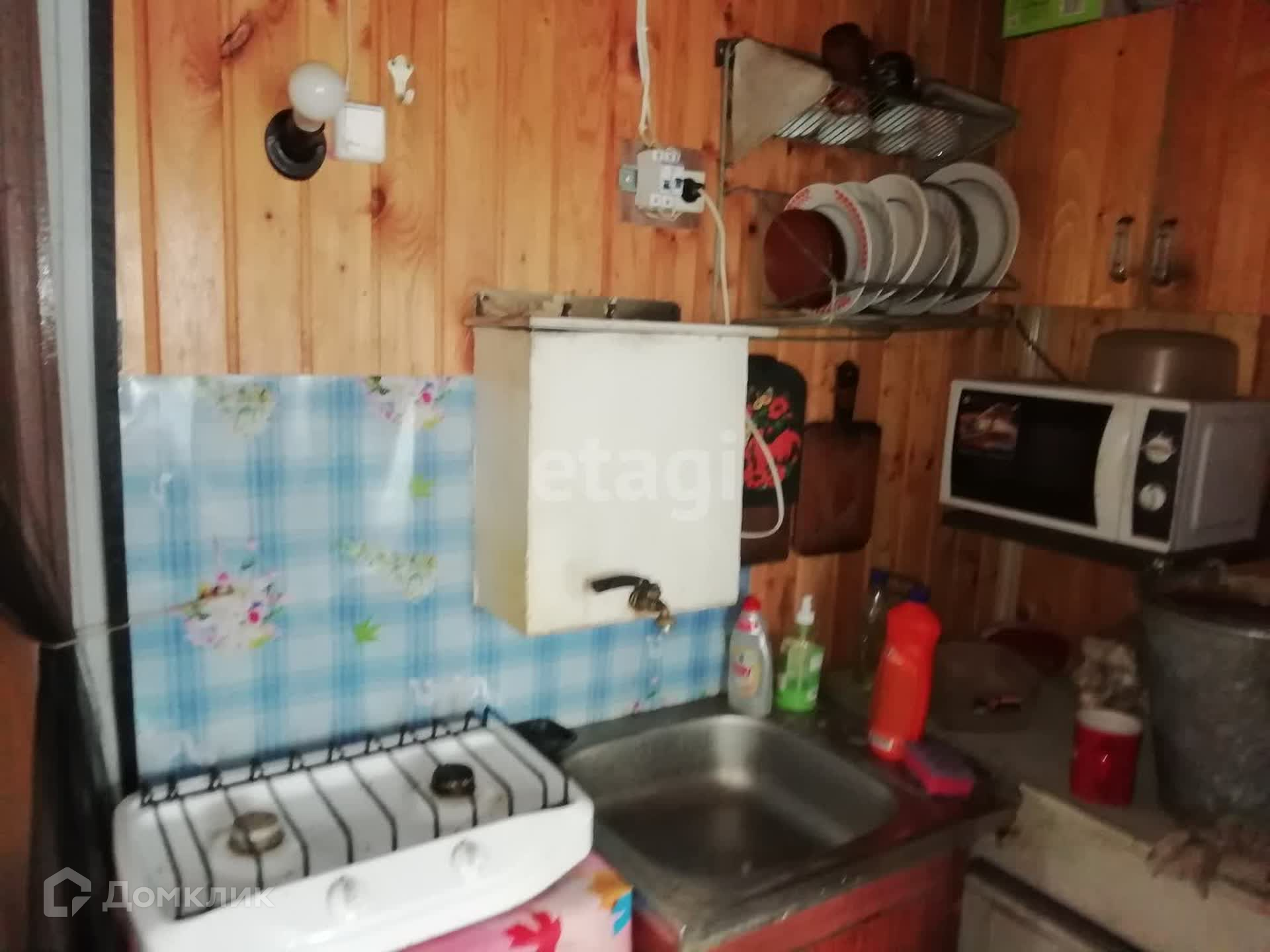 Домик оснащён дровяной печью, благодаря которой до глубокой осени в доме комфортно. На первом этаже дома комната с небольшой кухней, на втором этаже (мансарде) имеется дополнительная комната отдыха и выход на балкончик. Все комнаты обшиты деревянной рейкой.