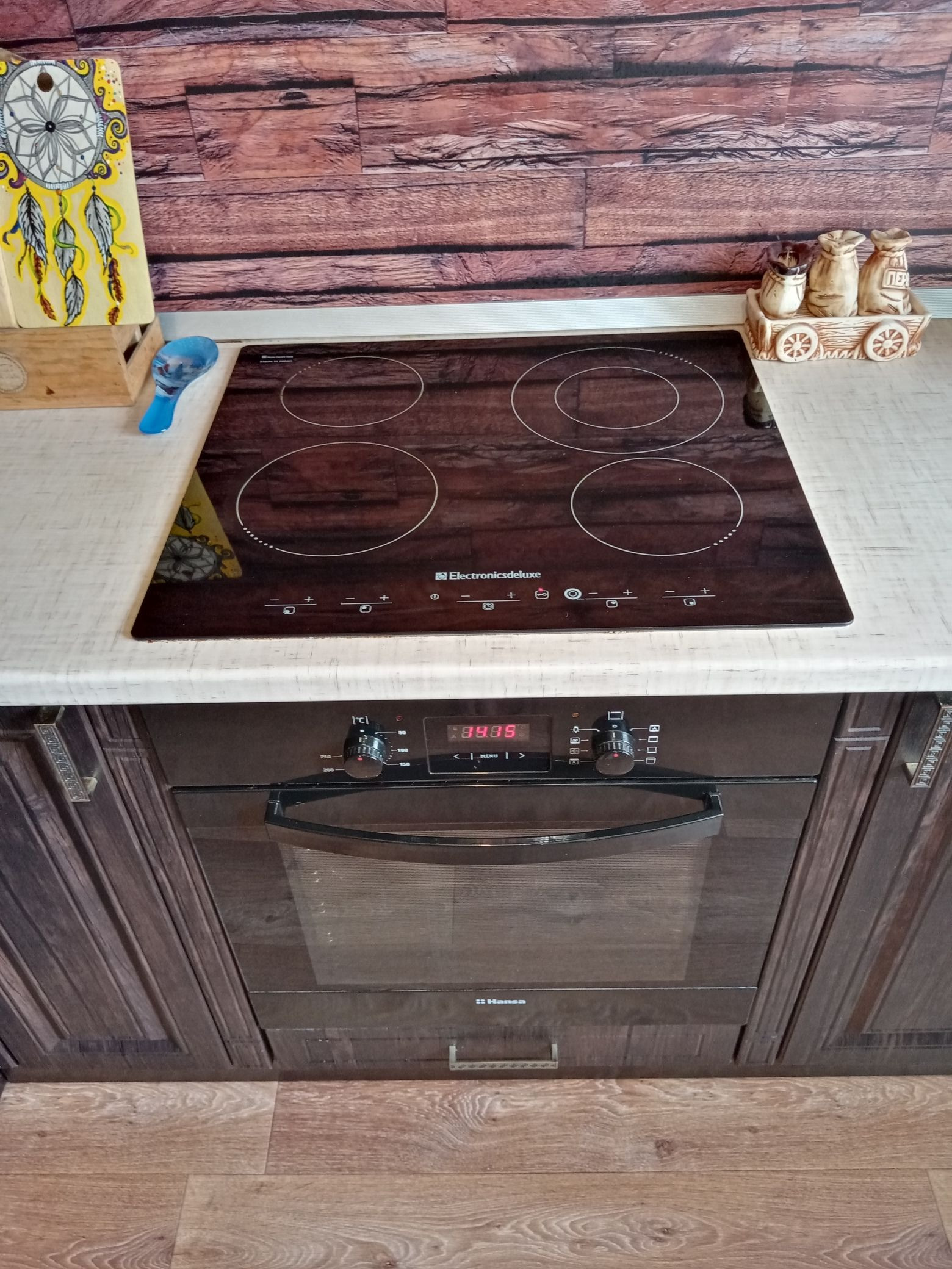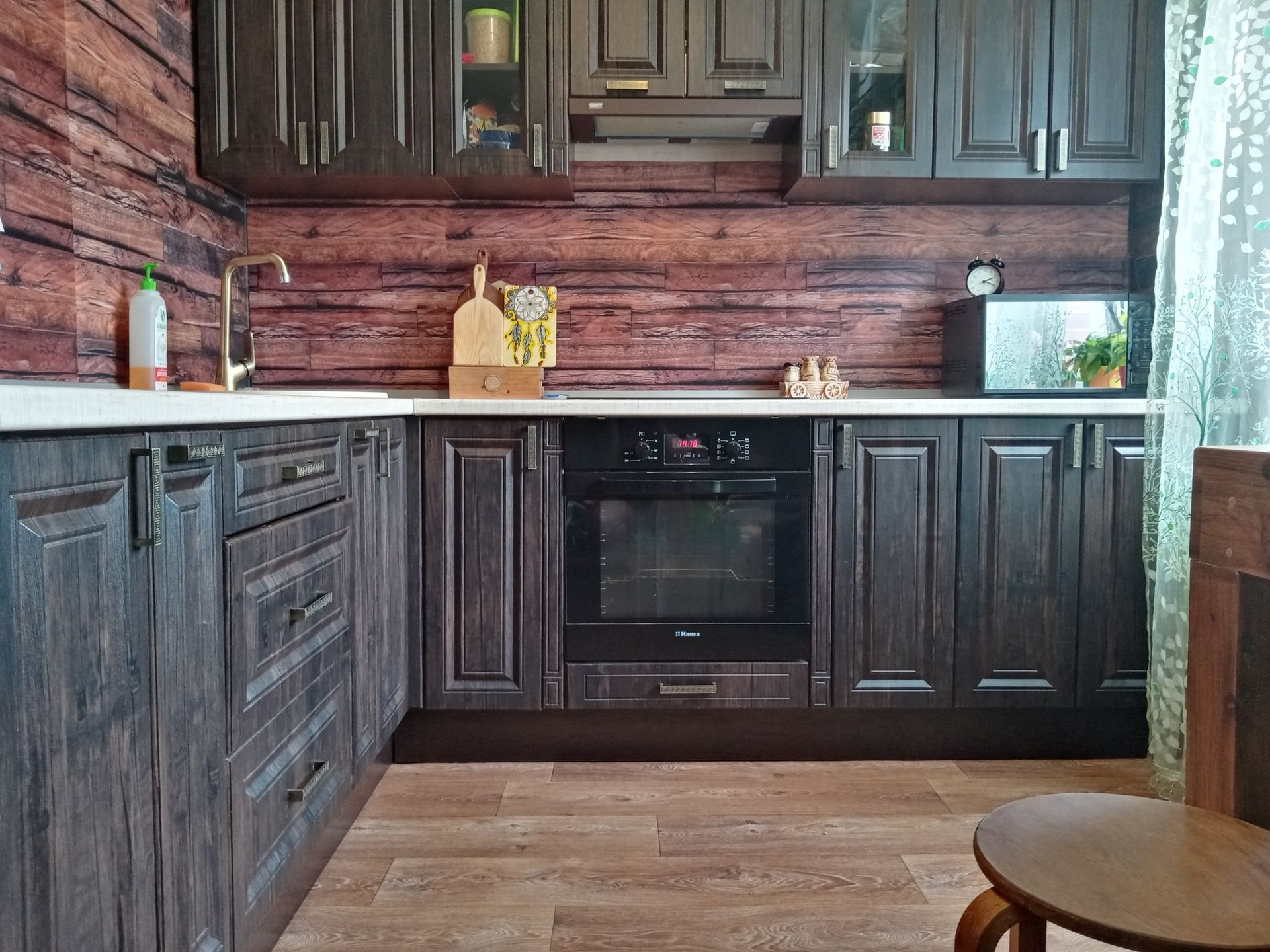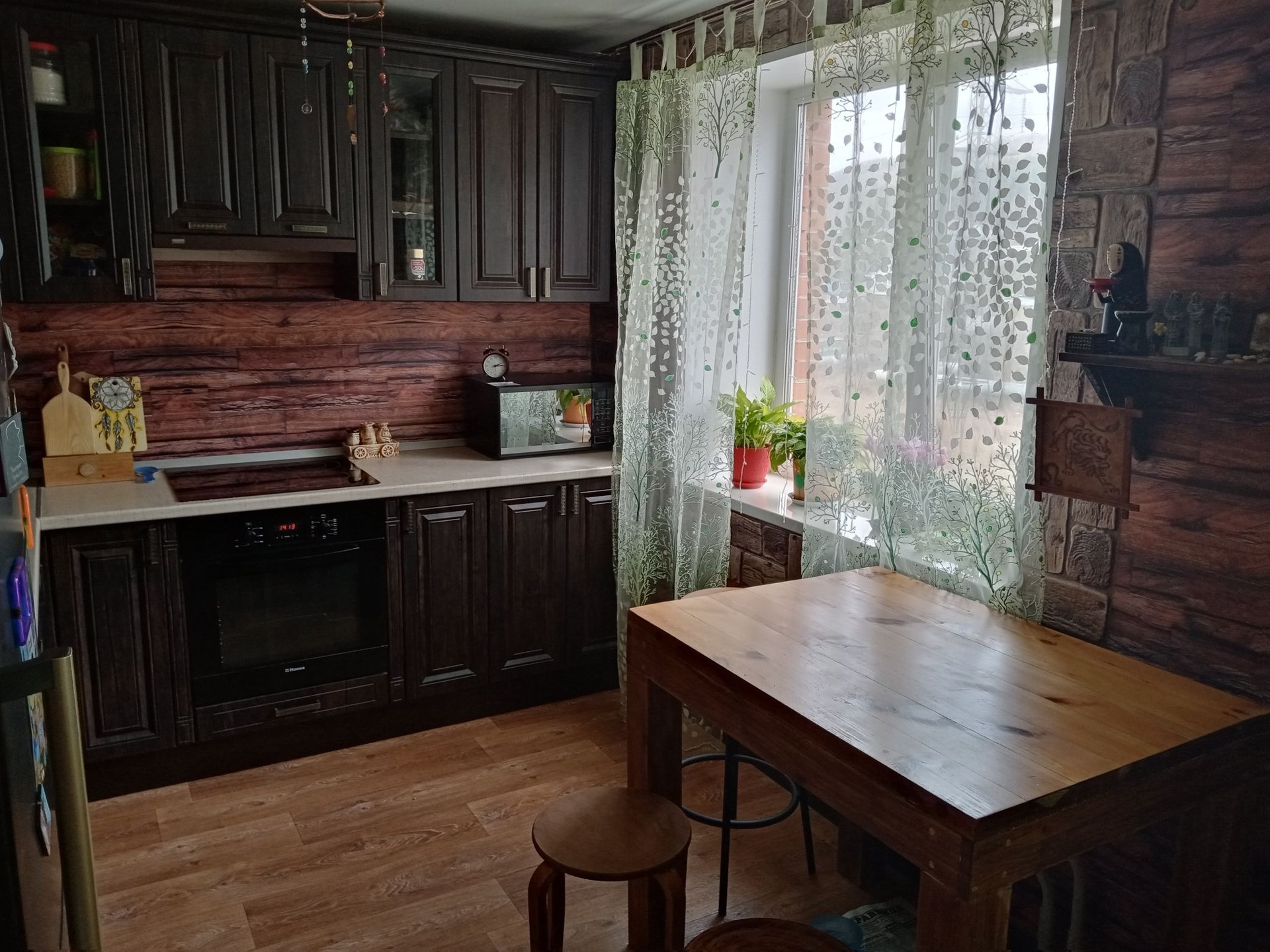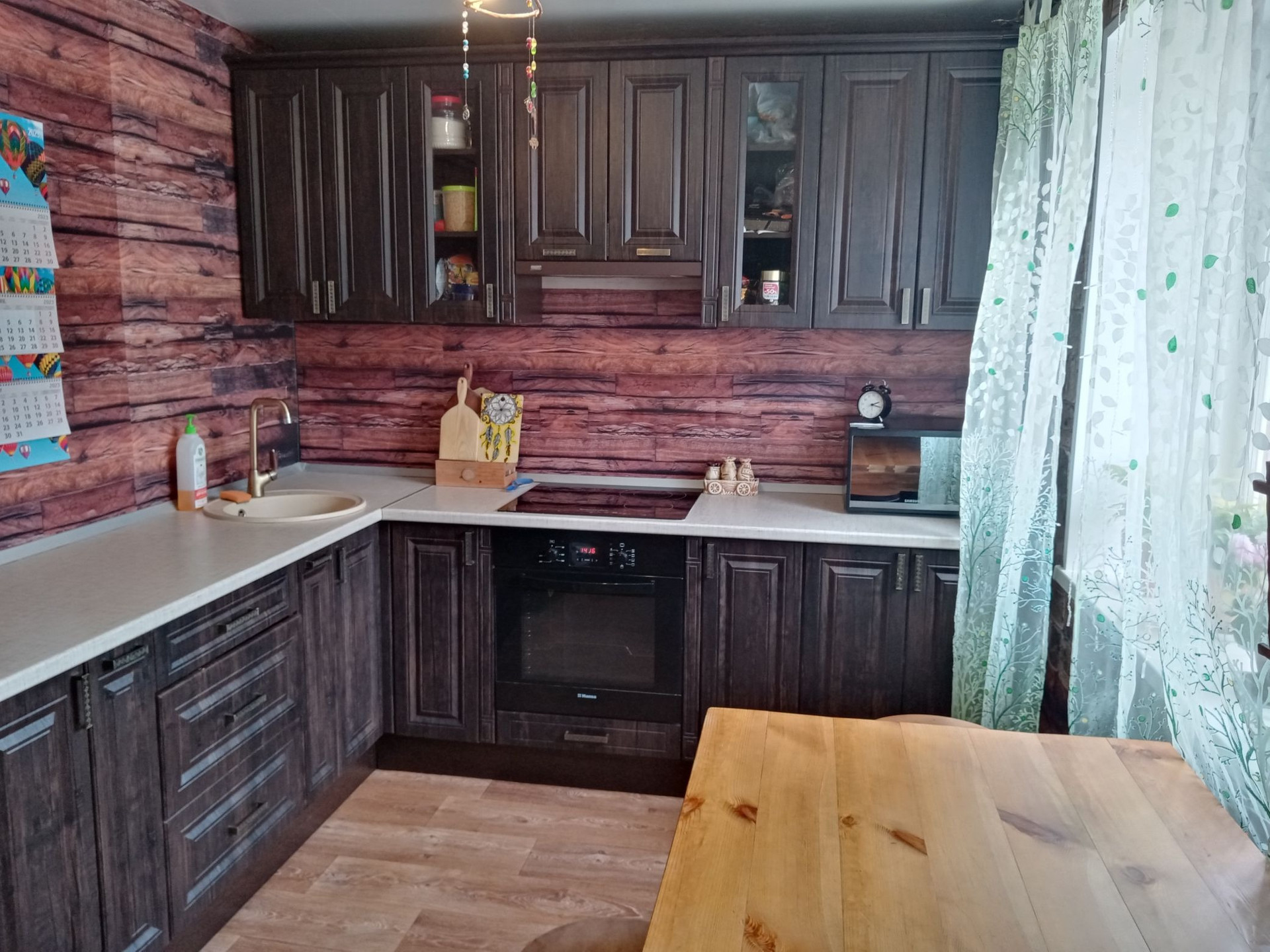 При продаже остается кухонный гарнитур с встроенной новой техникой (духовой шкаф, варочная поверхность, вытяжка).