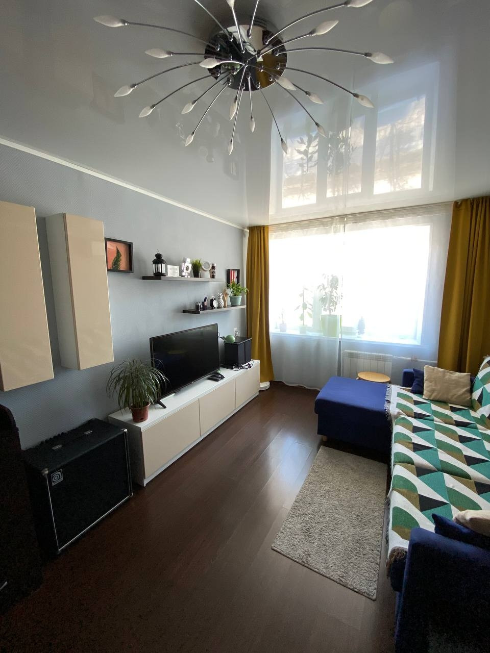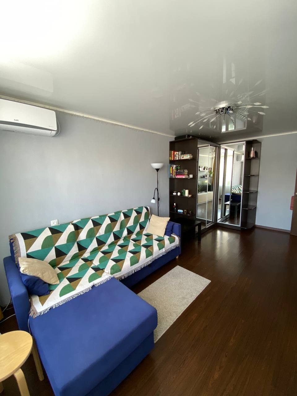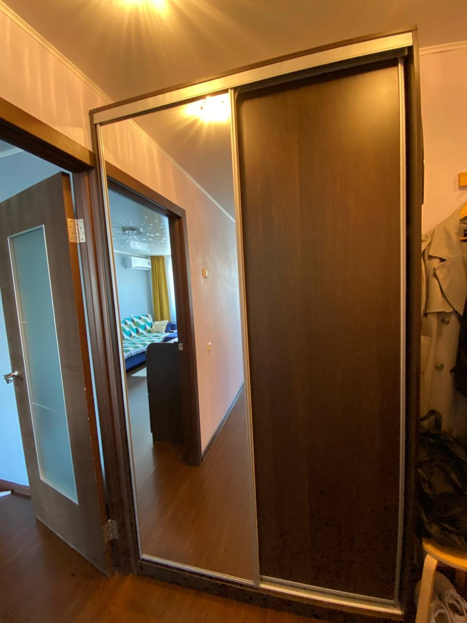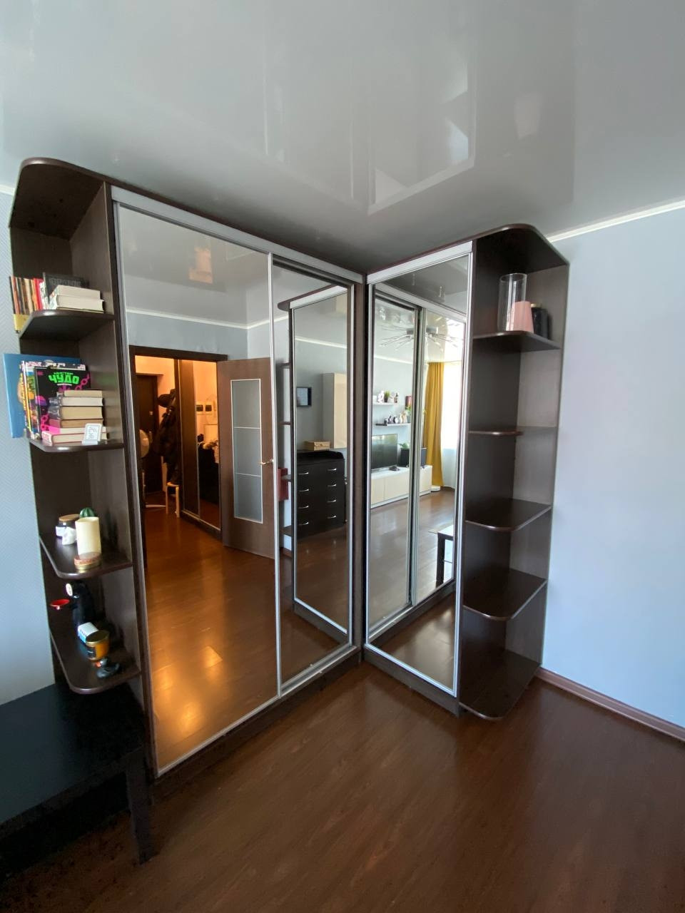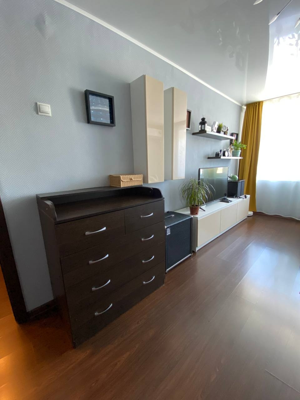 - угловой просторный шкаф-купе и комод, шкаф-купе и обувница в коридоре, шкафы под ТВ, подвесные шкафчики на стене  и кондиционер в комнате;