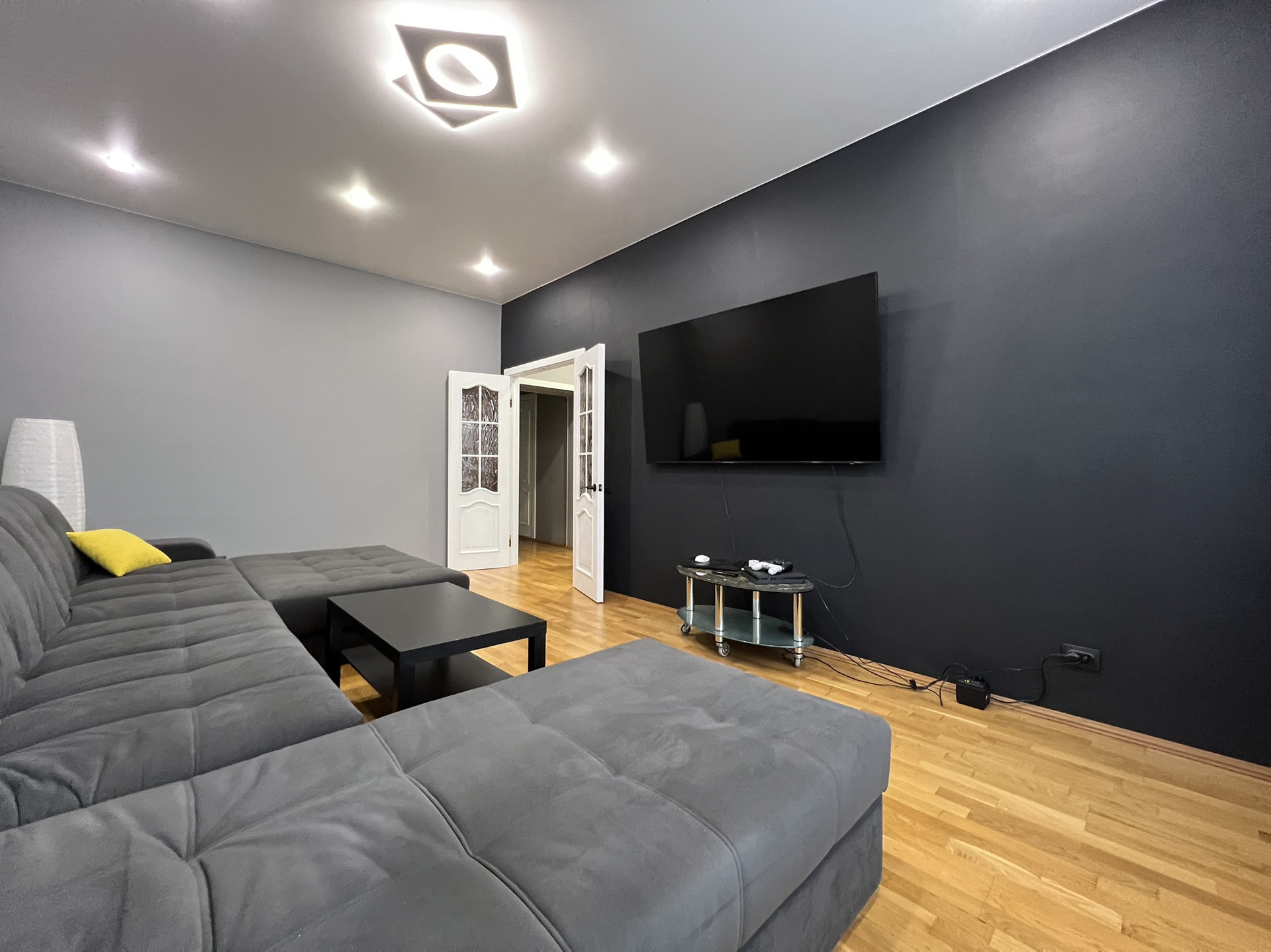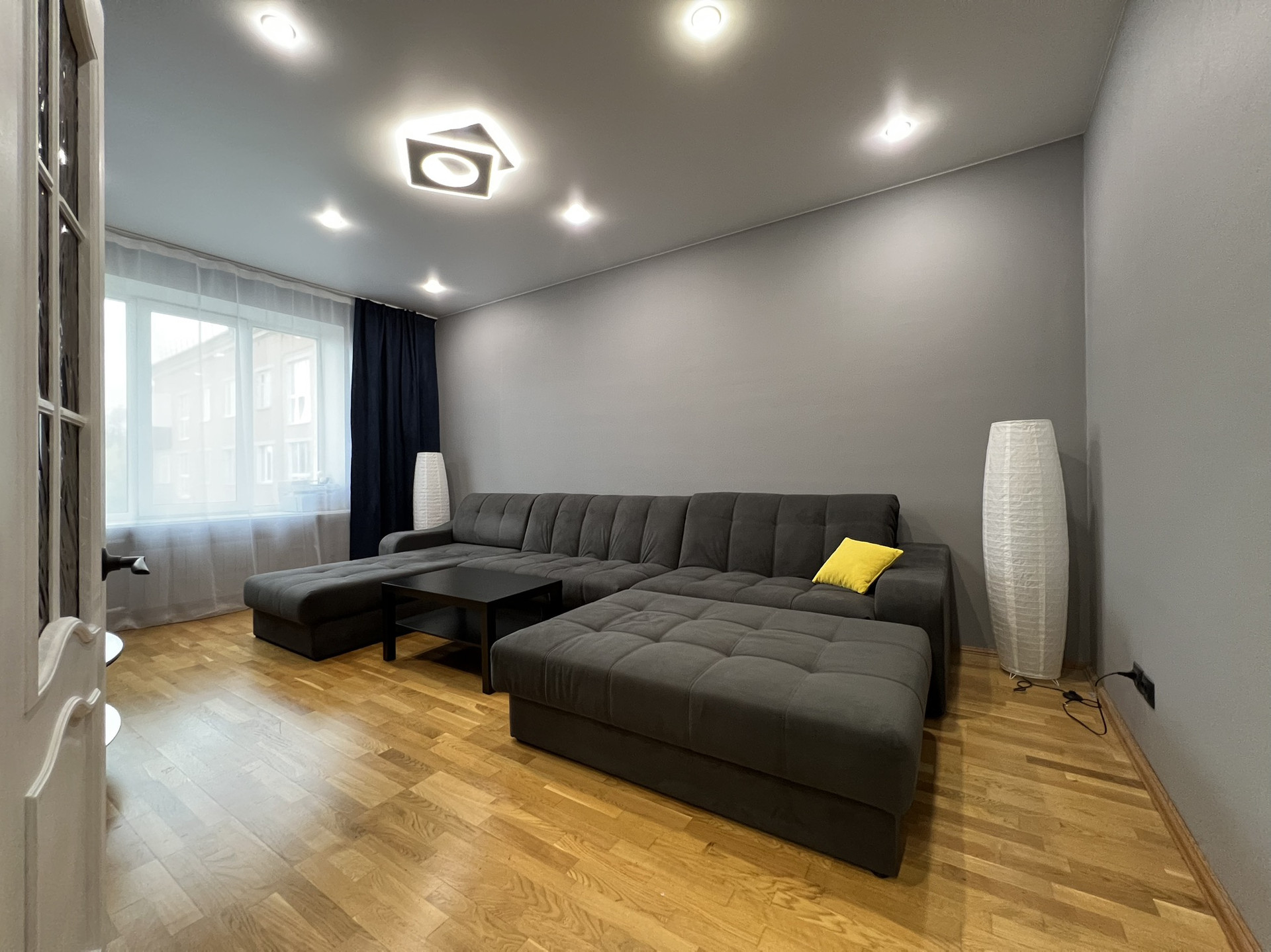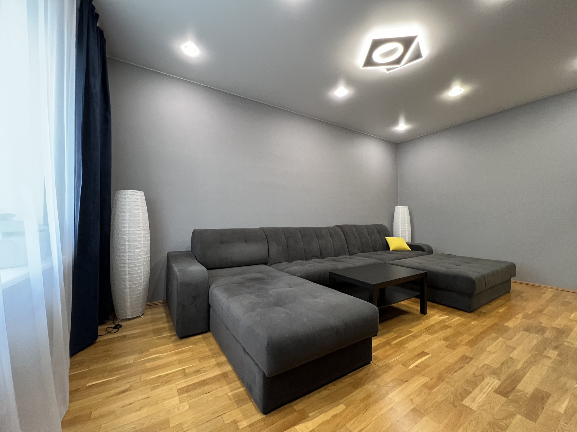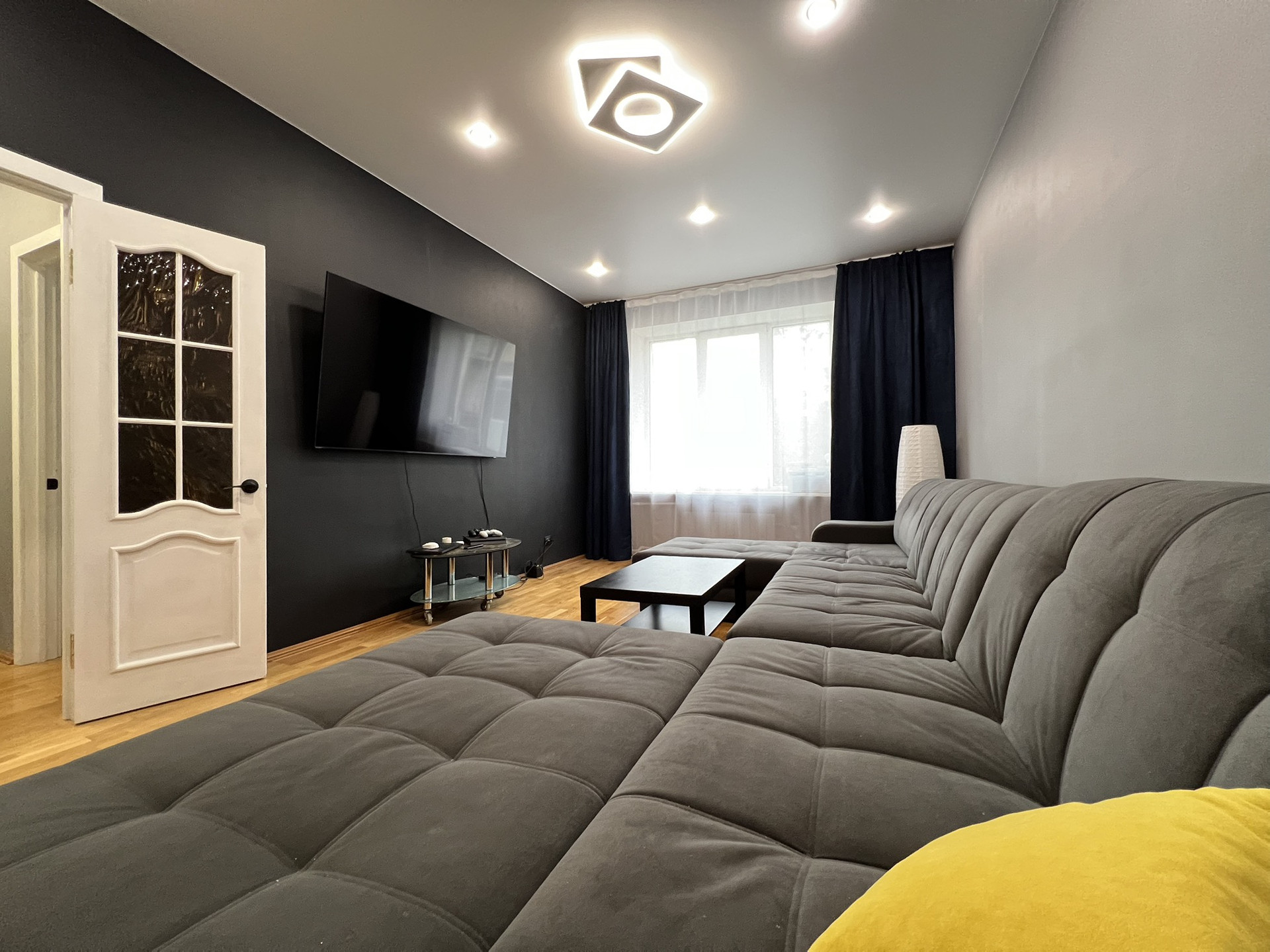 ✅ На кухне, в детской и спальной комнате потолки «под яйцо». В прихожей, коридоре и гостиной натянут матовый потолок.