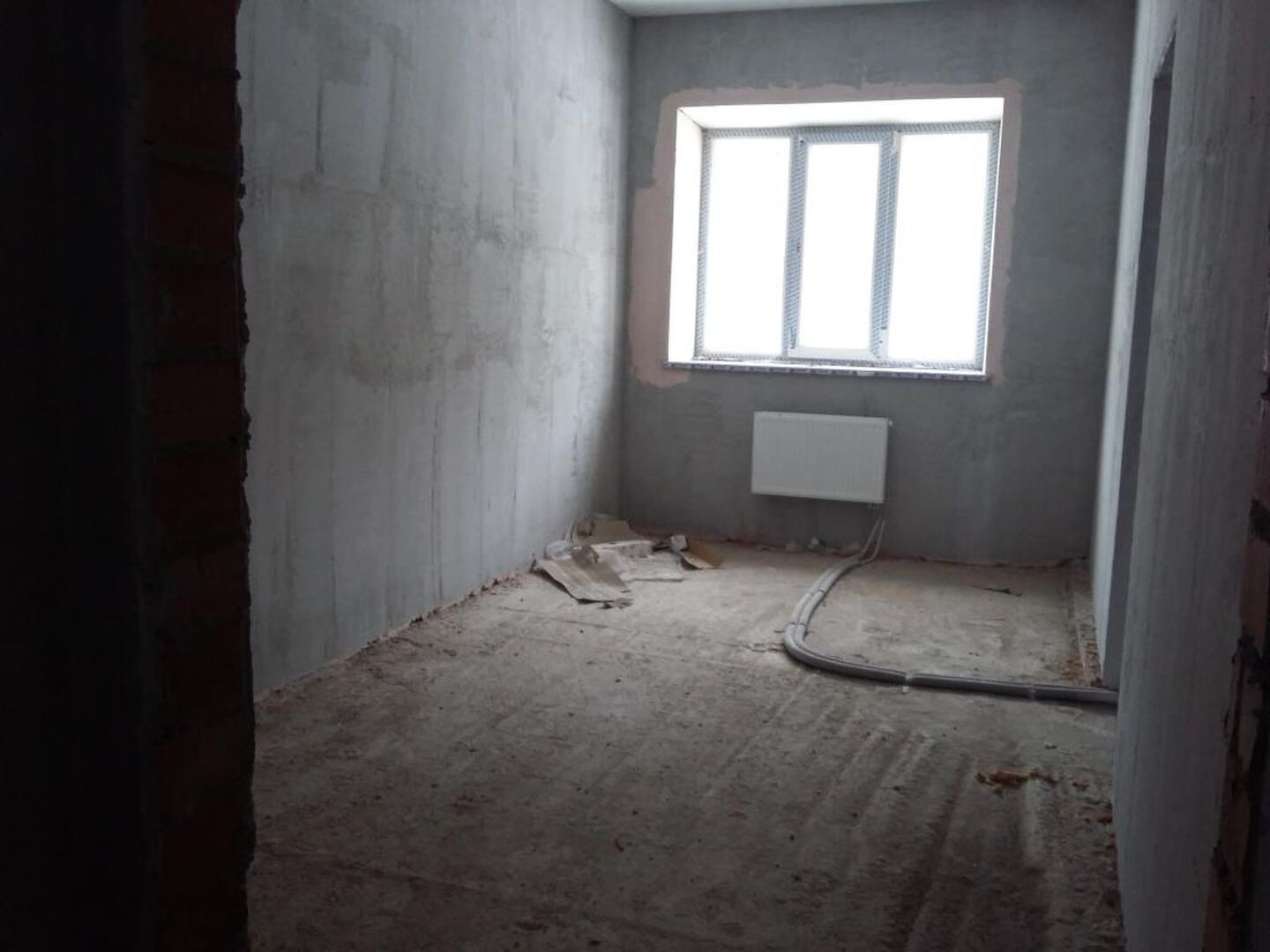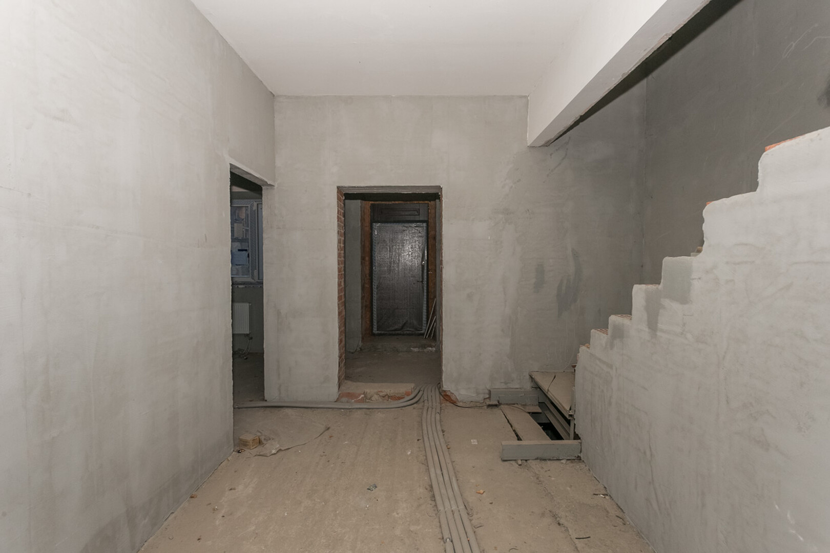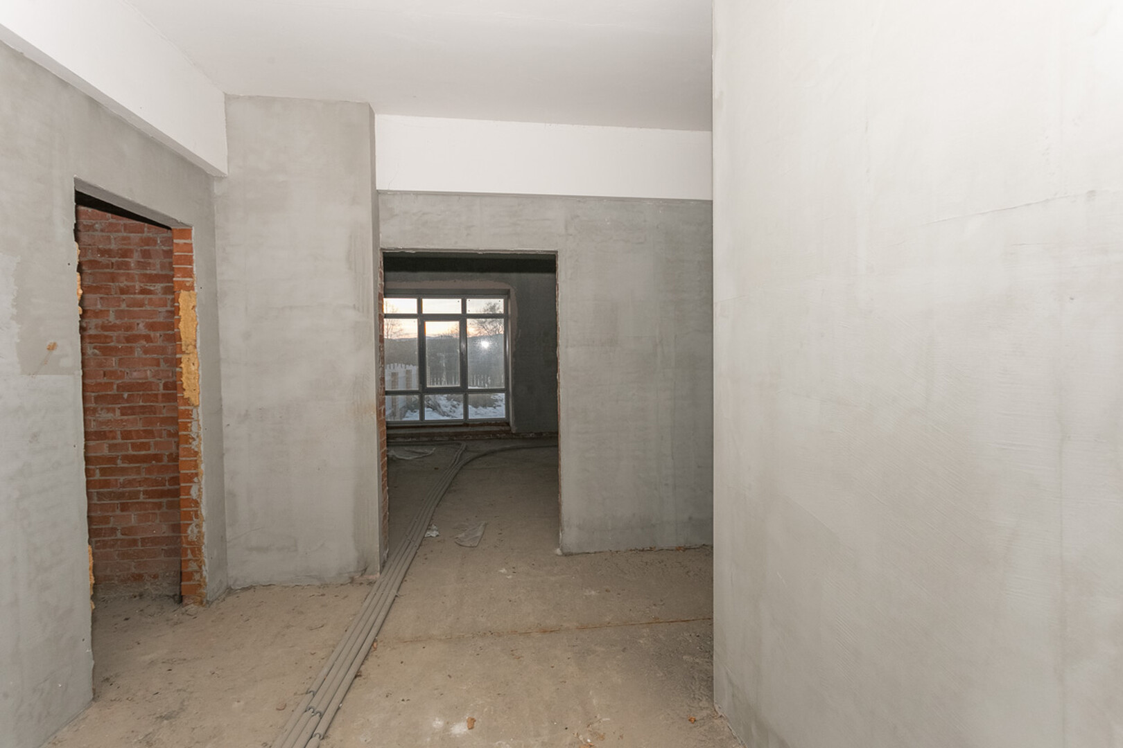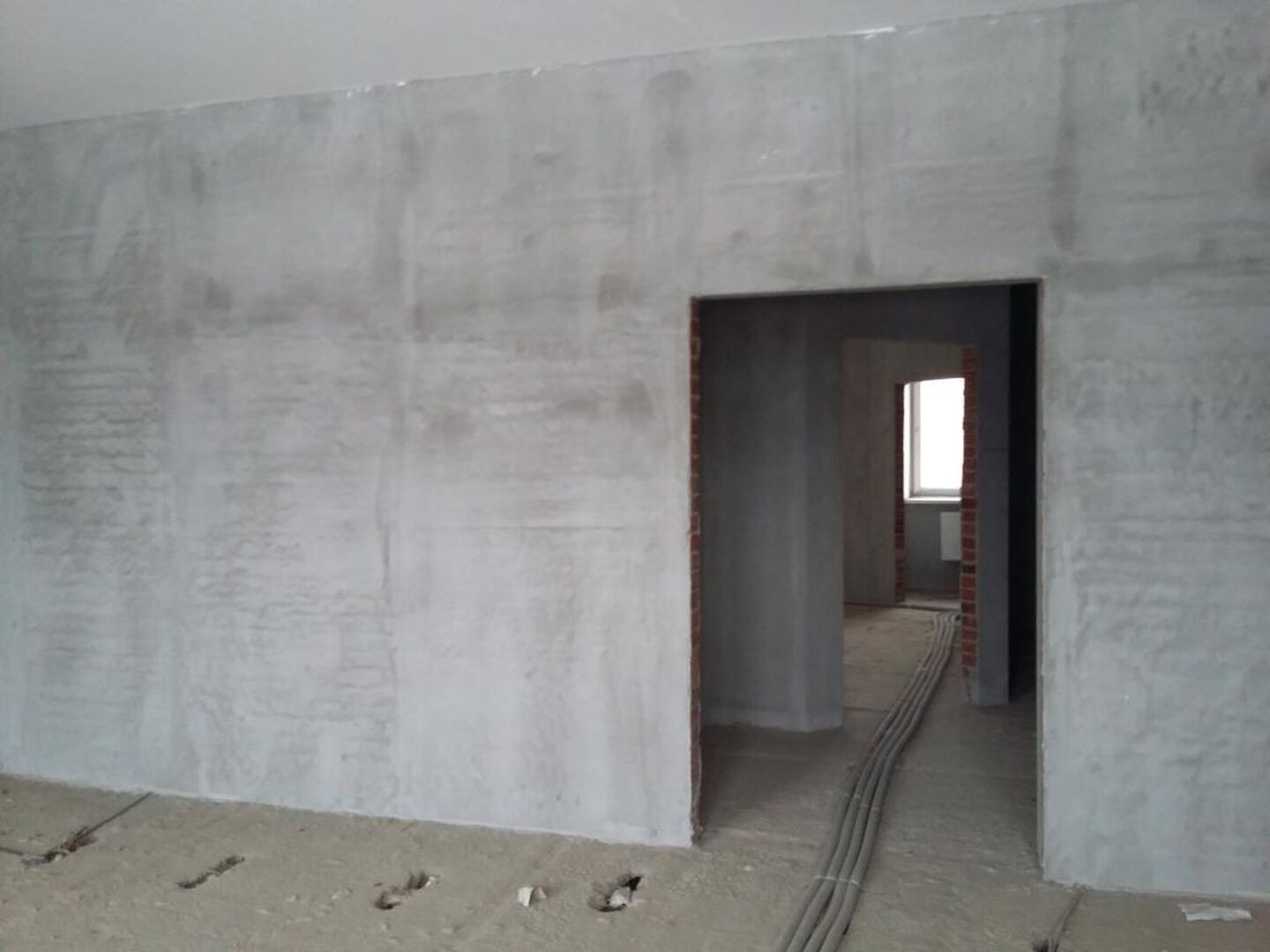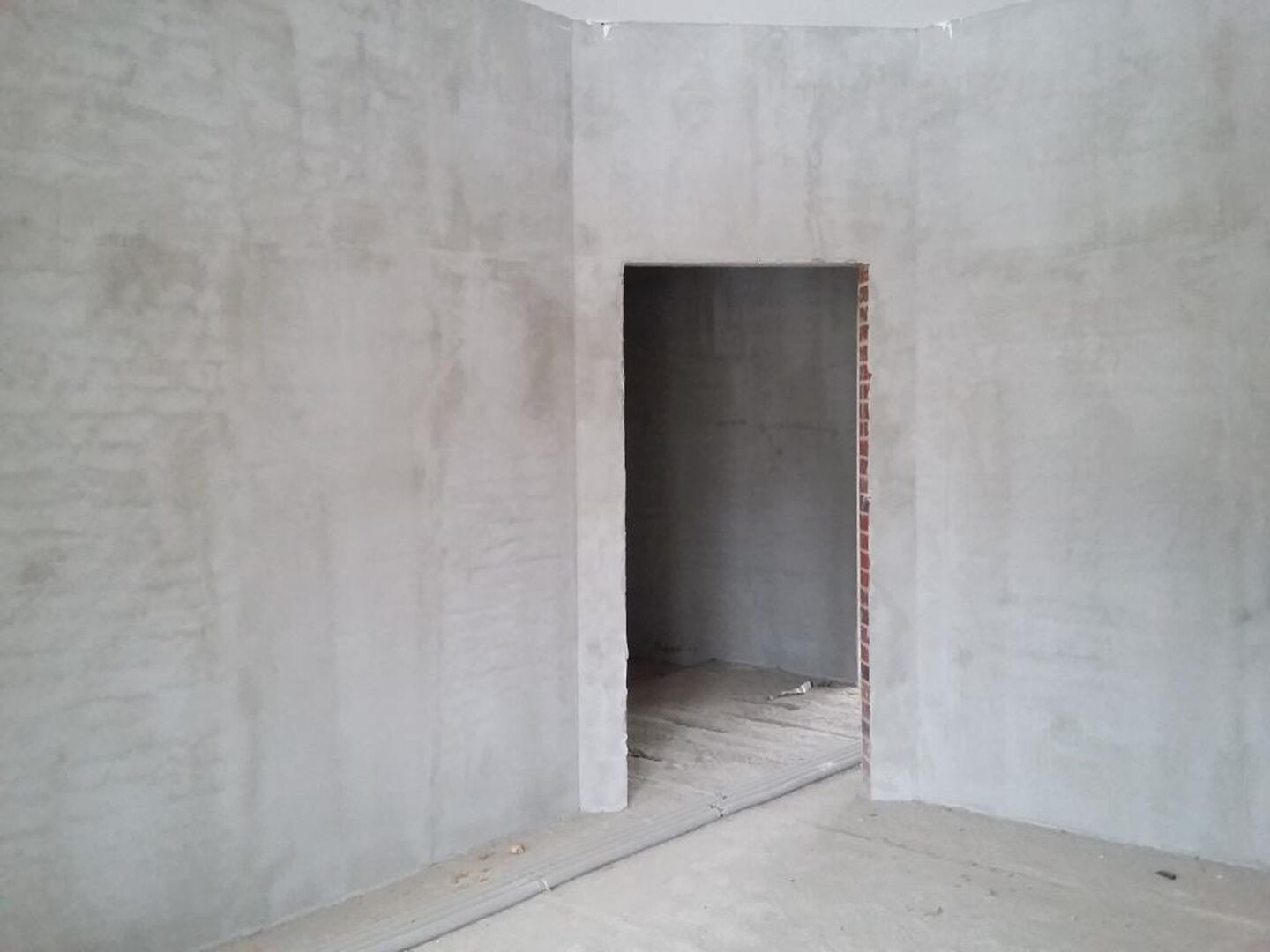 Проведены все коммуникации: газ, электричество, центральное водоснабжение, установлен котел. Стены оштукатурены.