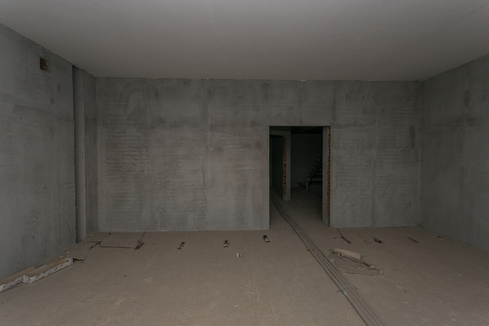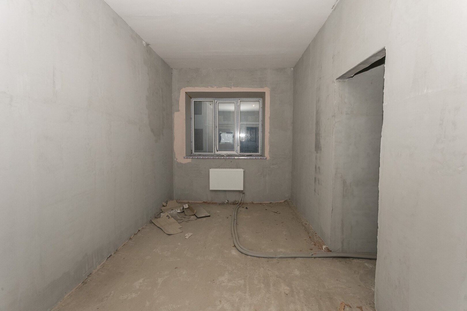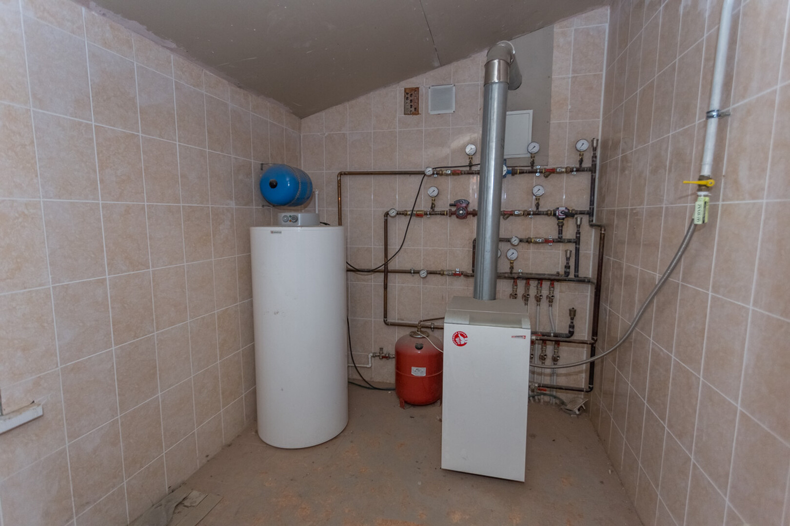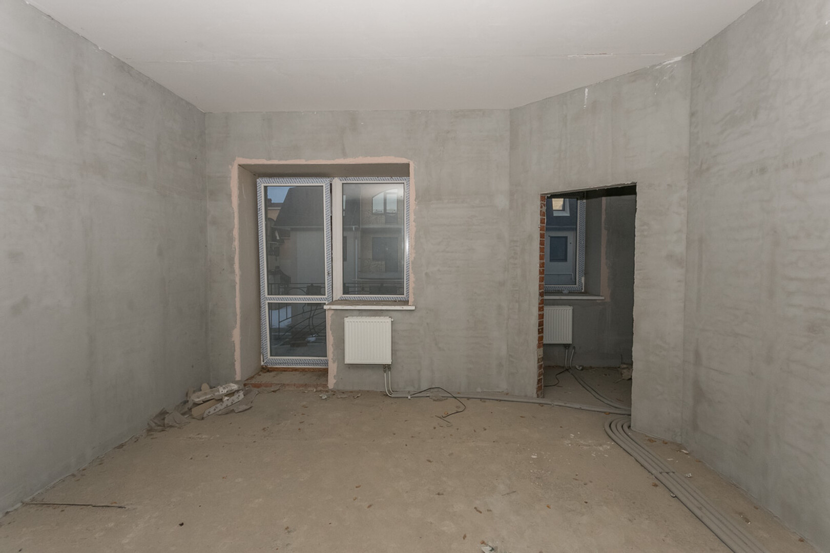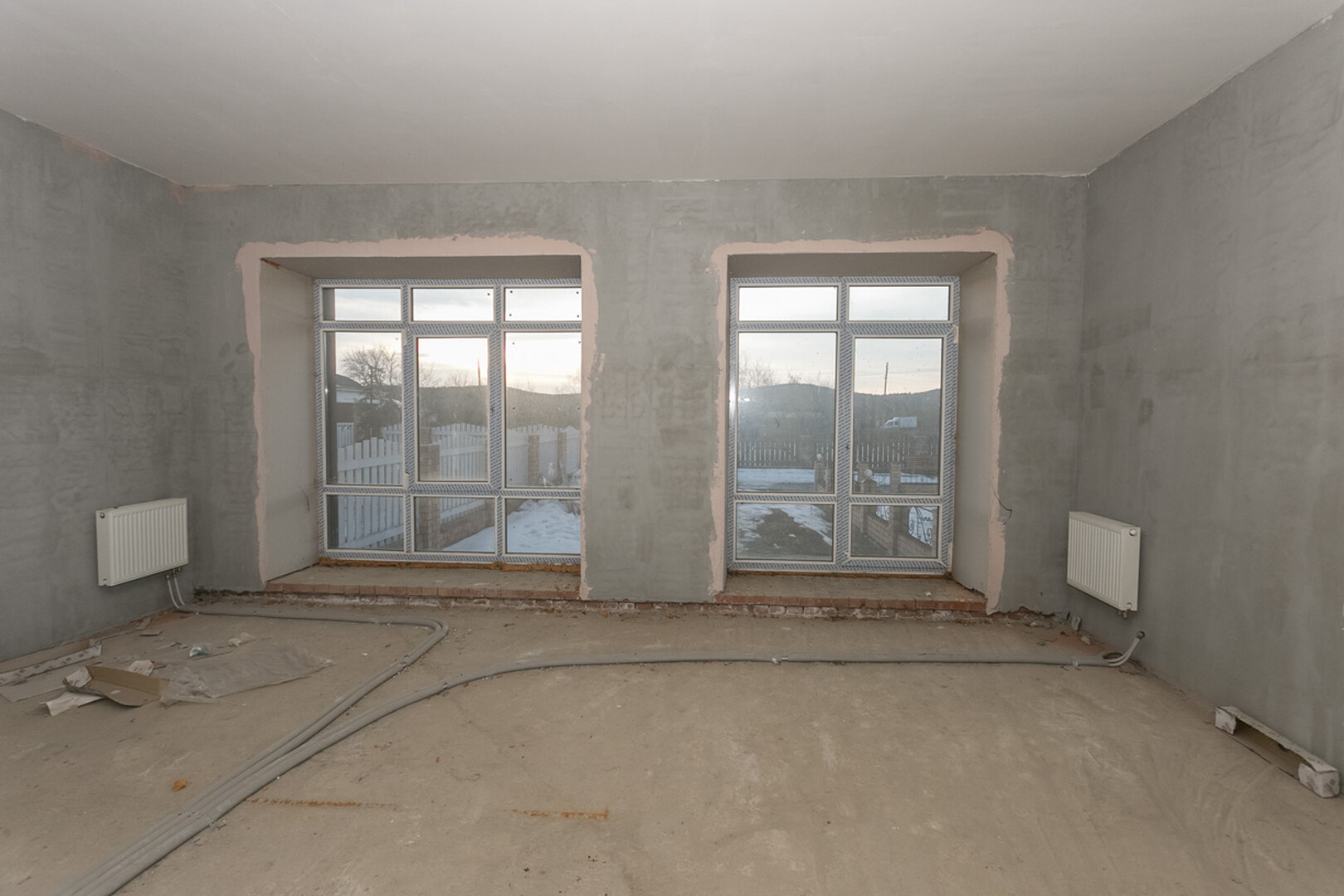 Проведены все коммуникации: газ, электричество, центральное водоснабжение, установлен котел. Стены оштукатурены.