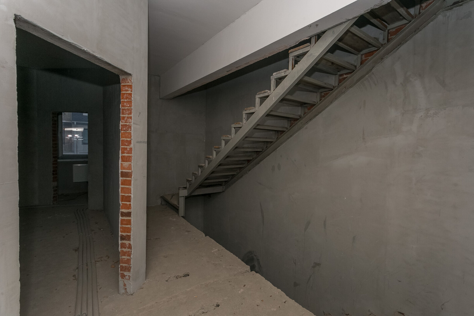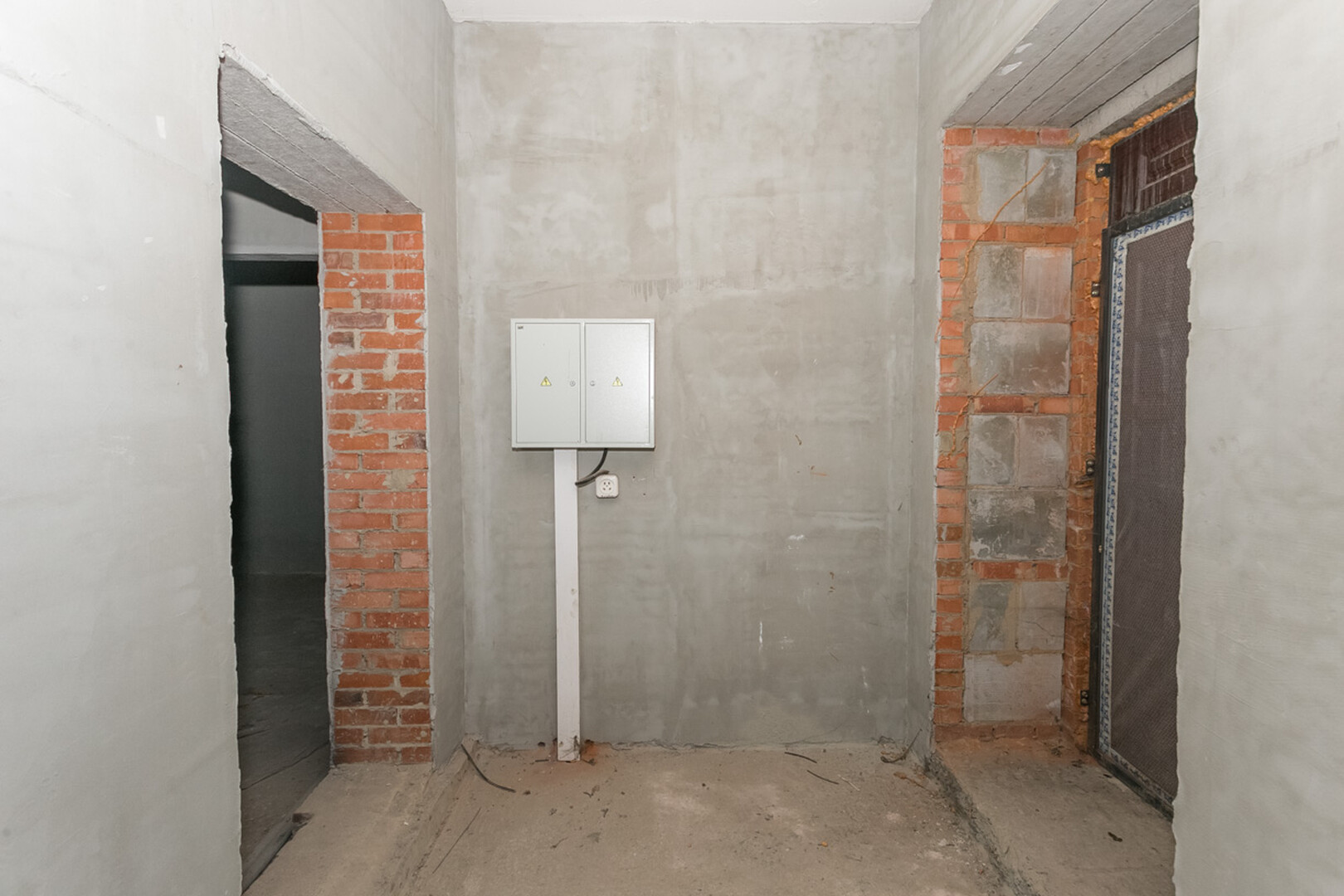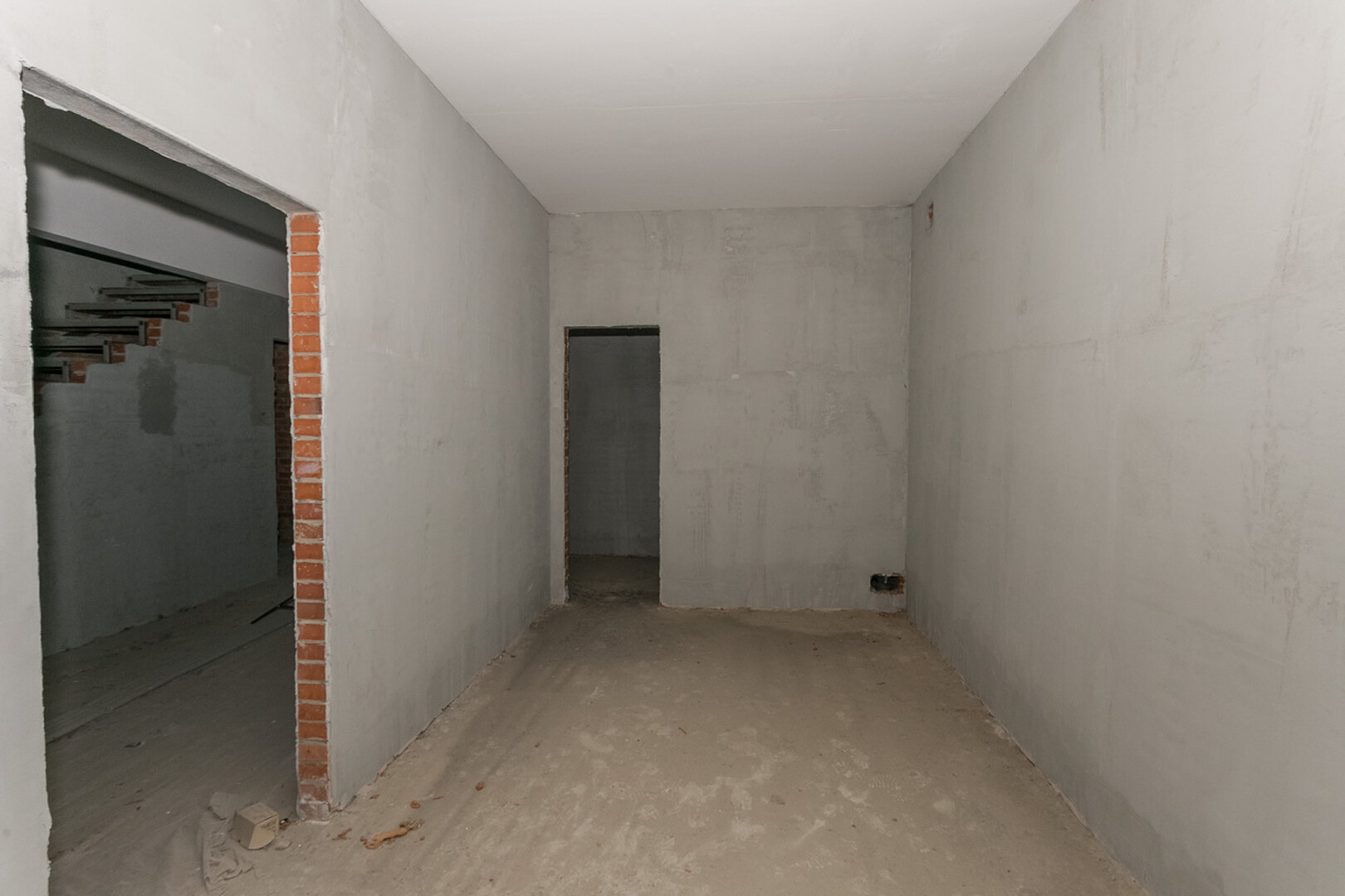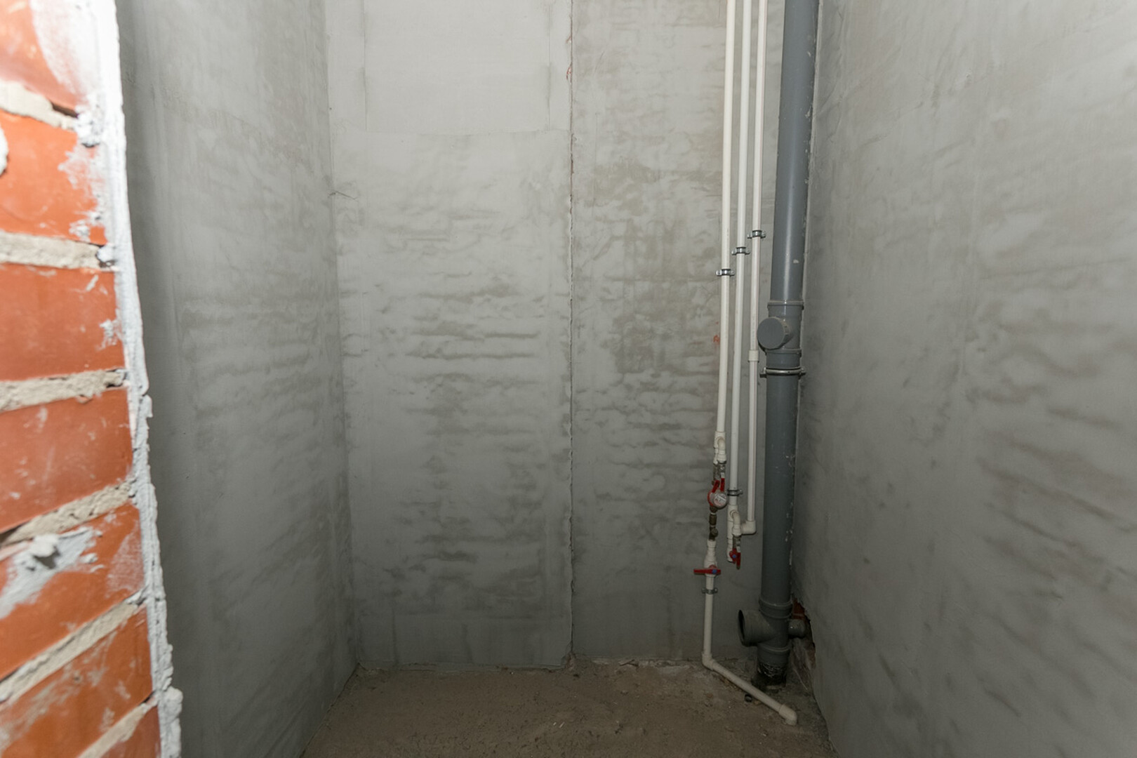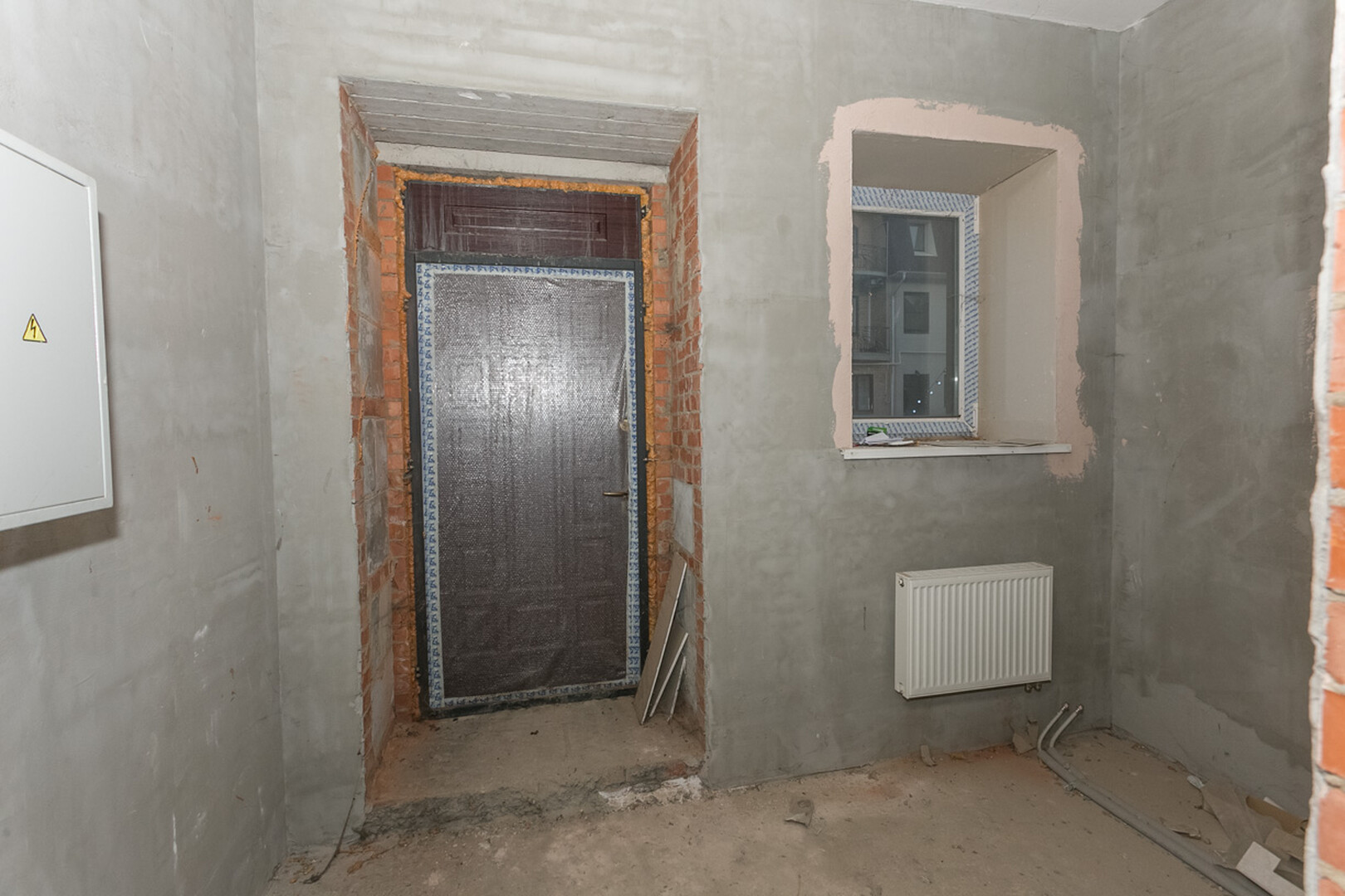 Проведены все коммуникации: газ, электричество, центральное водоснабжение, установлен котел. Стены оштукатурены.