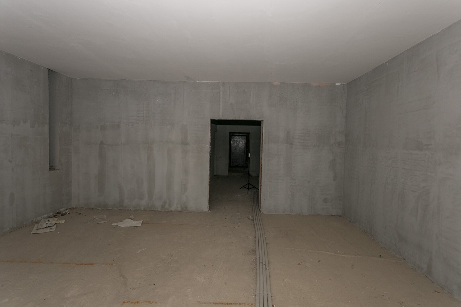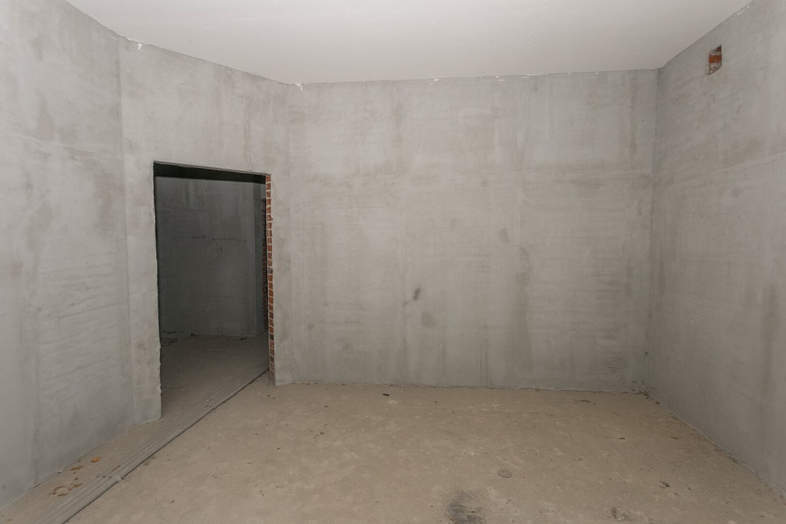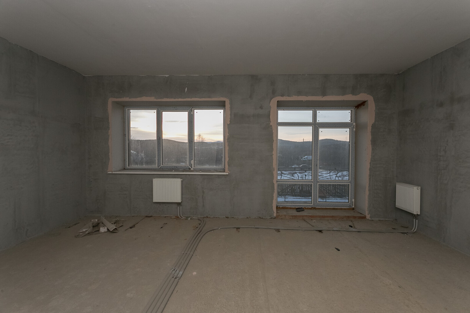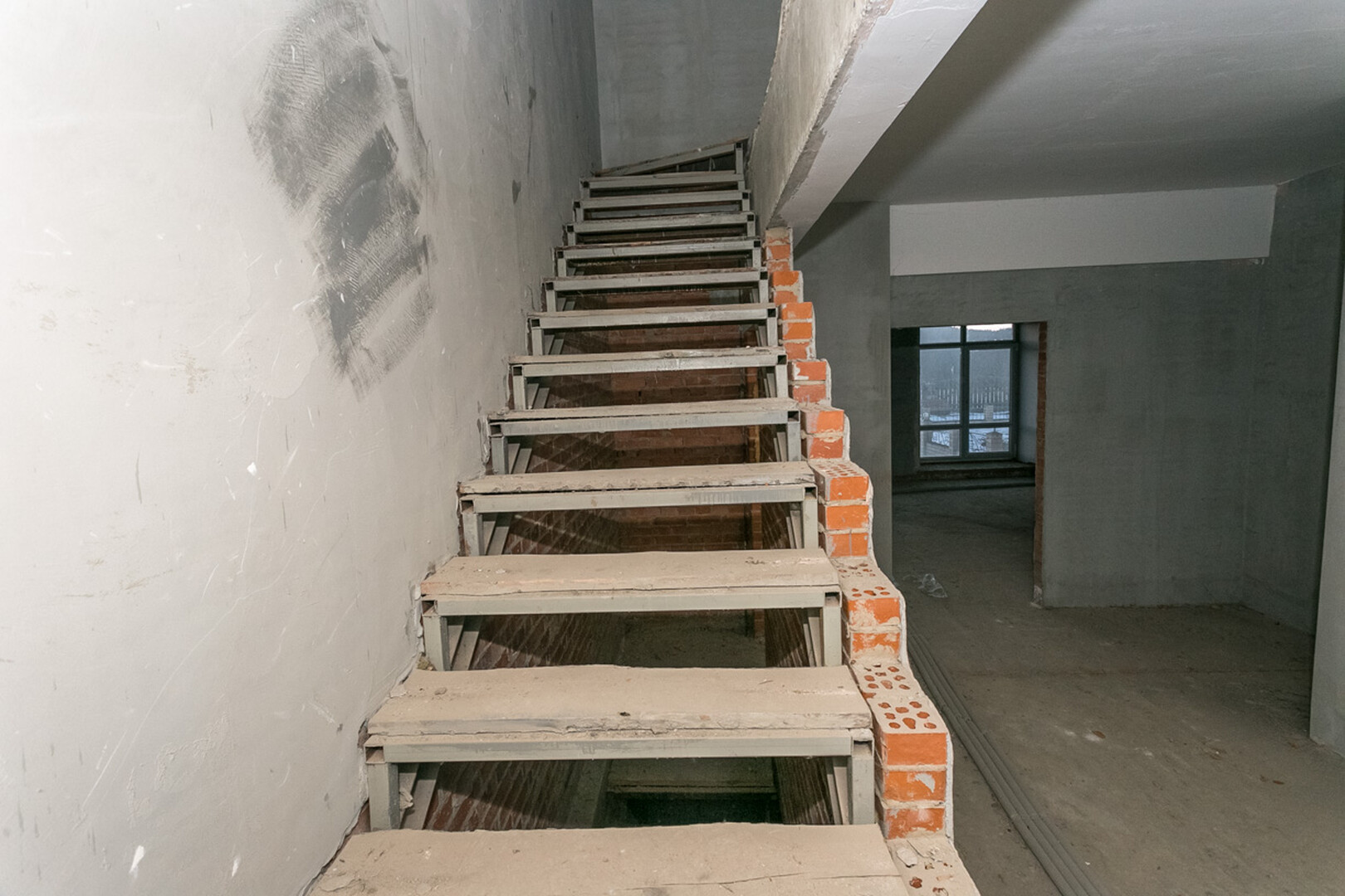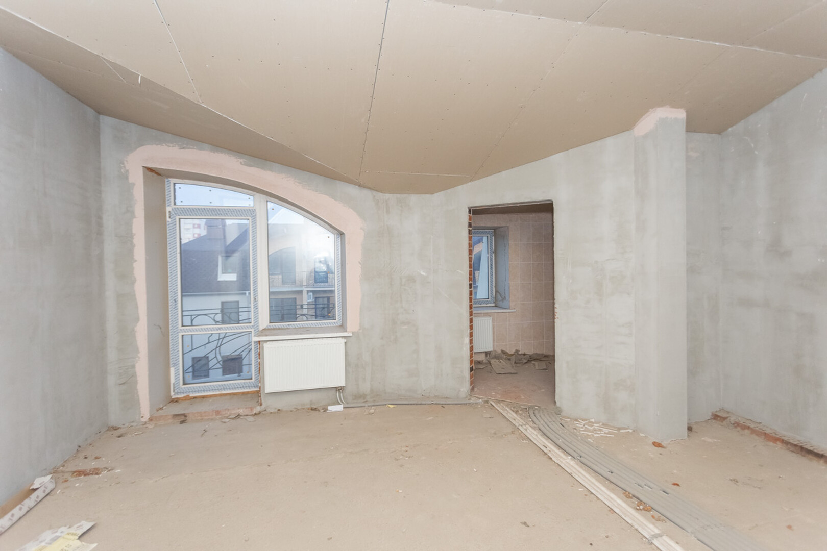 Проведены все коммуникации: газ, электричество, центральное водоснабжение, установлен котел. Стены оштукатурены.