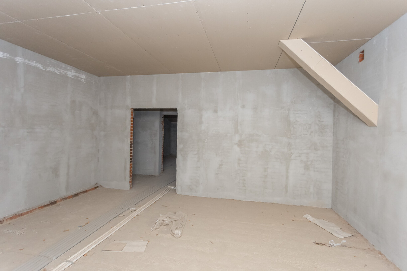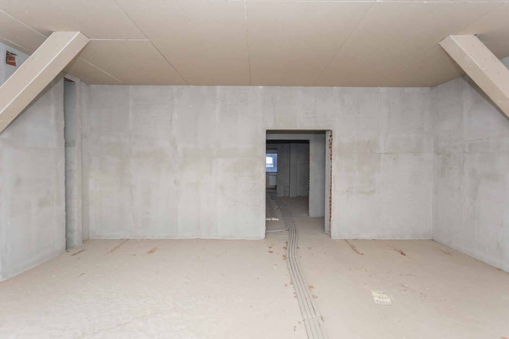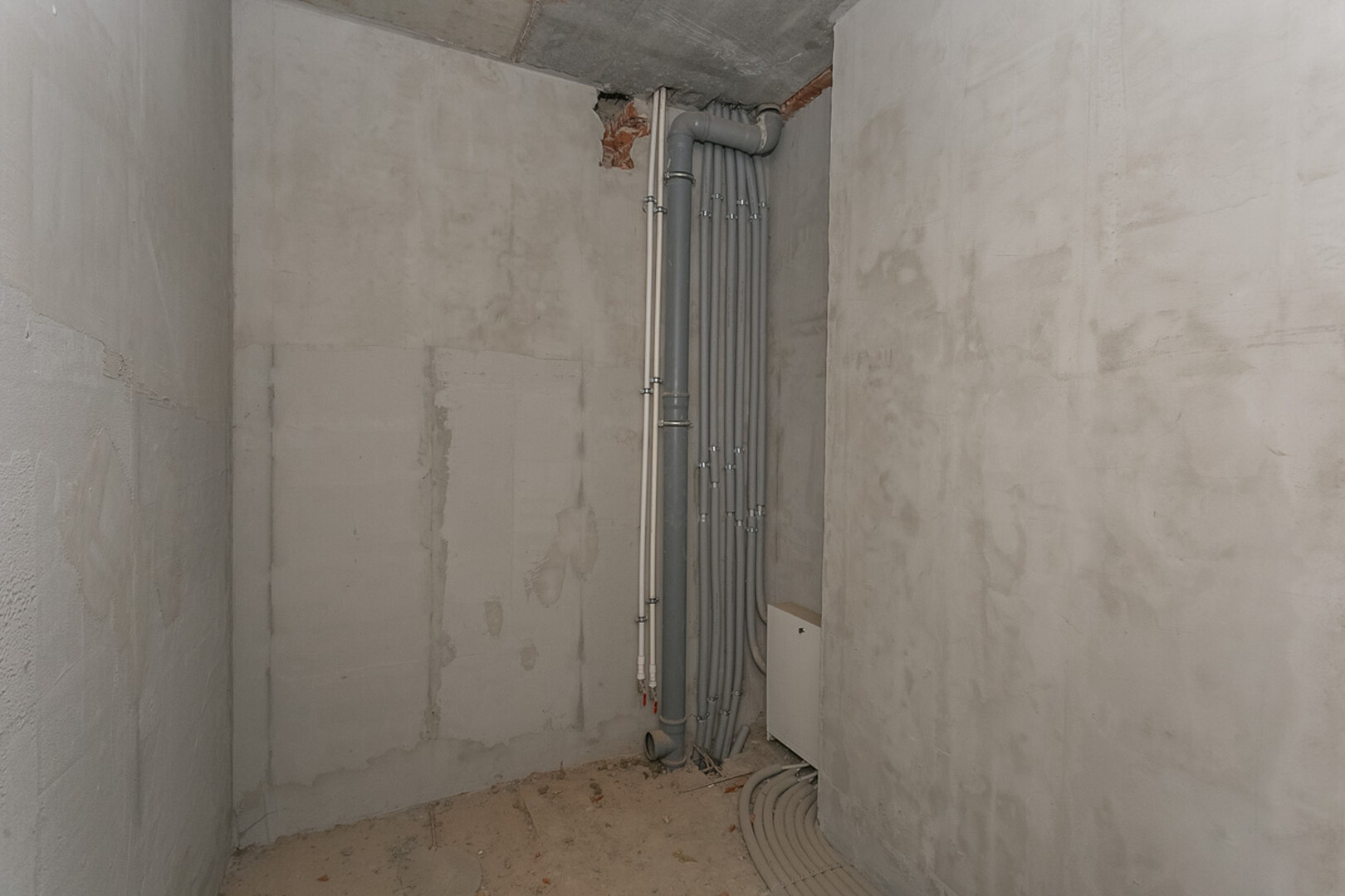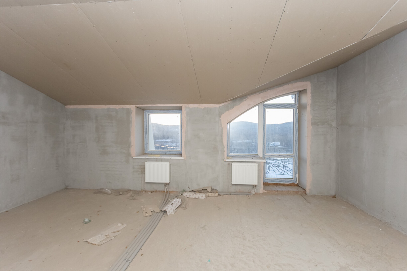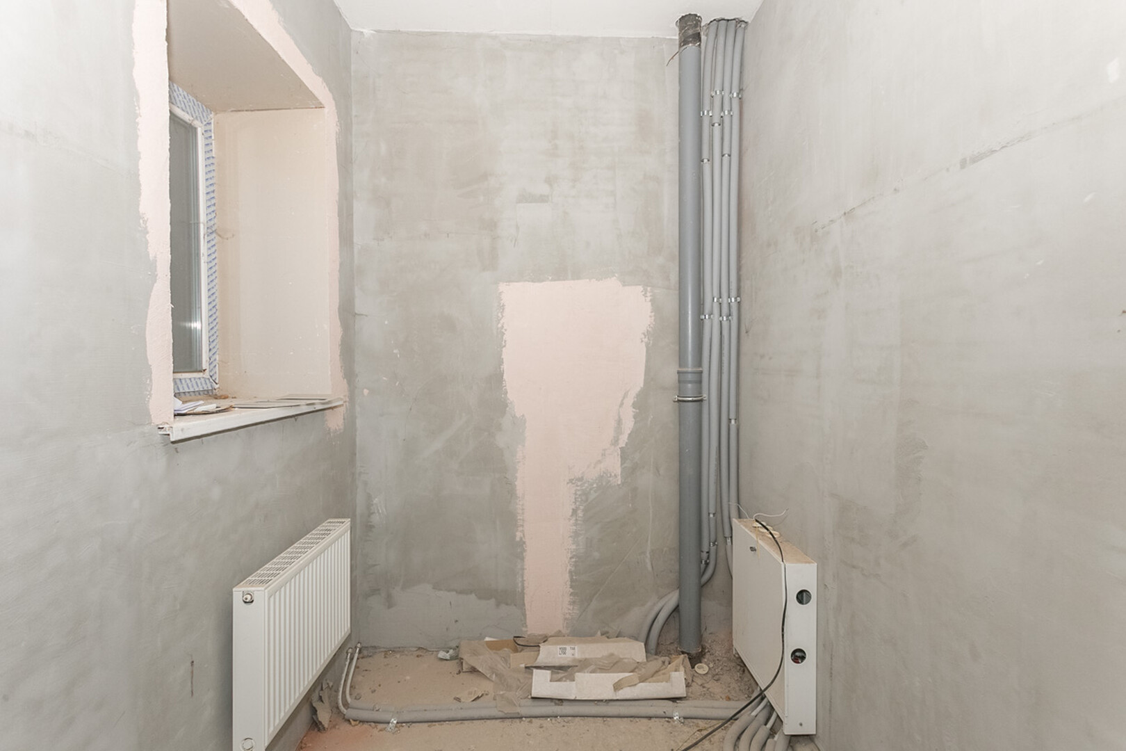 Проведены все коммуникации: газ, электричество, центральное водоснабжение, установлен котел. Стены оштукатурены.