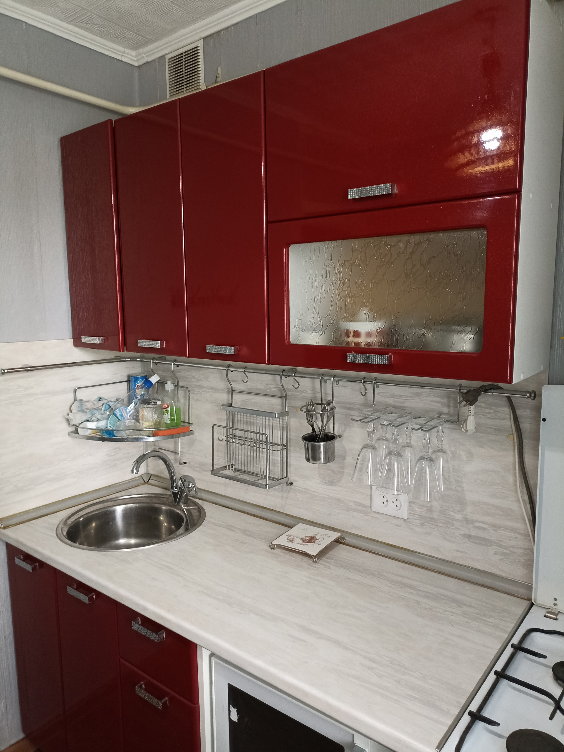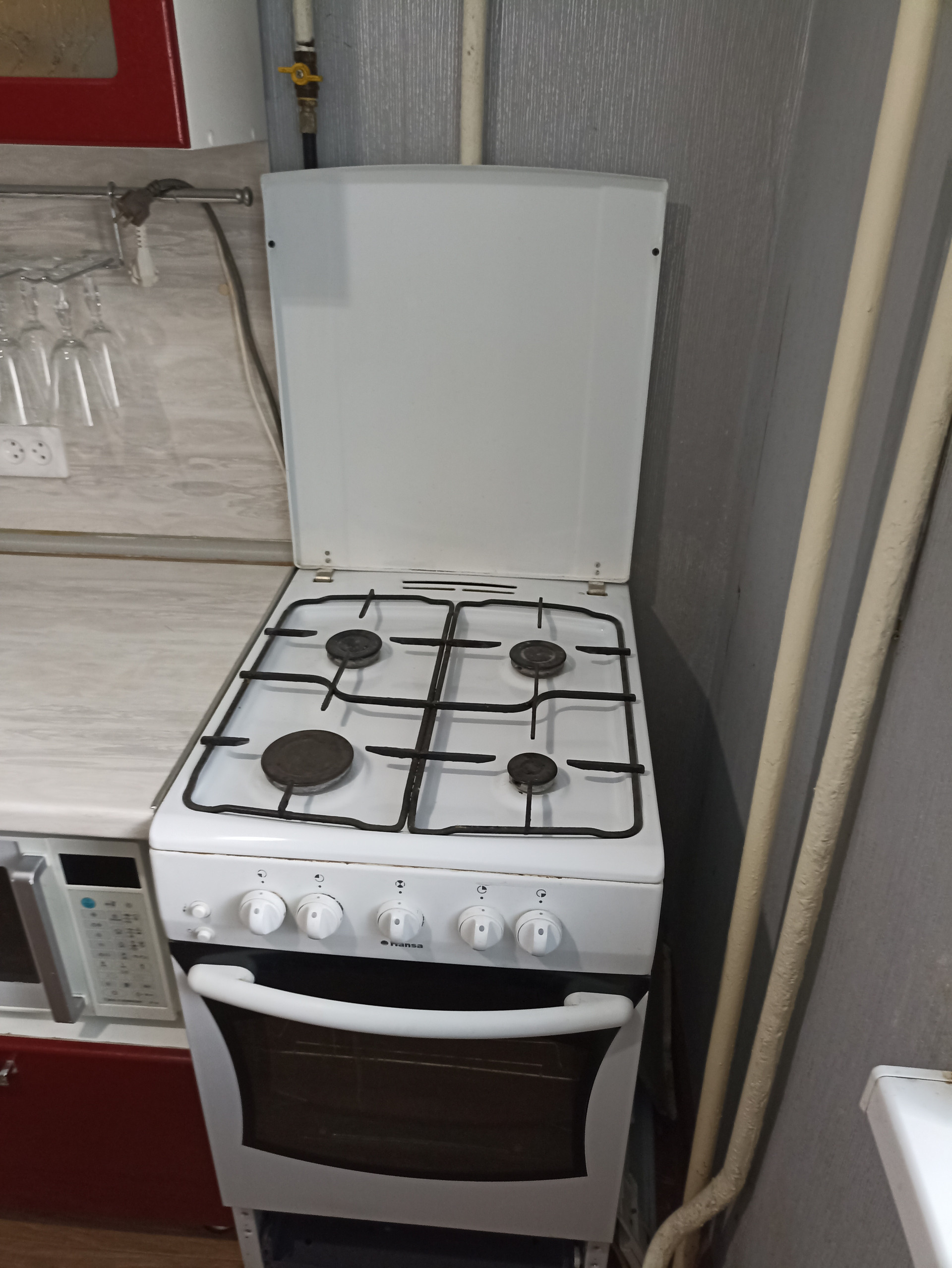 Квартира полностью укомплектована мебелью и техникой: диван, угловой шкаф в комнате и шкаф в прихожей, министенка, кухонный гарнитур, холодильник Indesit, газовая плита Hansa, стиральная машинка Whirlpool, микроволновка, телевизор, а также посуда.