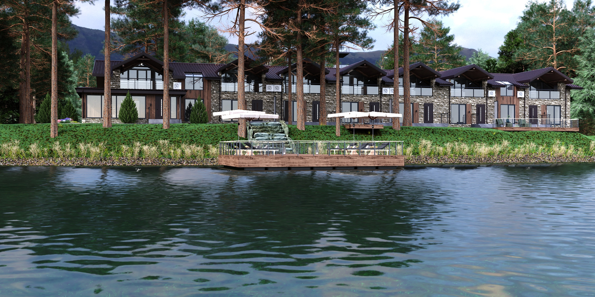 Двухэтажный корпус на берегу озера с двухуровневыми апартаментами, имеющими видовую террасу, отдельный вход, обустроенную территорию отдыха около дома, доступ на отдельный понтон. Планировочное решение спланировано так, чтобы каждый апартамент имел вид на озеро либо с первого, либо со второго этажа. Площадь апартаментов от 55 кв.м.
