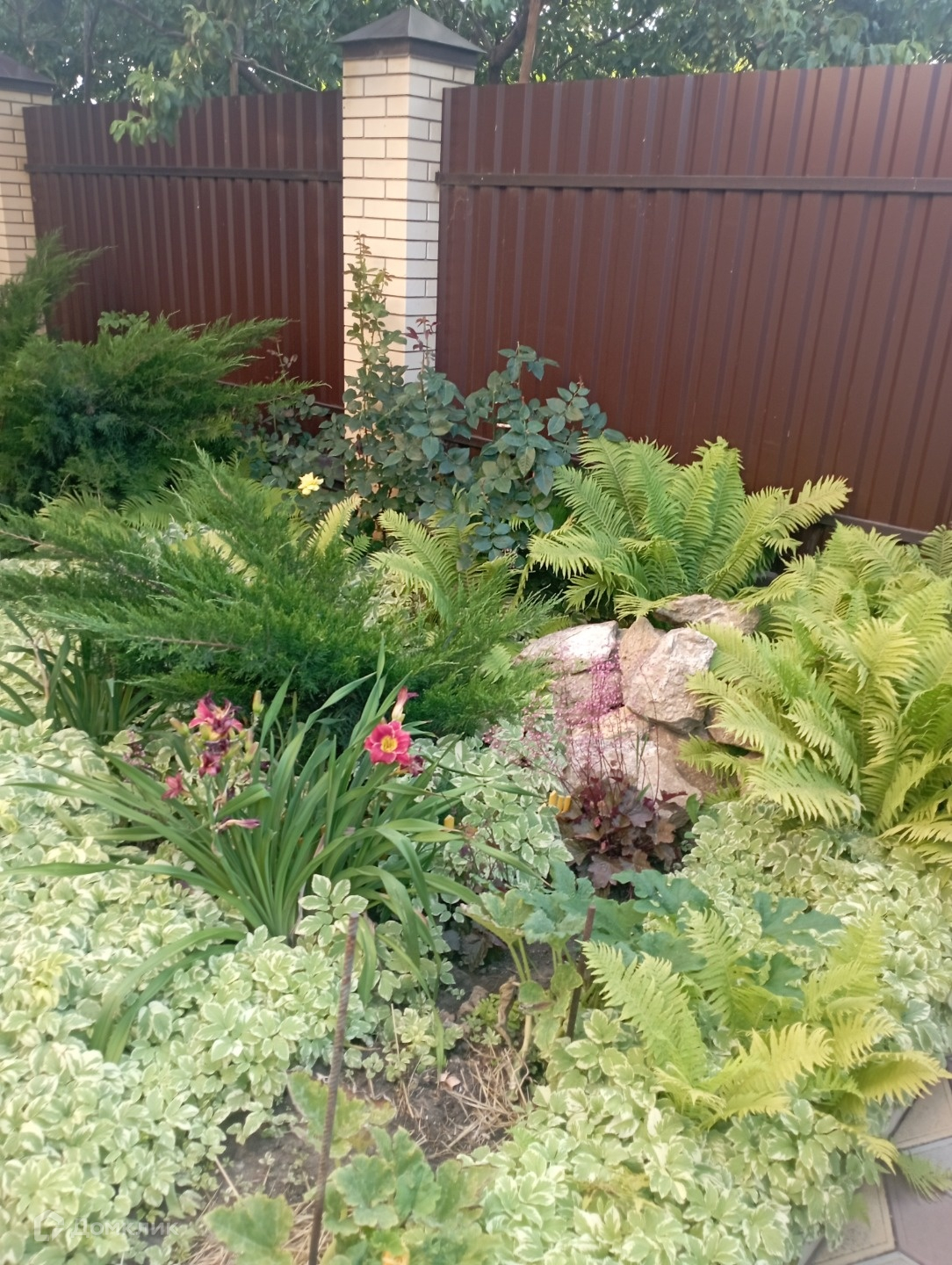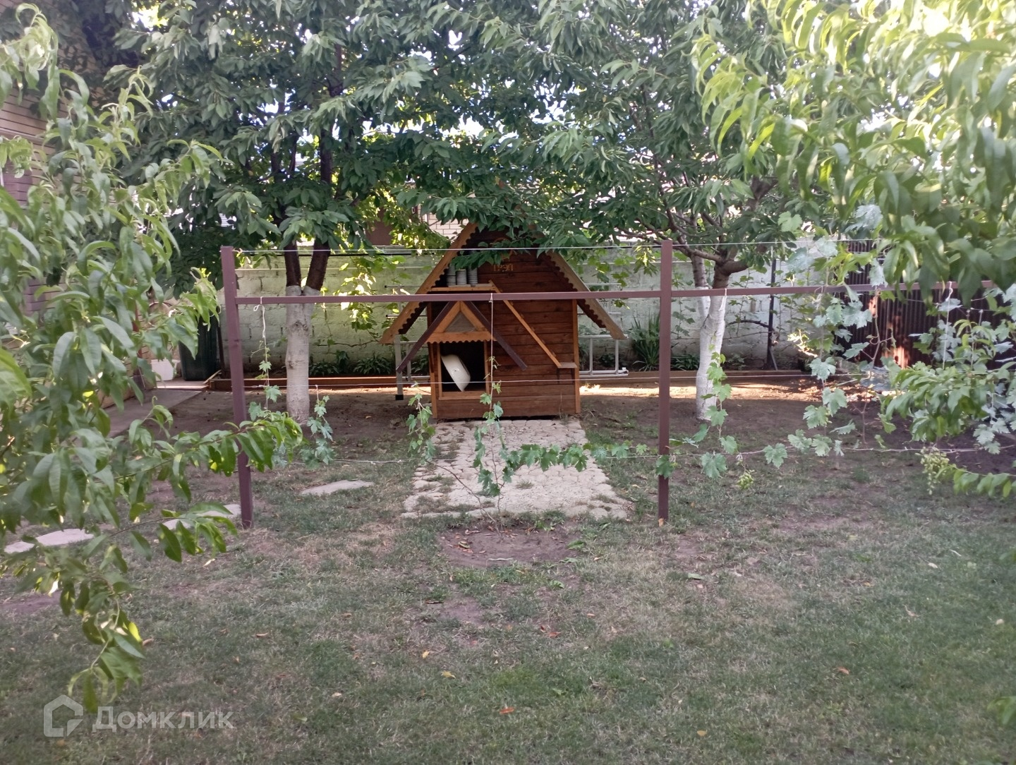 Во дворе много цветов, различных растений, небольшой сад и огород. Большая будка для собаки, садовые качели.