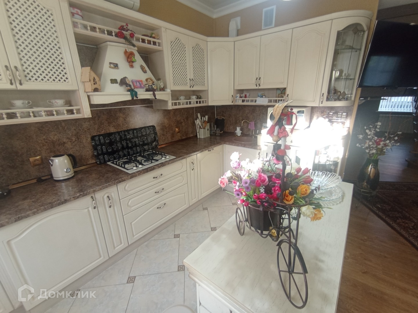 На кухне: варочная панель и духовой шкаф GORENIE, декоративный камин с нишей для кухонных мелочей, мягкая мебель и обеденная группа.
