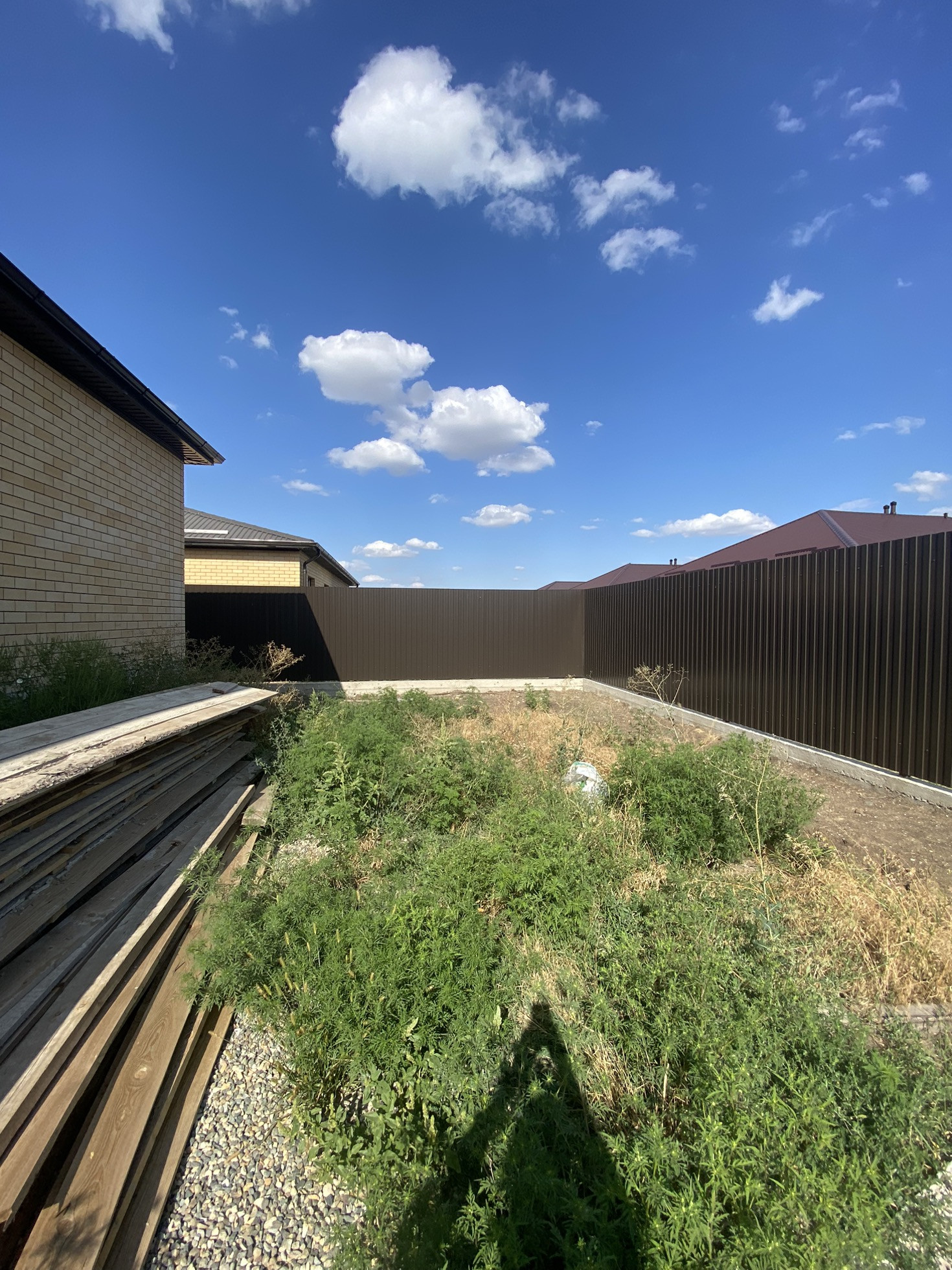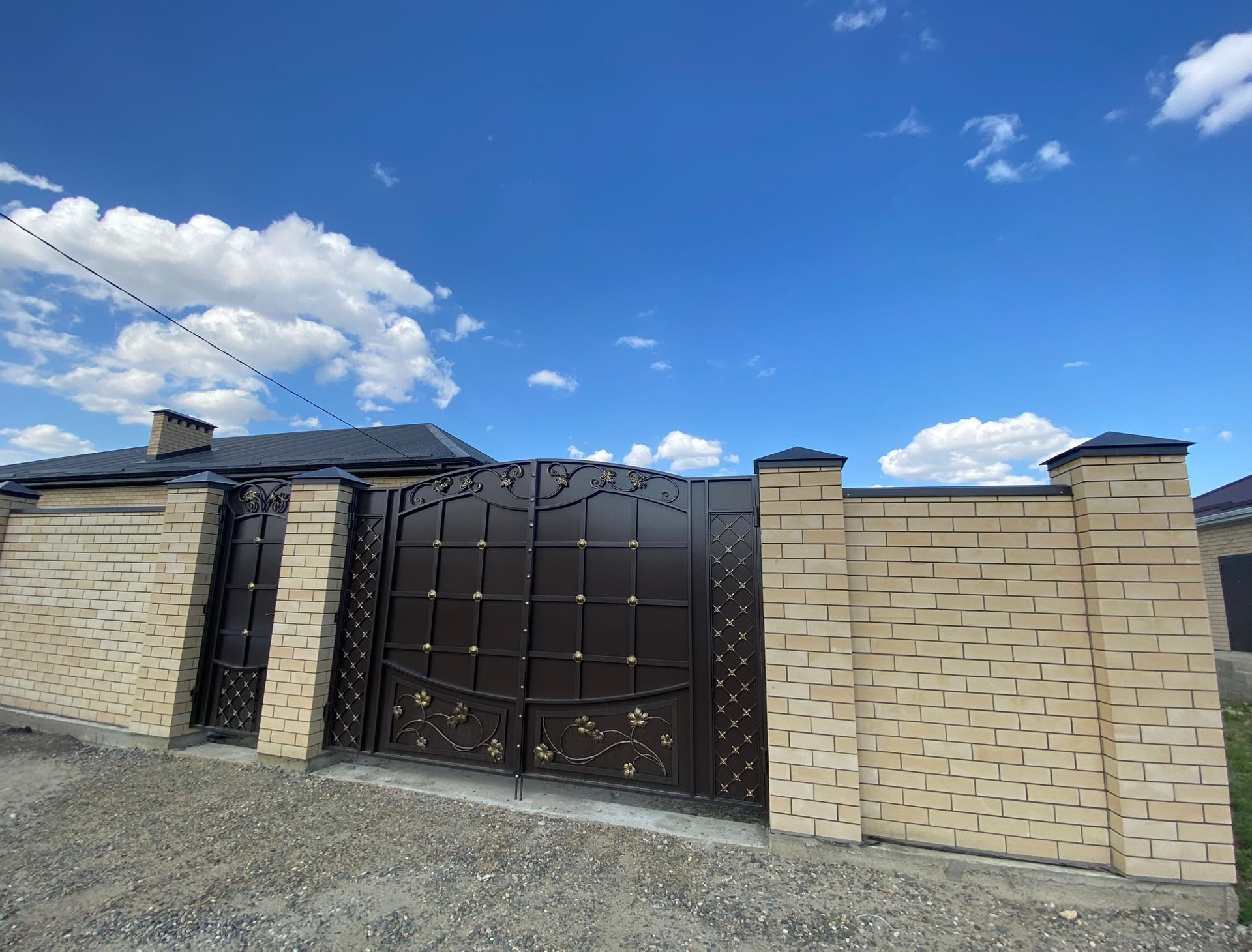 ОГОРОЖЕН. ВПЕРЕДИ КИРПИЧНЫЙ ЗАБОР И ВОРОТА.