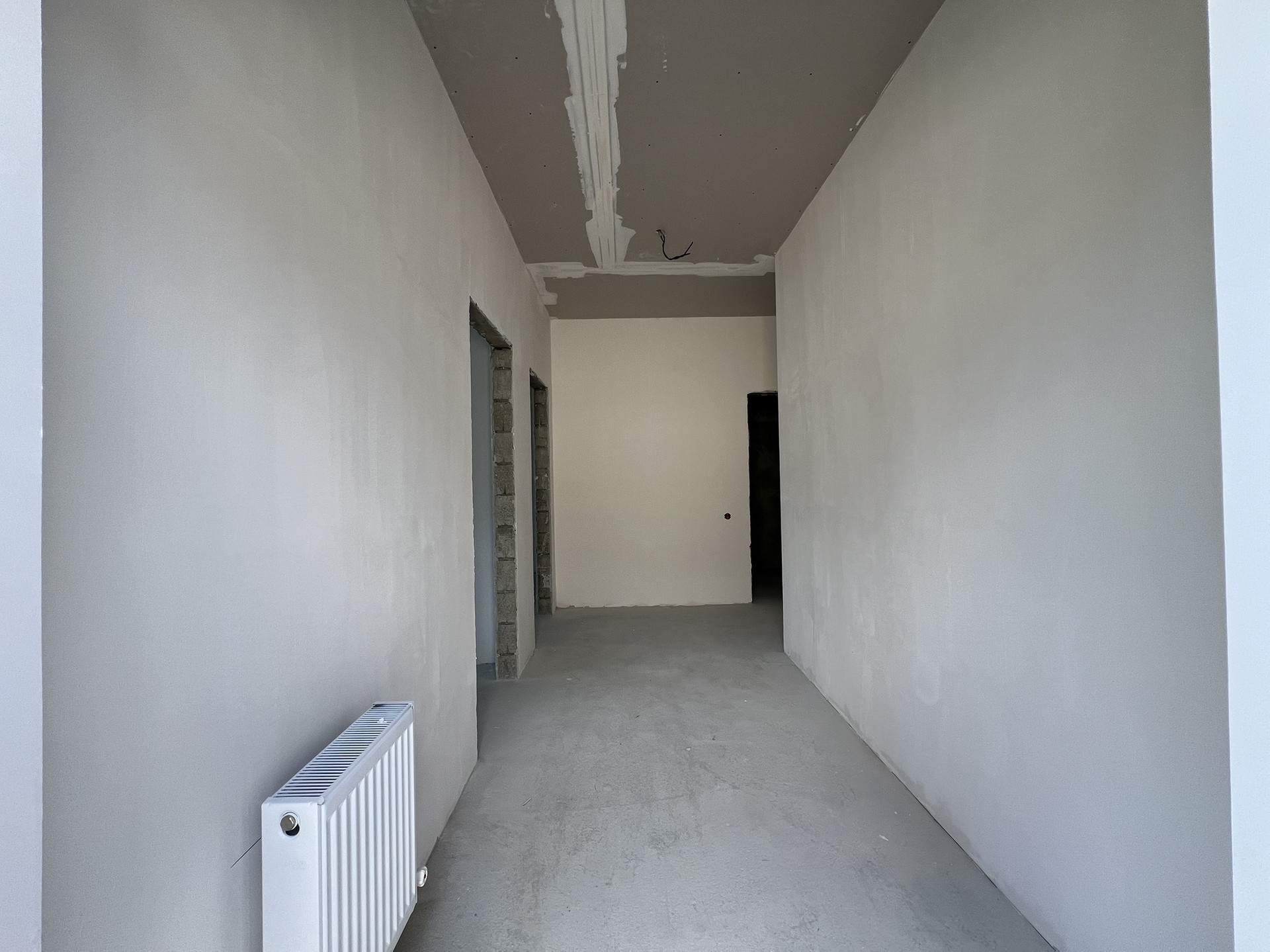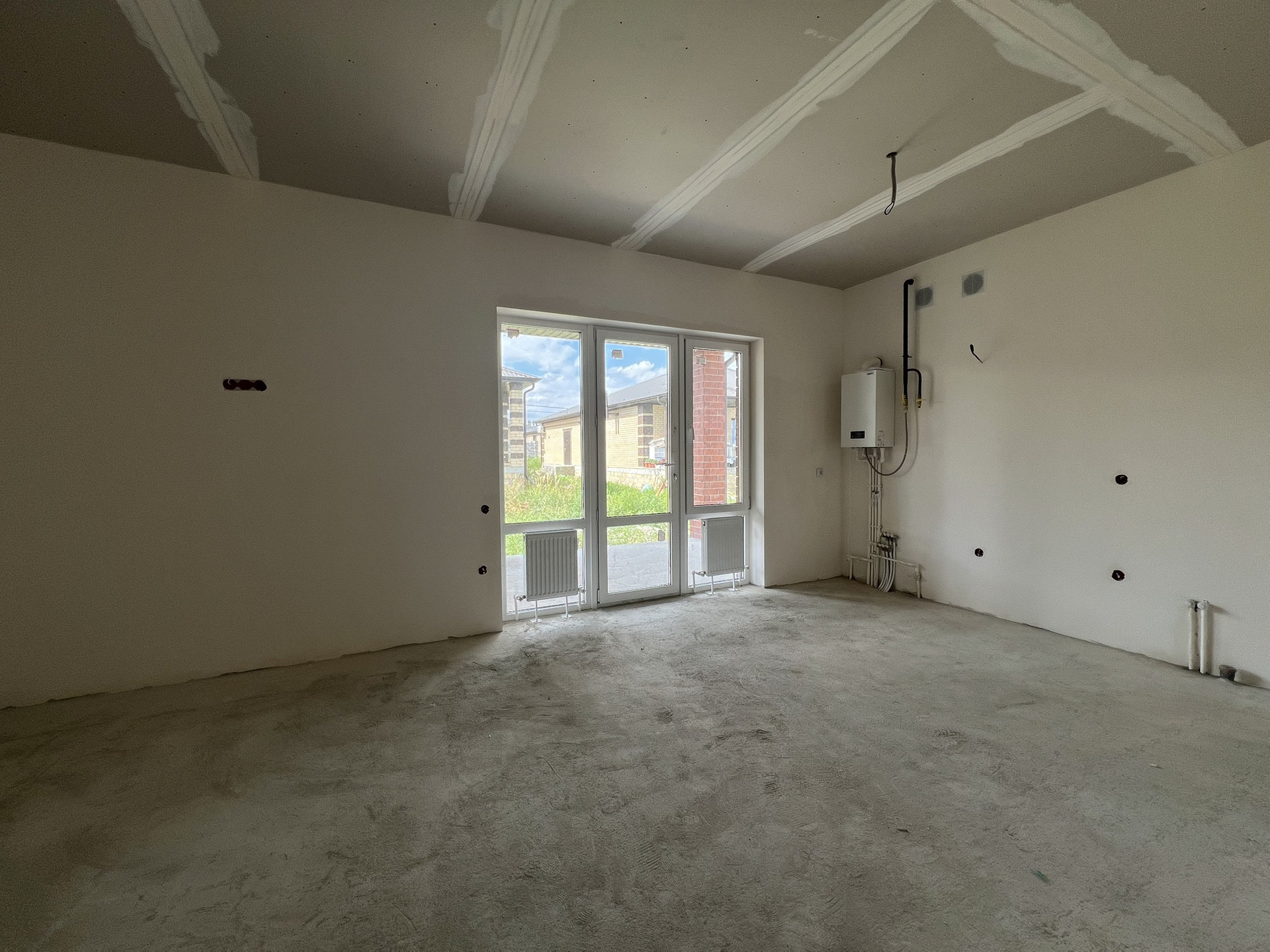 В коттедже установлены радиаторы отопления, котел-колонка . Теплые полы везде кроме спален, стяжка, штукатурка, разводка электрики.