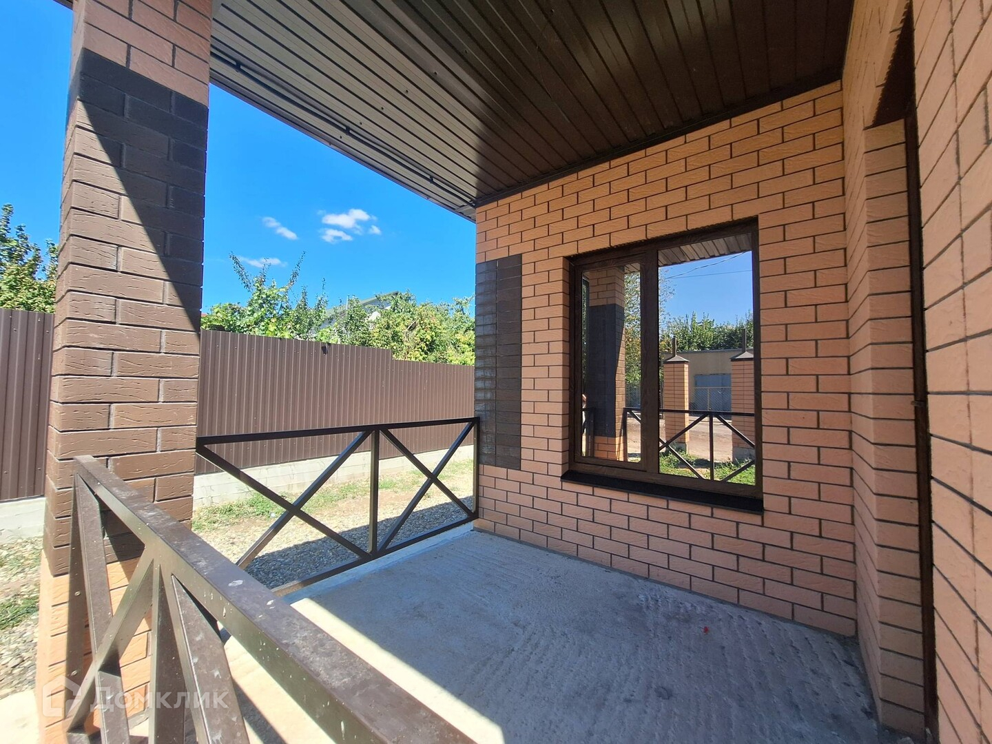 - Фасад с кирпичными колоннами и штакетником