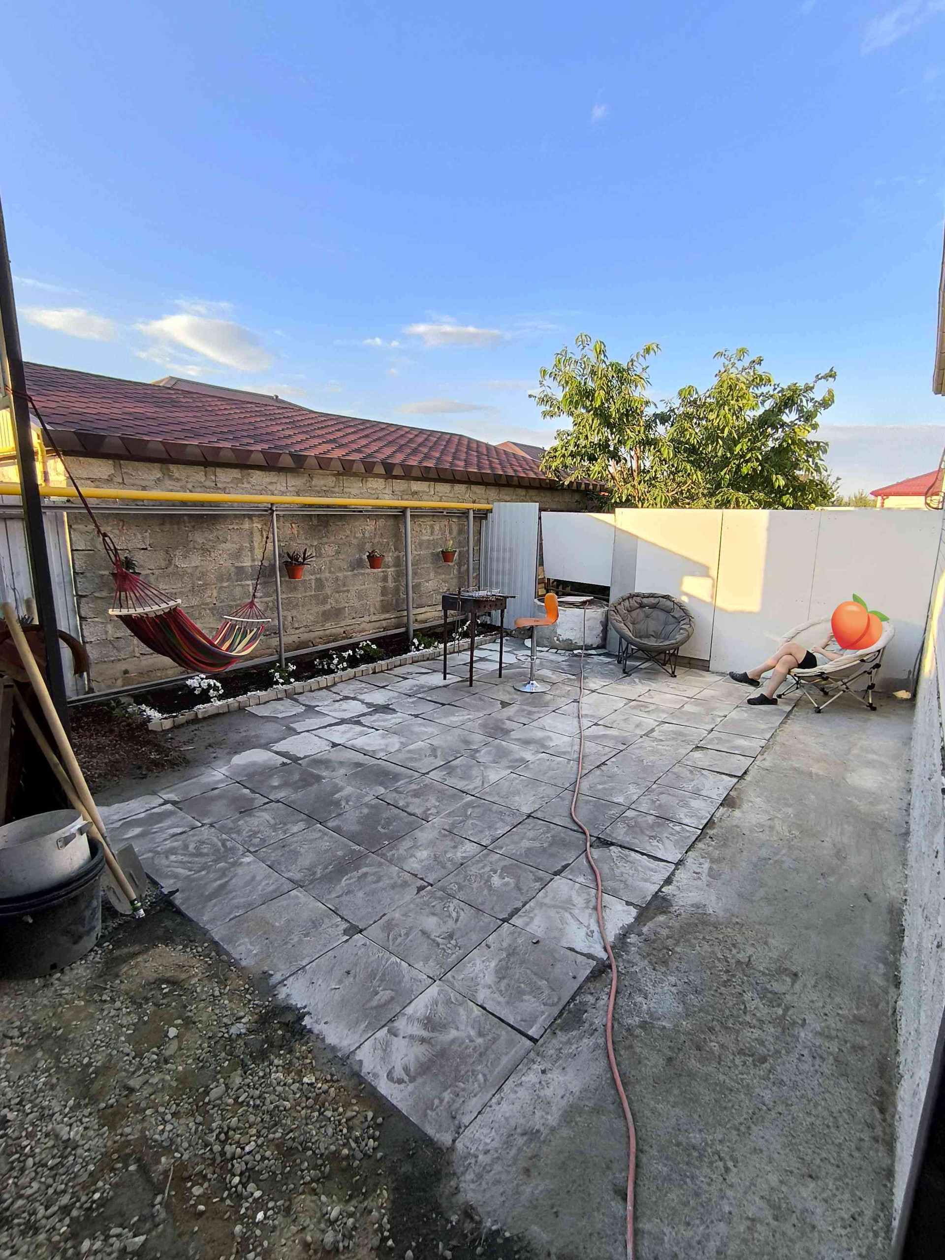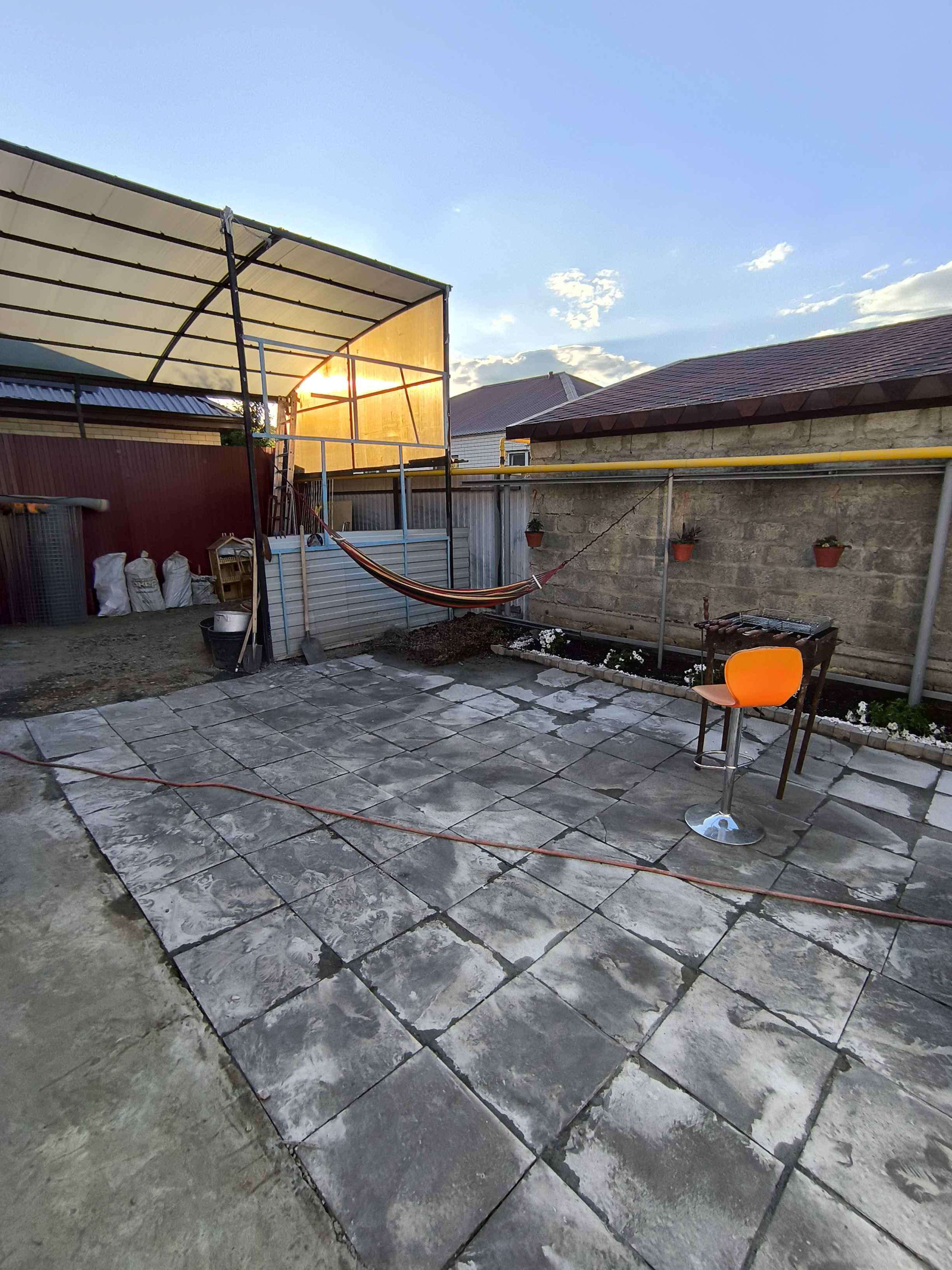 Сзади двора обустроена зона отдыха с мангалом и гамаком.