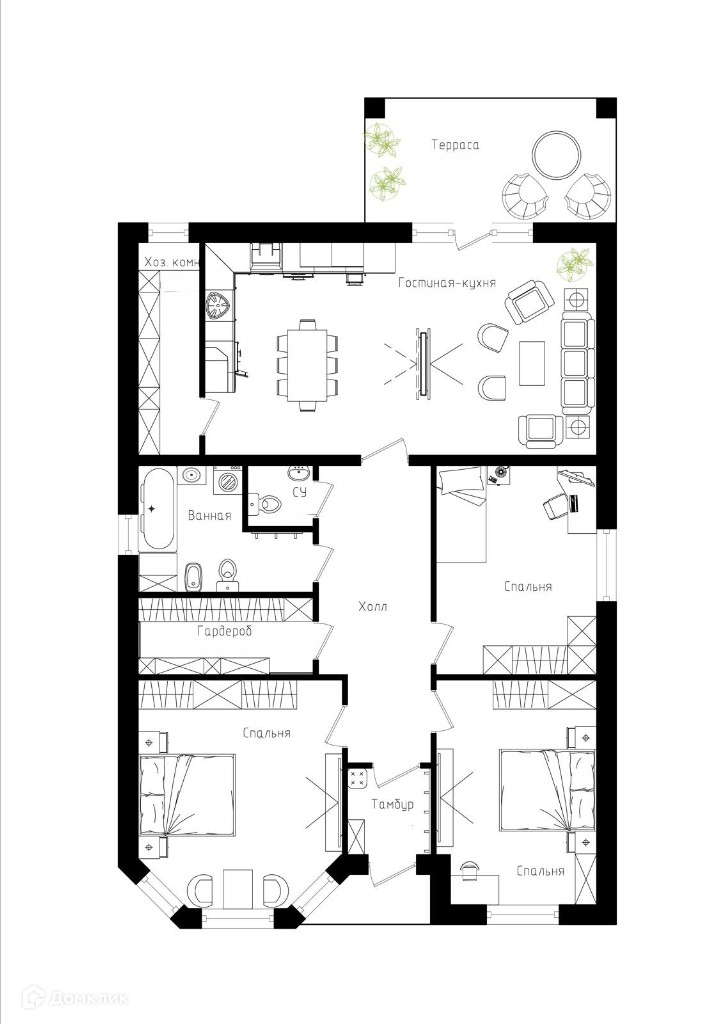 3 изолированные комнаты, раздельный с/у, гардеробная, котельная, просторная кухня-гостиная с выходом на террасу.