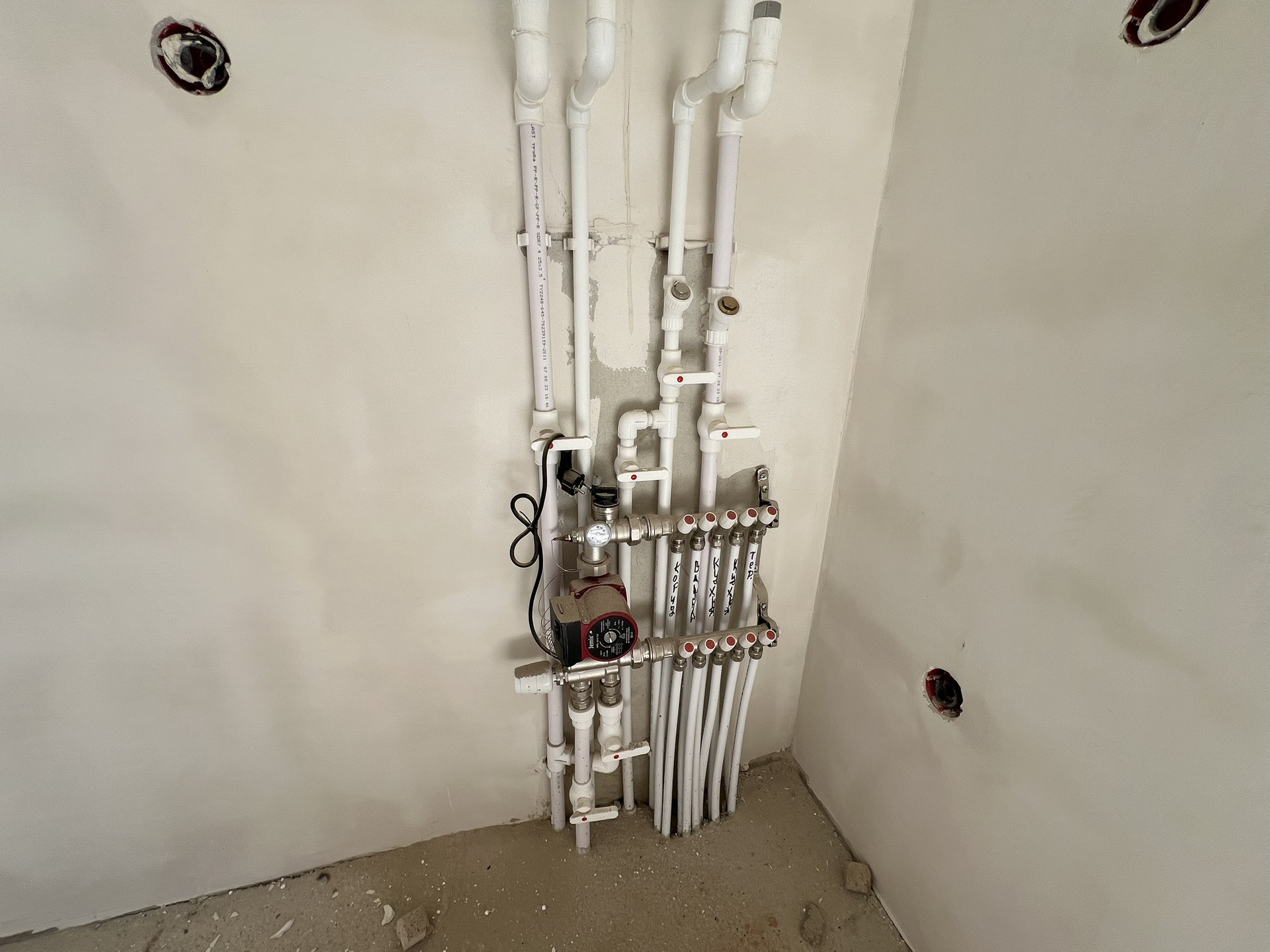 В коттедже установлены радиаторы отопления, котел-колонка . Теплые полы везде кроме спален, стяжка, штукатурка,, разводка электрики.