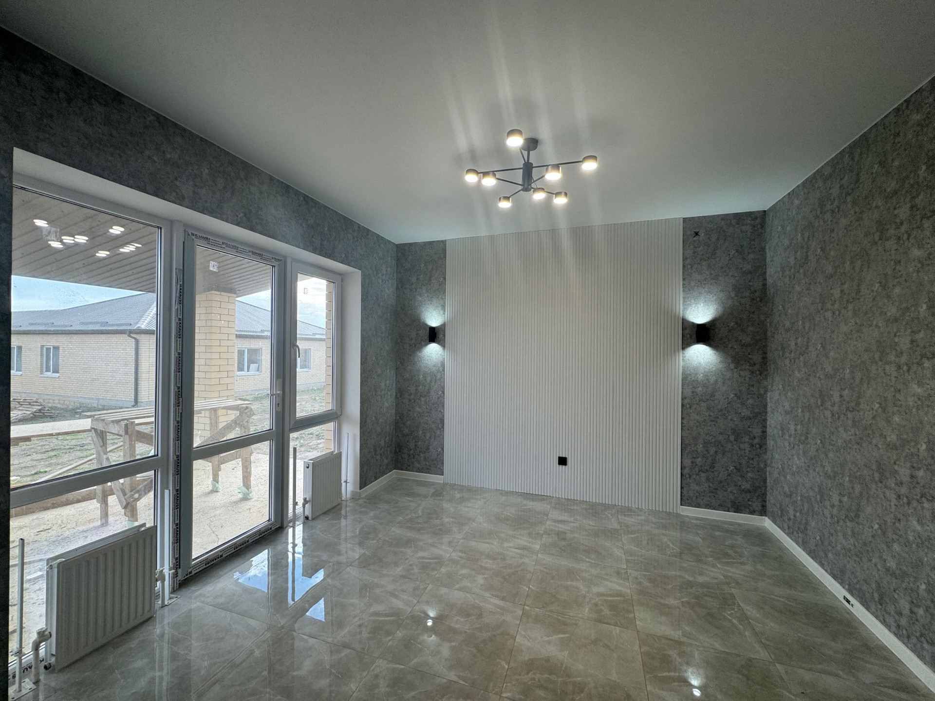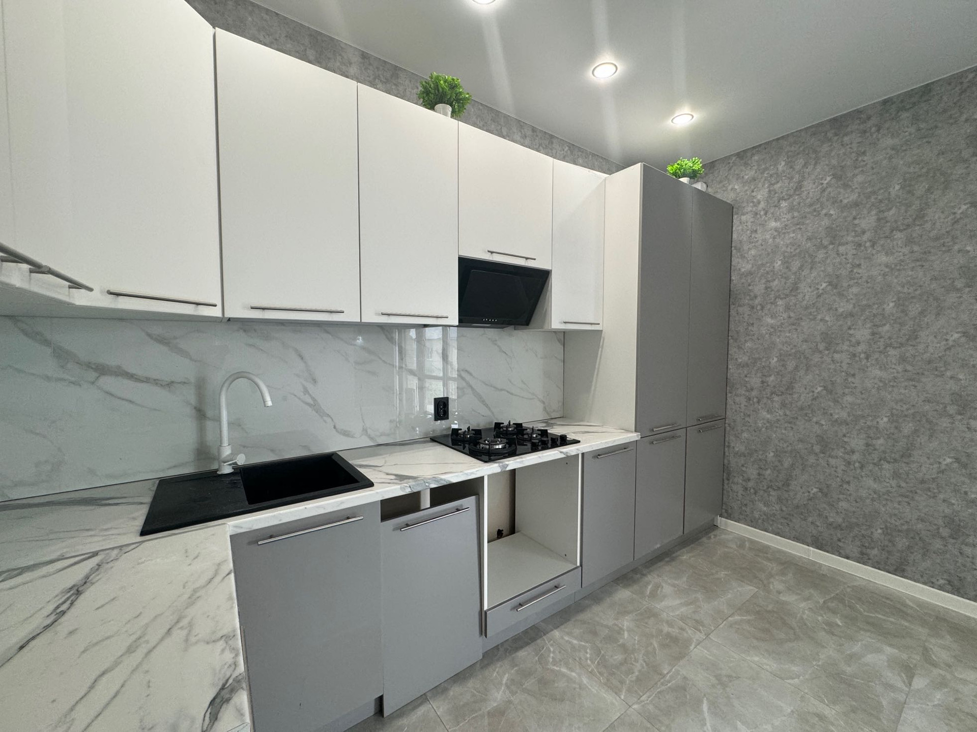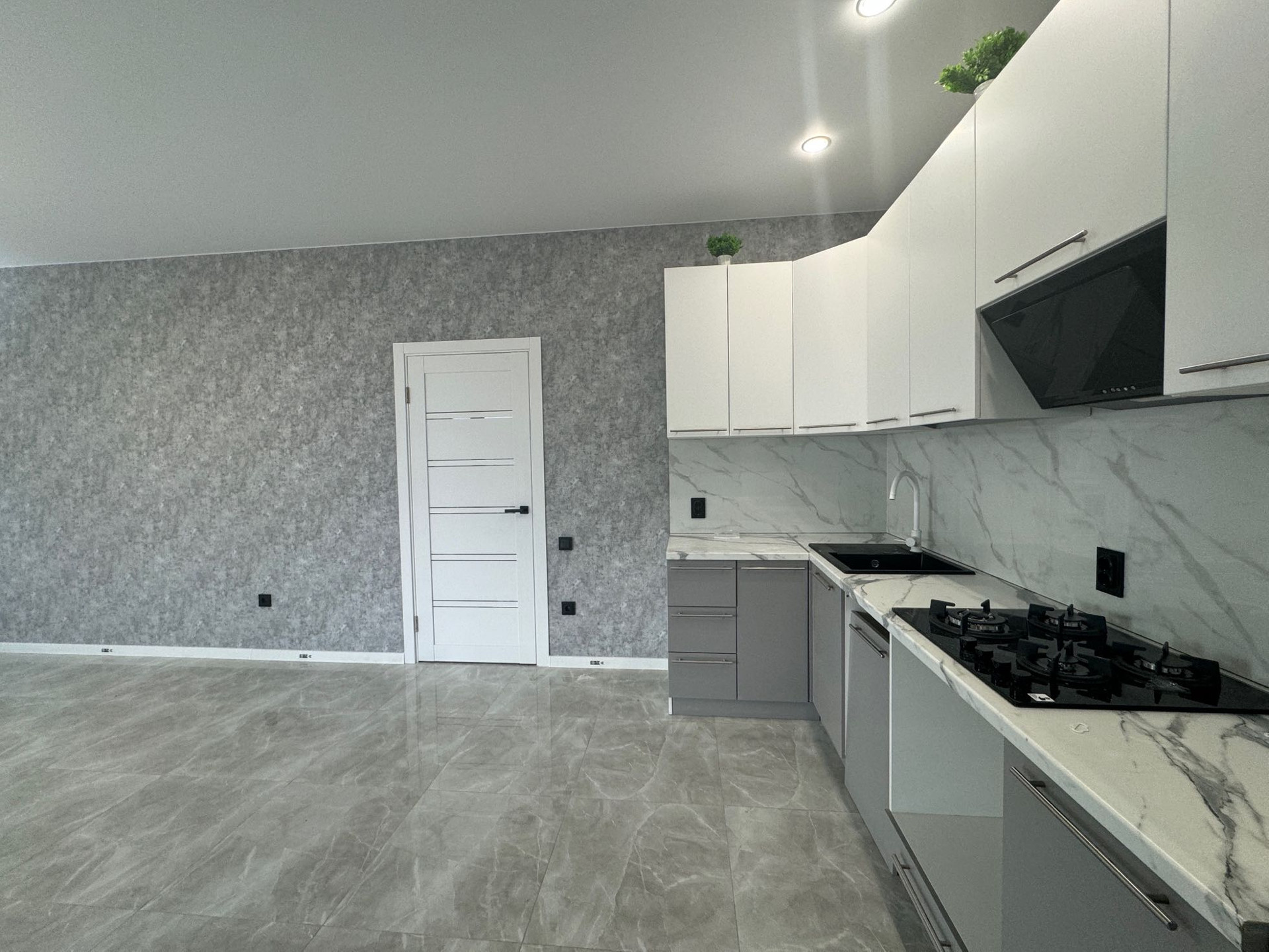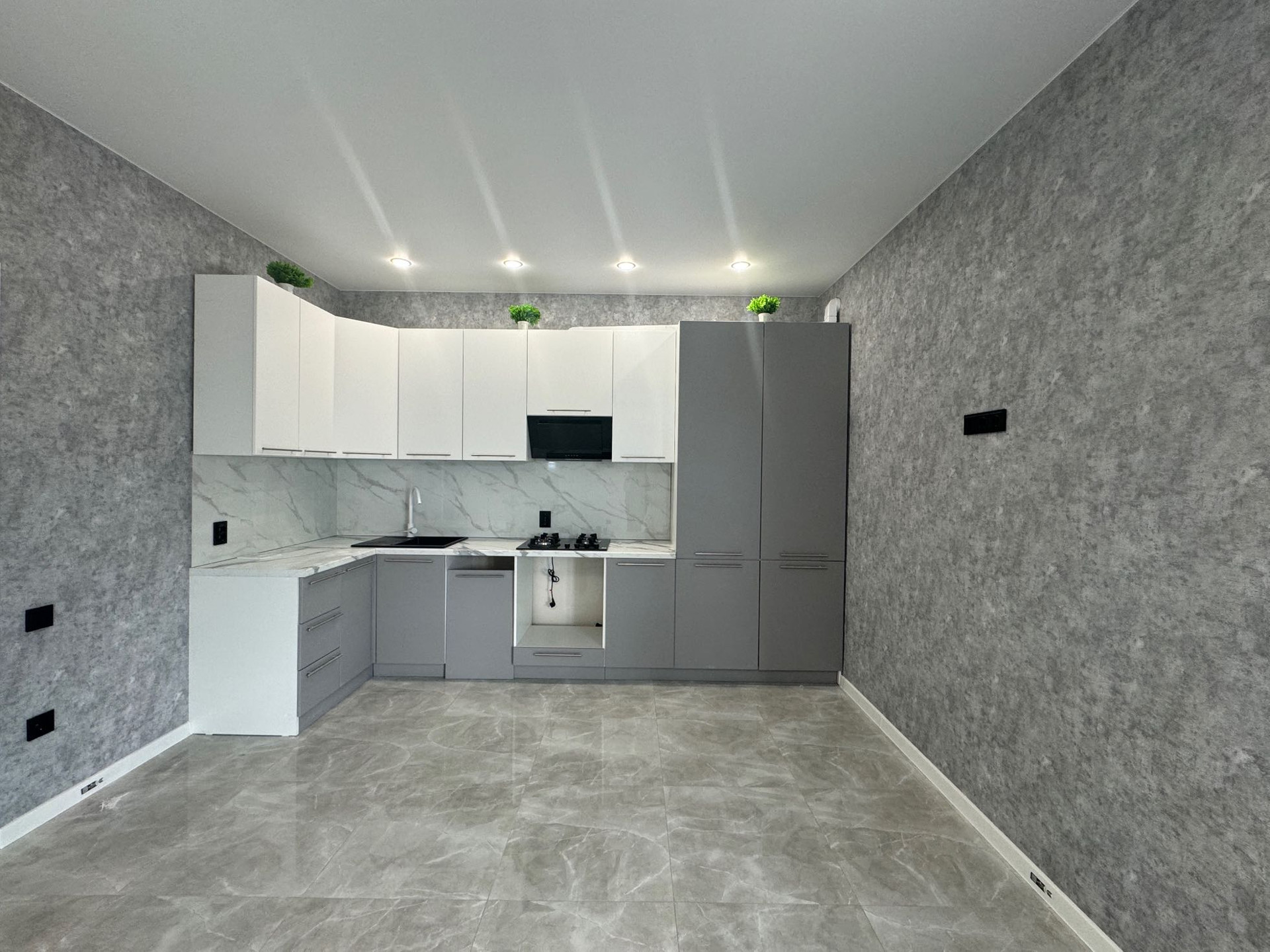 установлена новая встроенная кухня с техникой ( вытяжка, варочная панель), люстры…