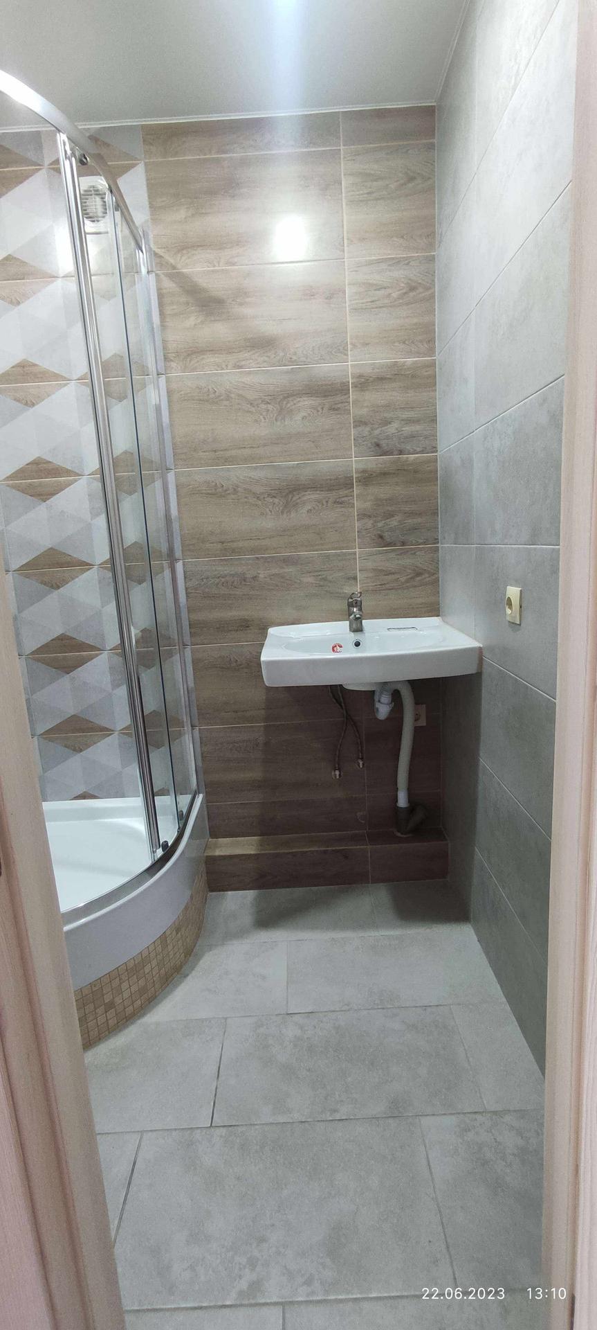 В санузле сделаны выводы под стиральную машину, чтобы не занимать место в самой комнате. При этом машинка устанавливается под раковину, что так же экономит место.