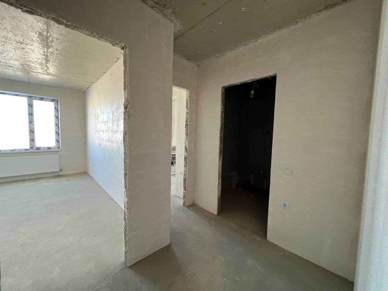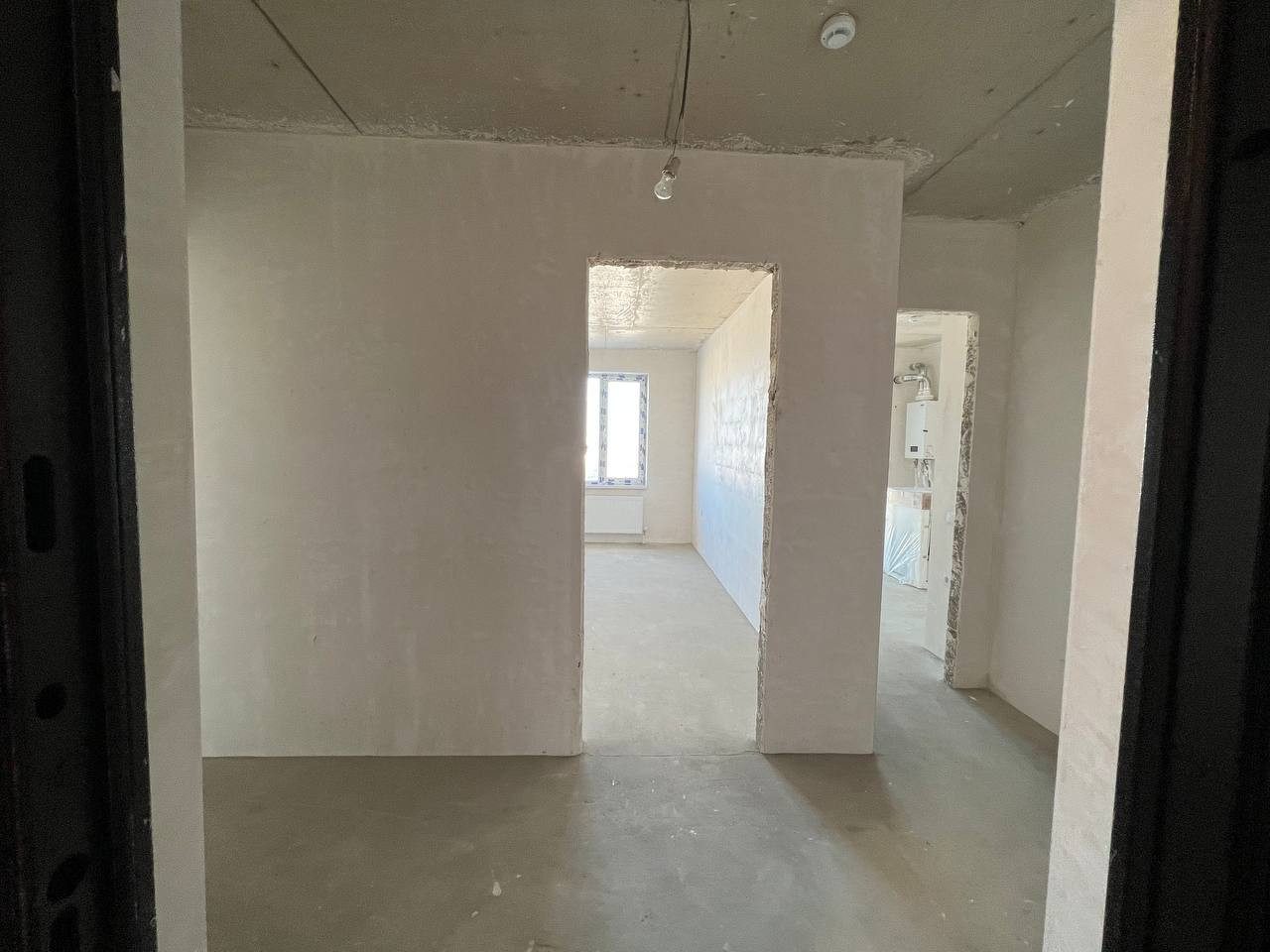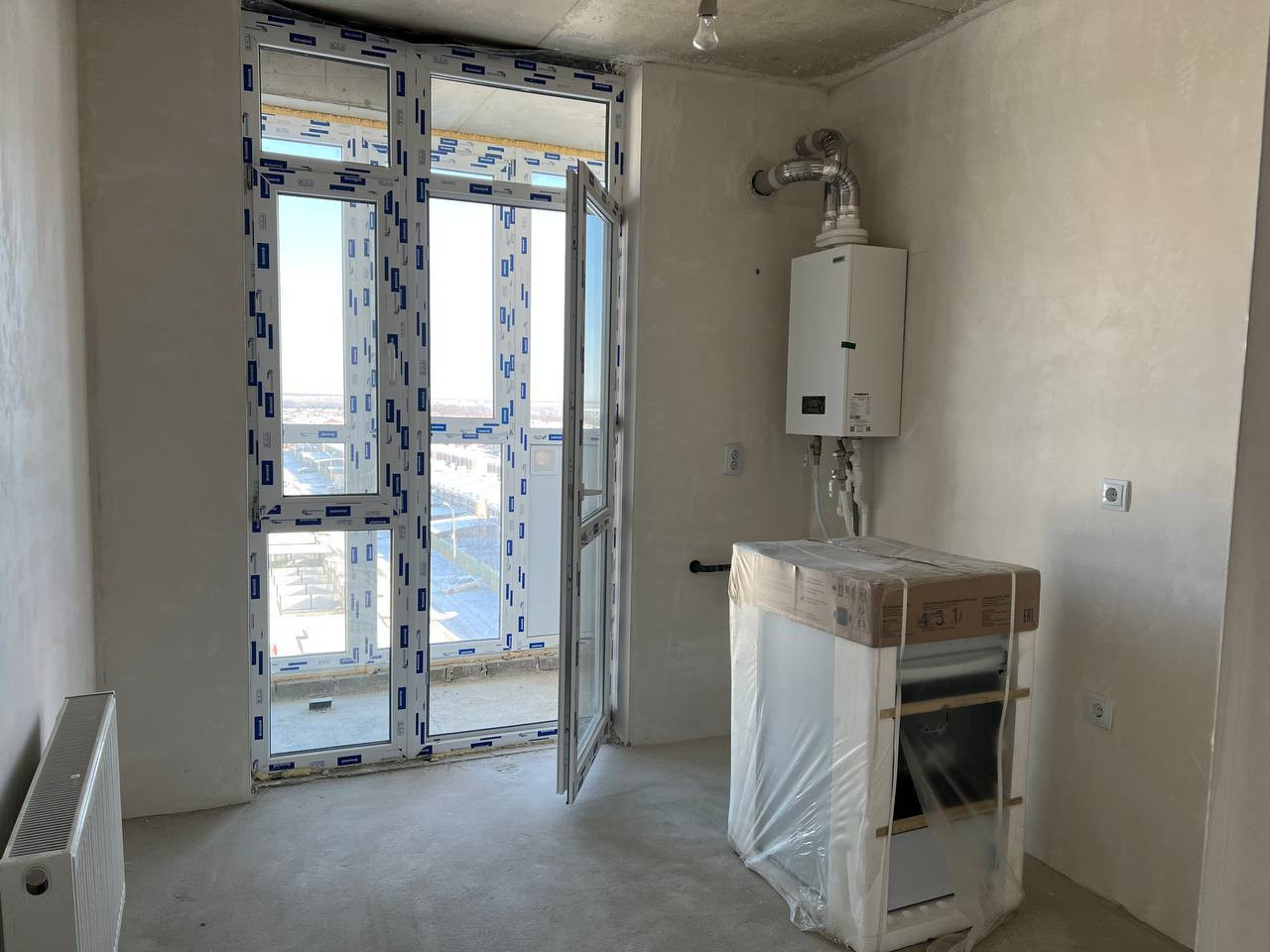 Квартира с предчистовой отделкой: стены оштукатурены, установлены котел-колонка, радиаторы отопления, розетки, выключатели, приборы учета.