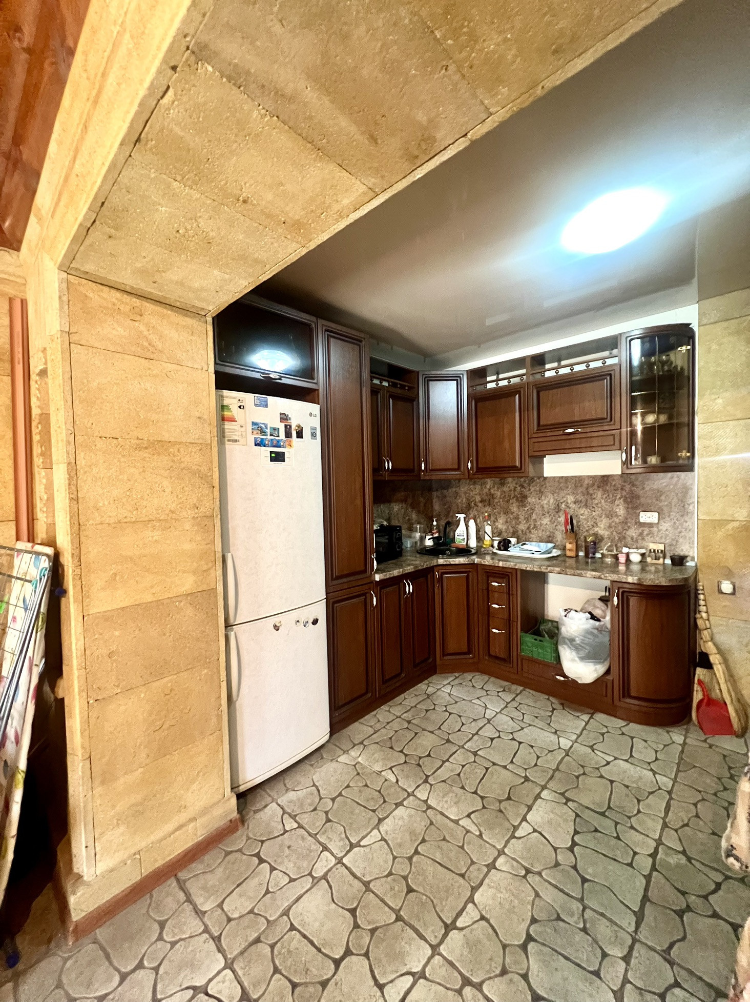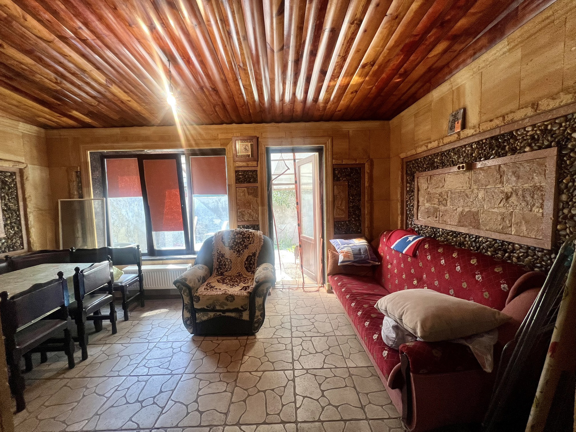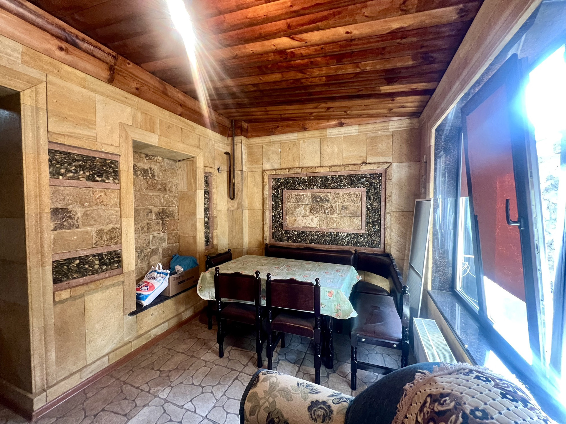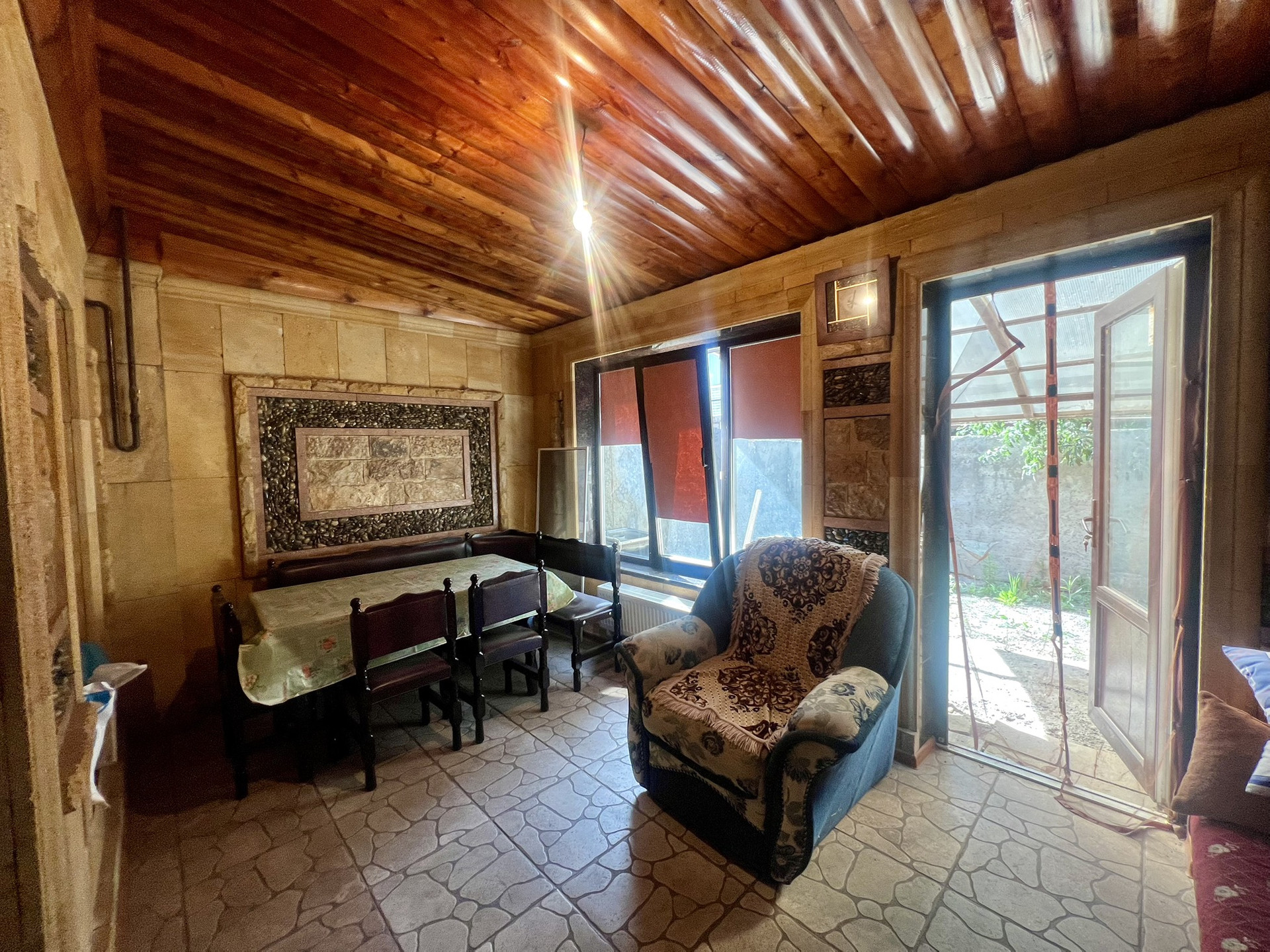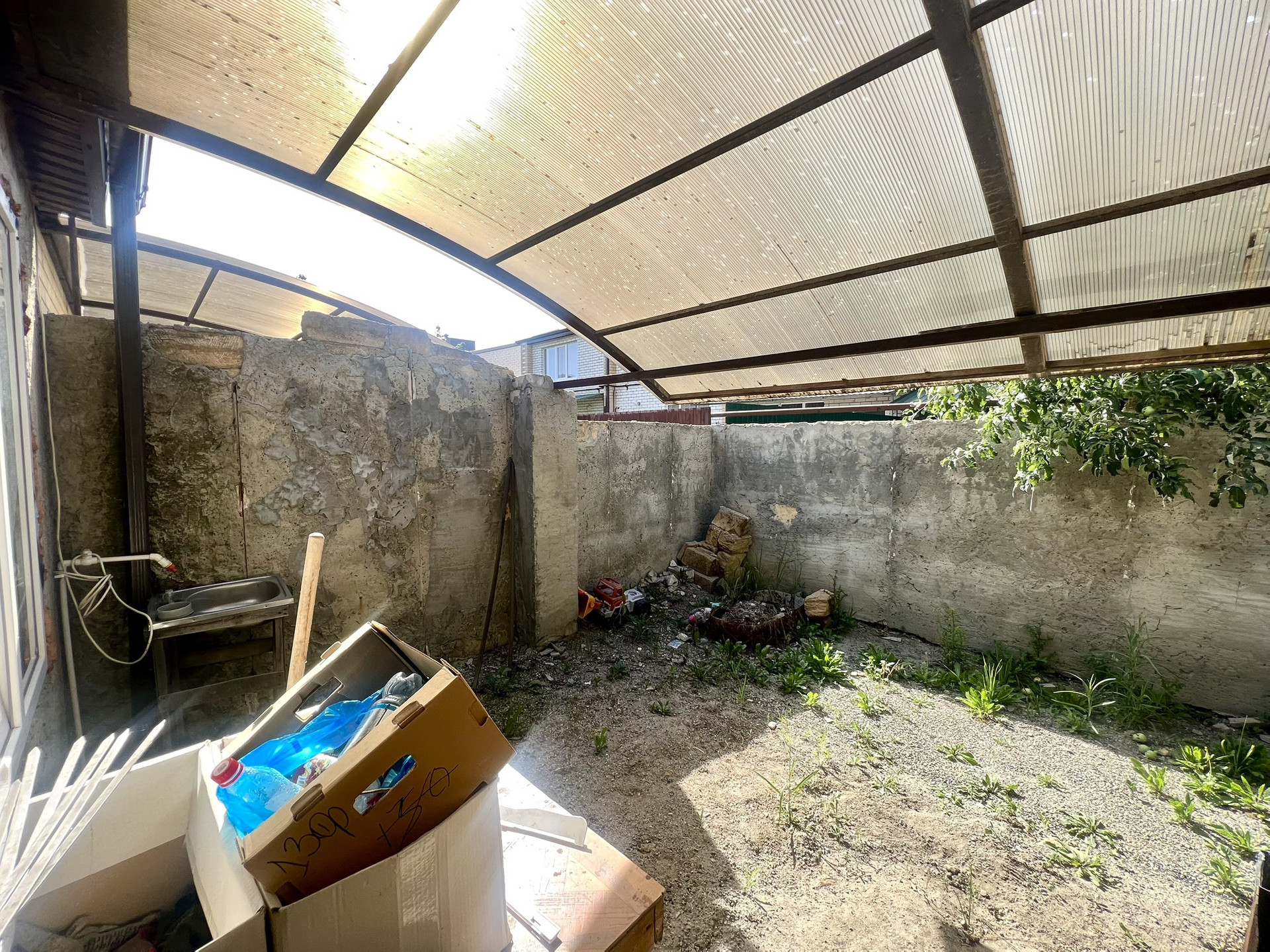 Задняя часть двора облагорожена навесом,дом облицован дорогим камнем.