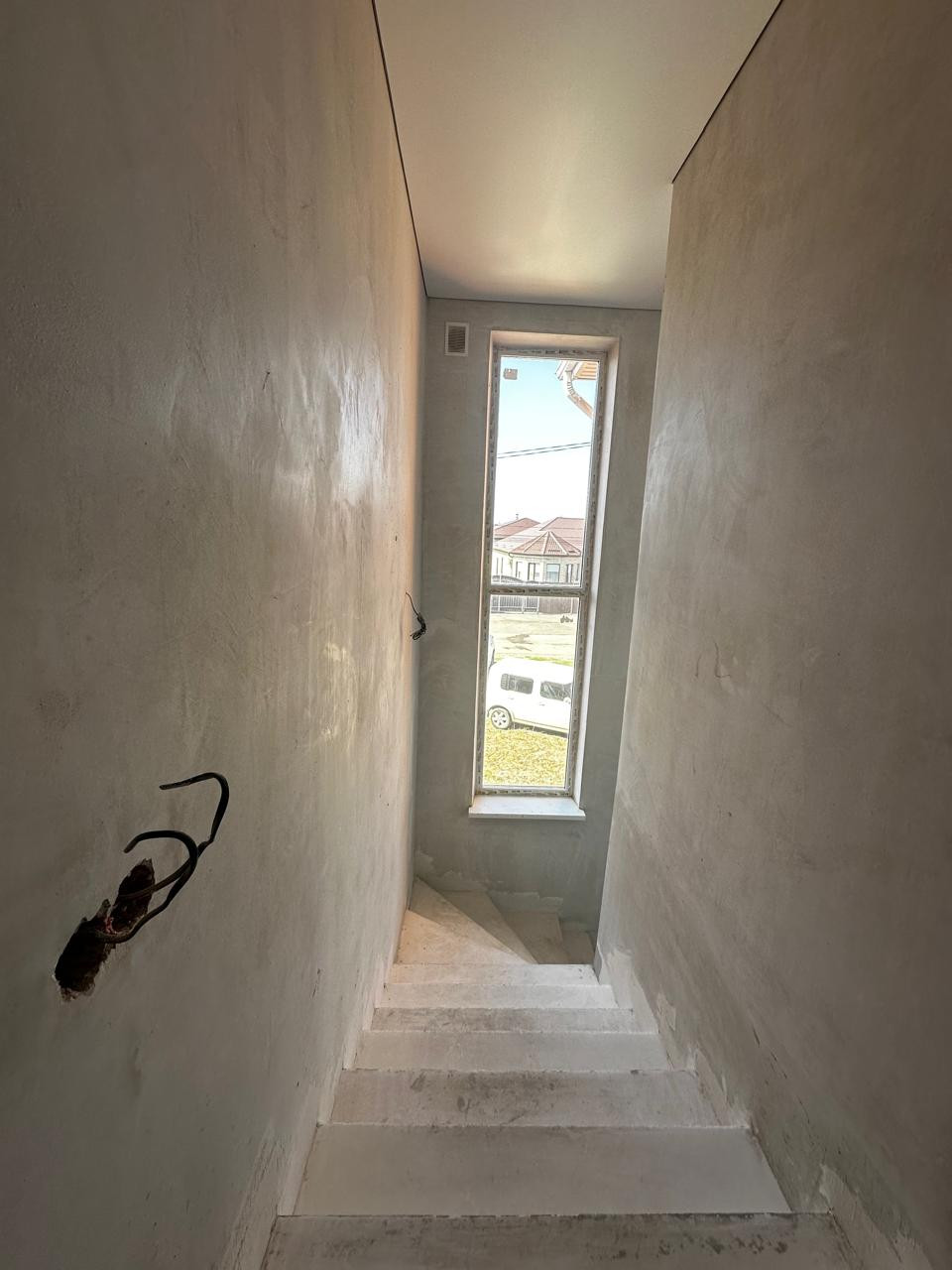 Между этажами плиты перекрытия, монолитная лестницас панорамным остеклением, которая готова к отделке!