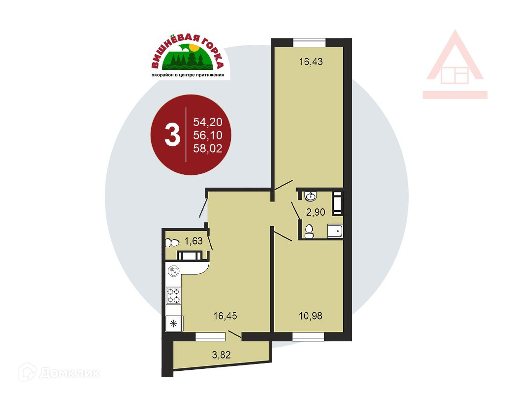 3-комнатная квартира, 56.6 м2, этаж 8 / 10, на продажу в микрорайоне Вишнёвая Горка, Олимпийская улица, 1