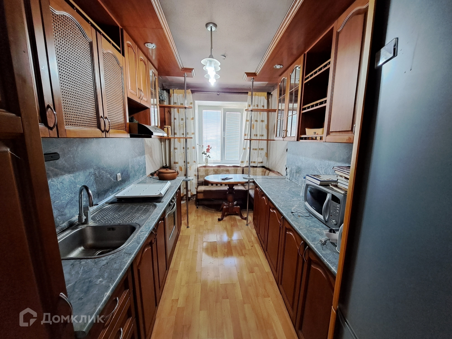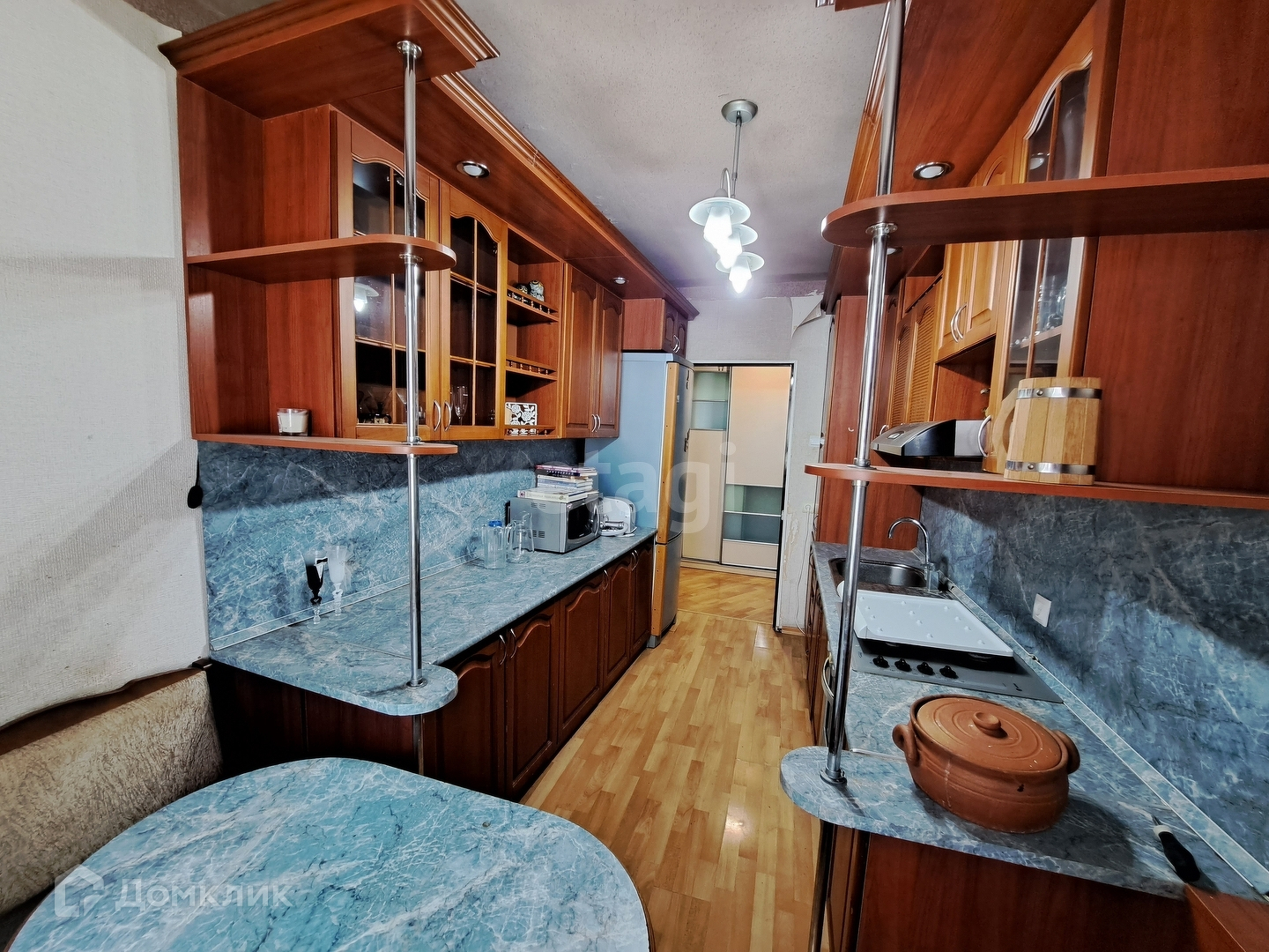 Остается кухонный гарнитур, мебель и техника.