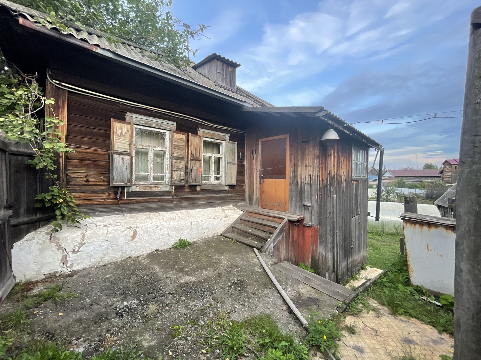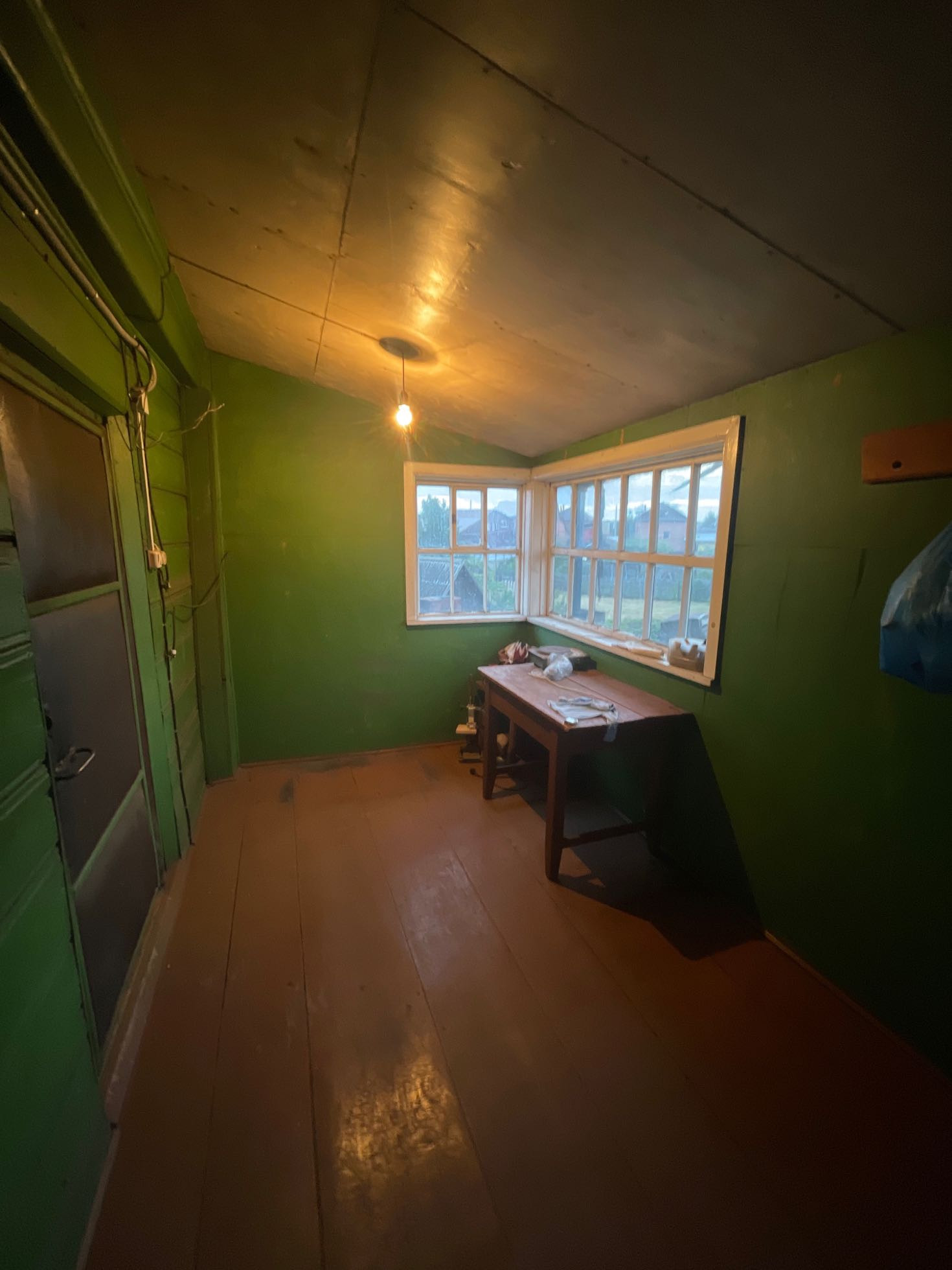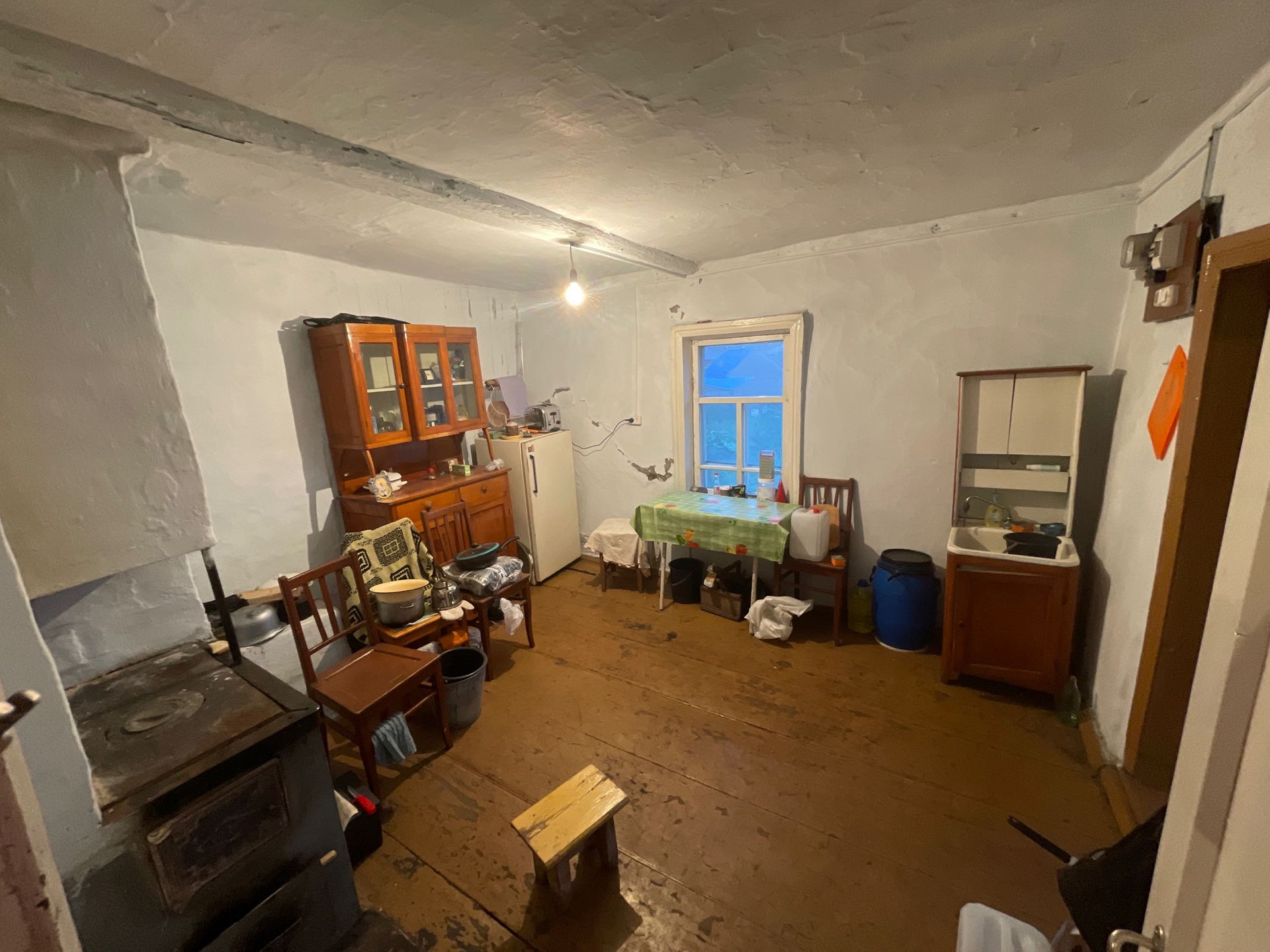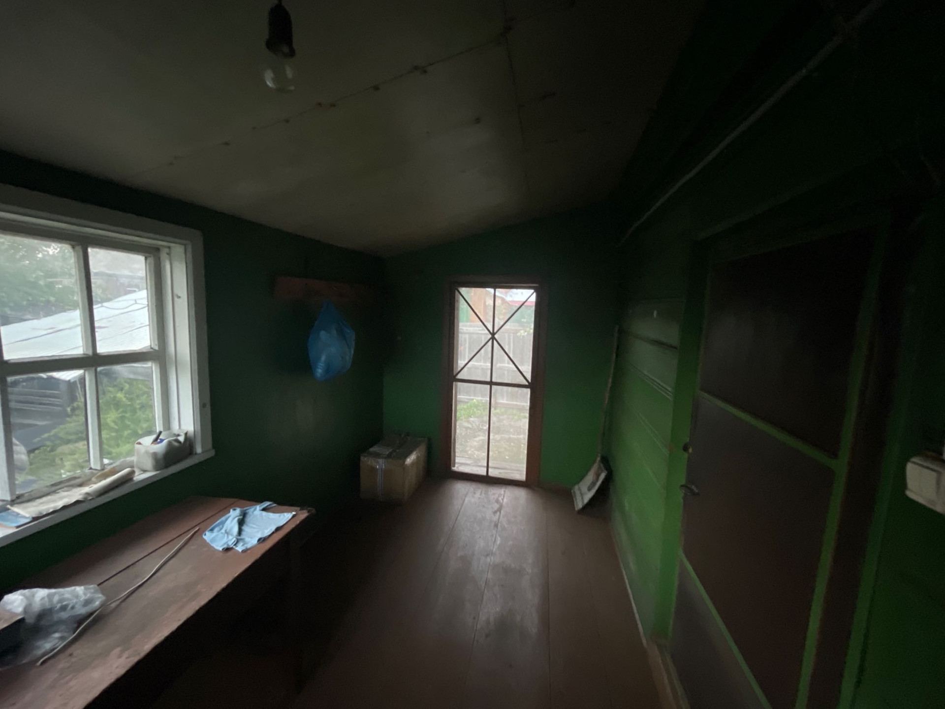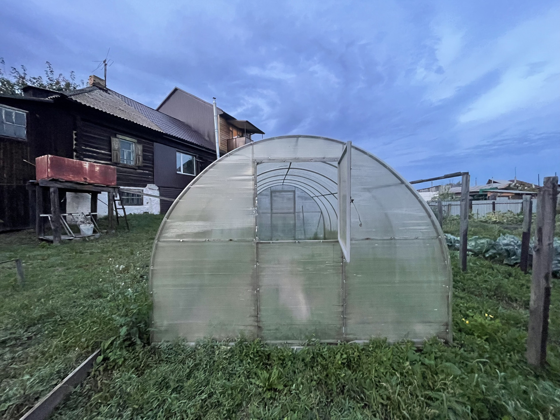 Комната и кухня, на первом этаже кабинет , печь на каждом этаже . Теплица , дом для бани , рядом Бор .