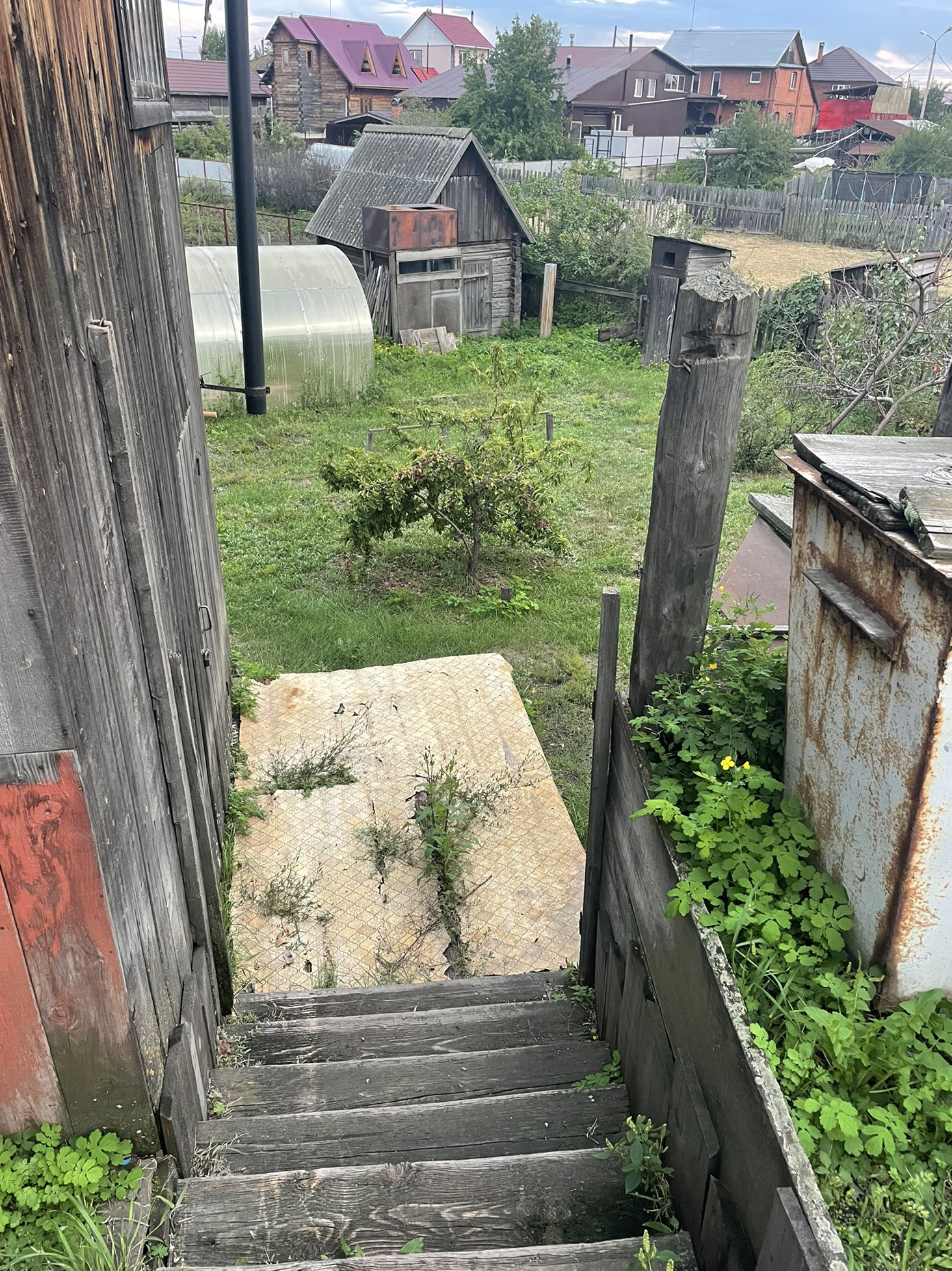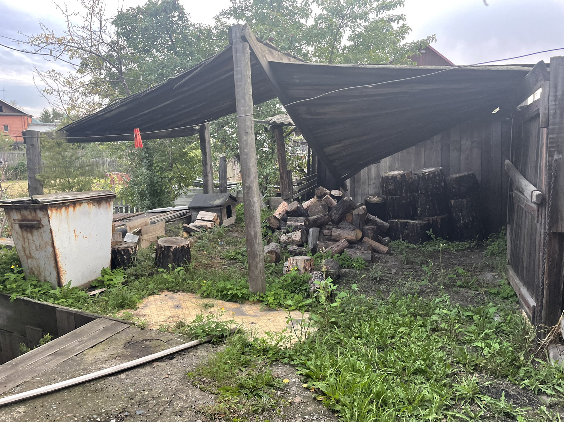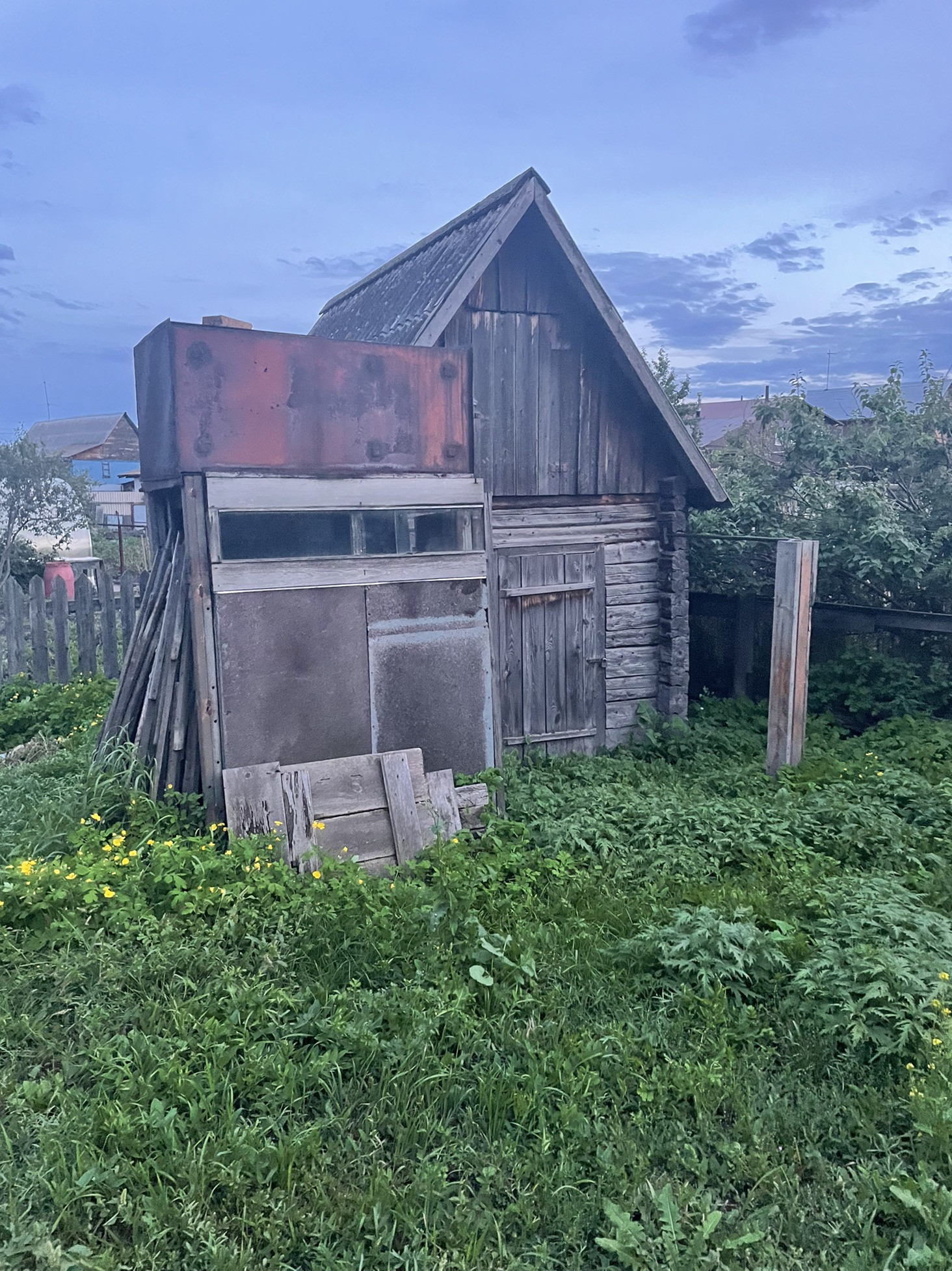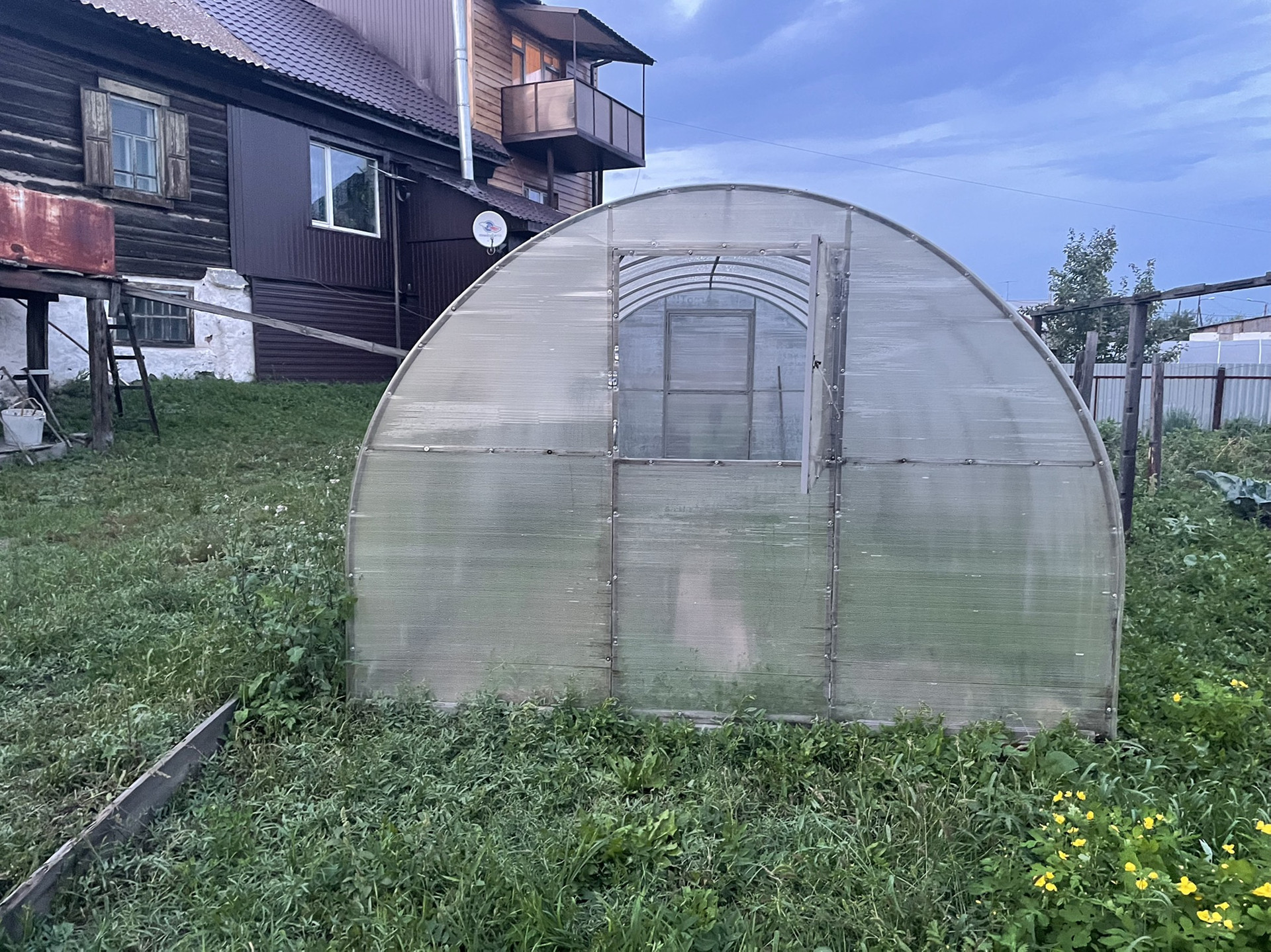 Комната и кухня, на первом этаже кабинет , печь на каждом этаже . Теплица , дом для бани , рядом Бор .
