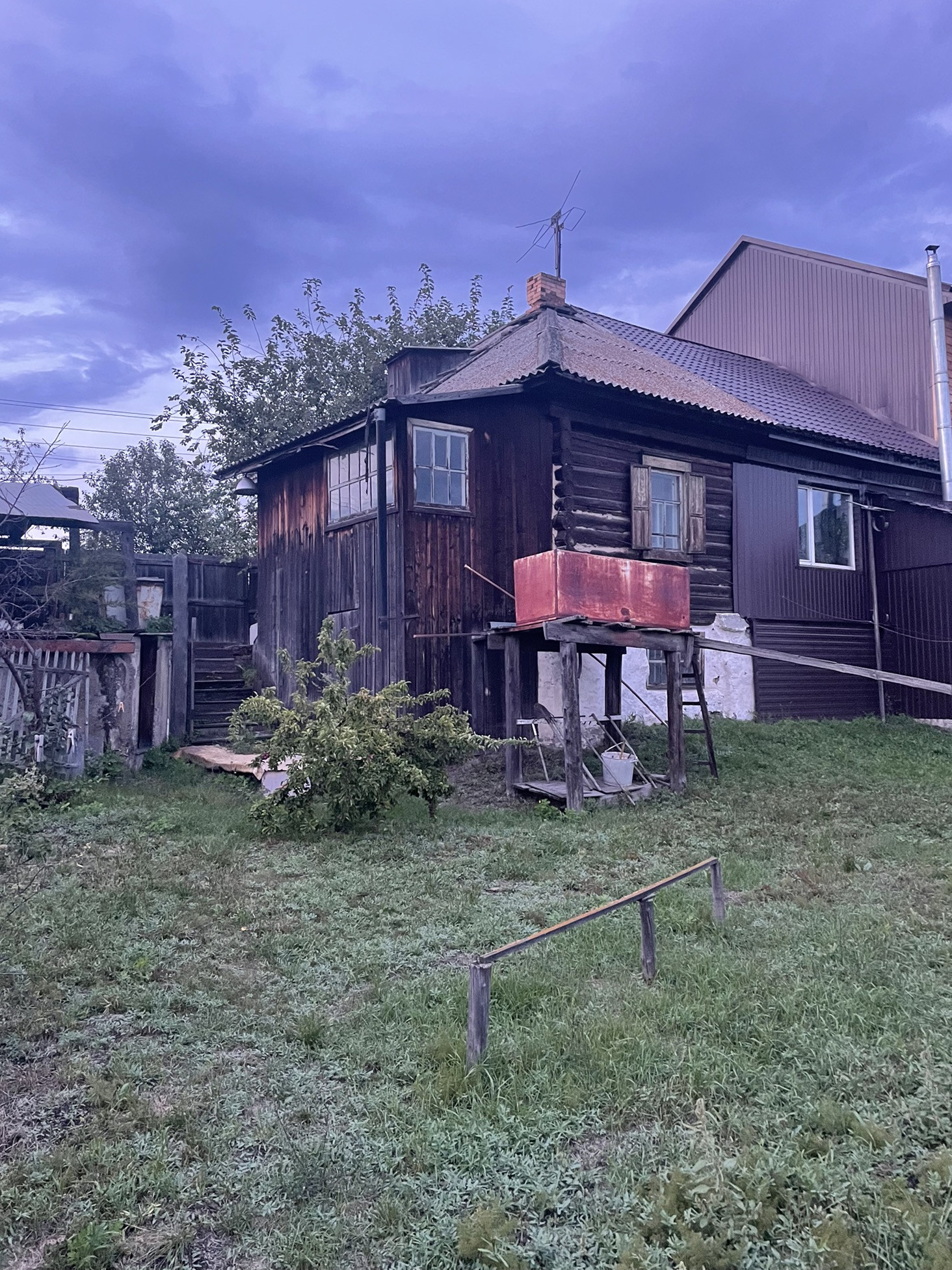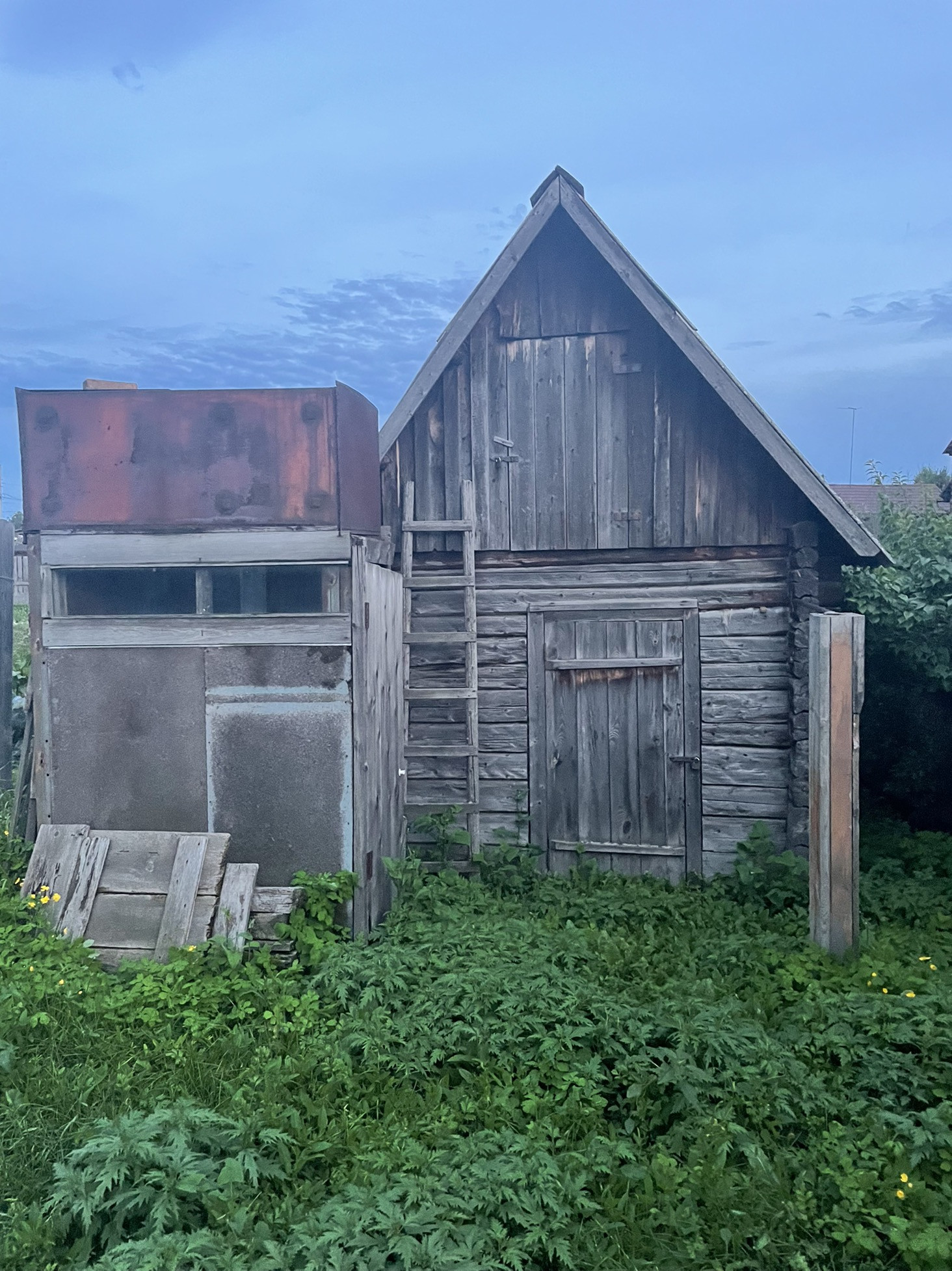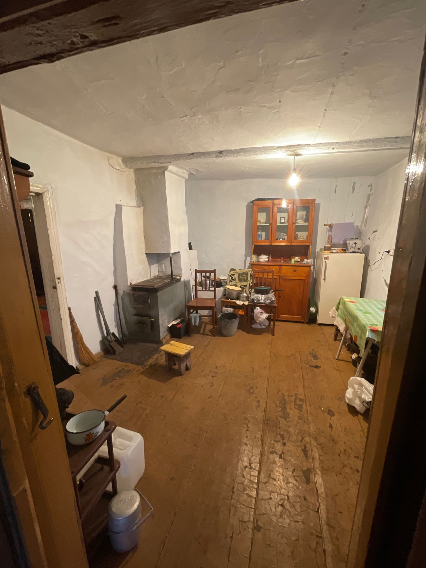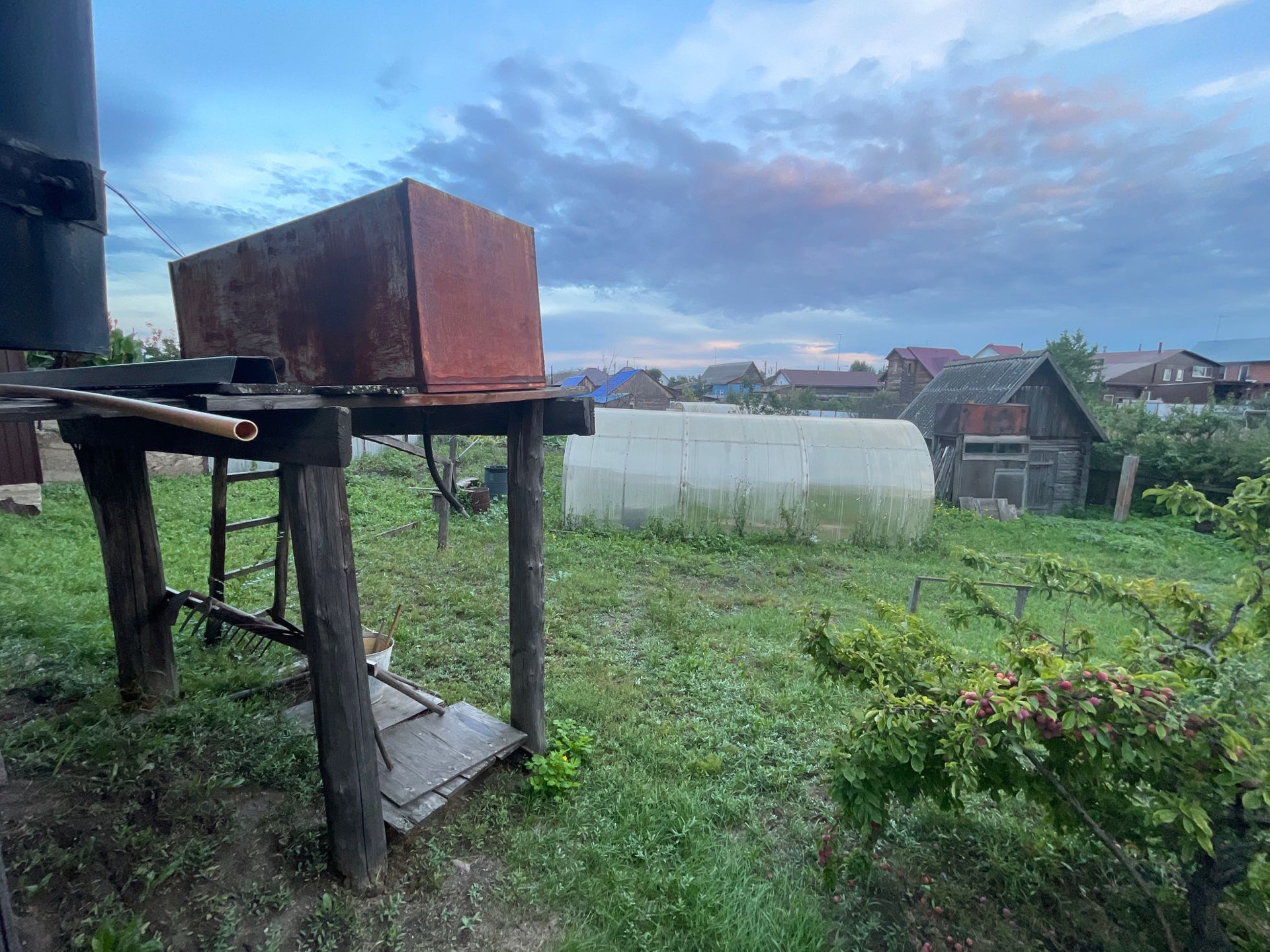 Комната и кухня, на первом этаже кабинет , печь на каждом этаже . Теплица , дом для бани , рядом Бор .