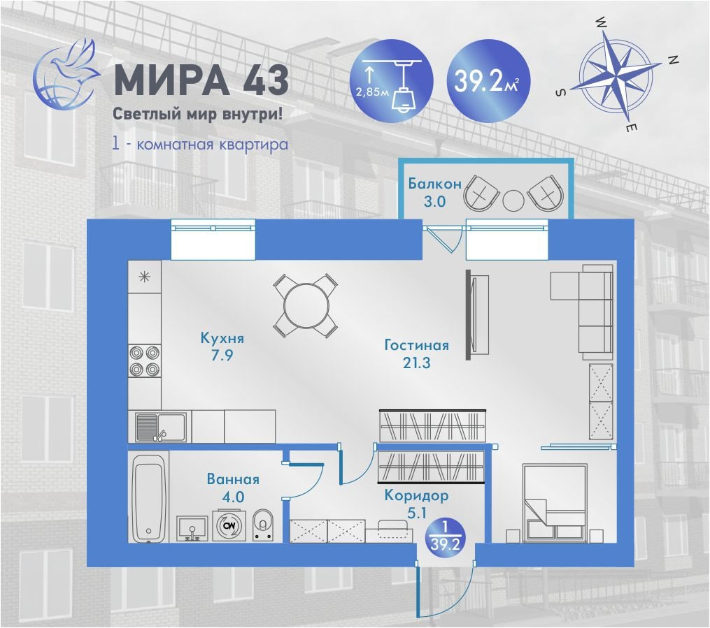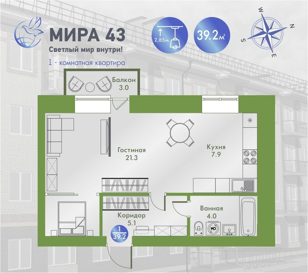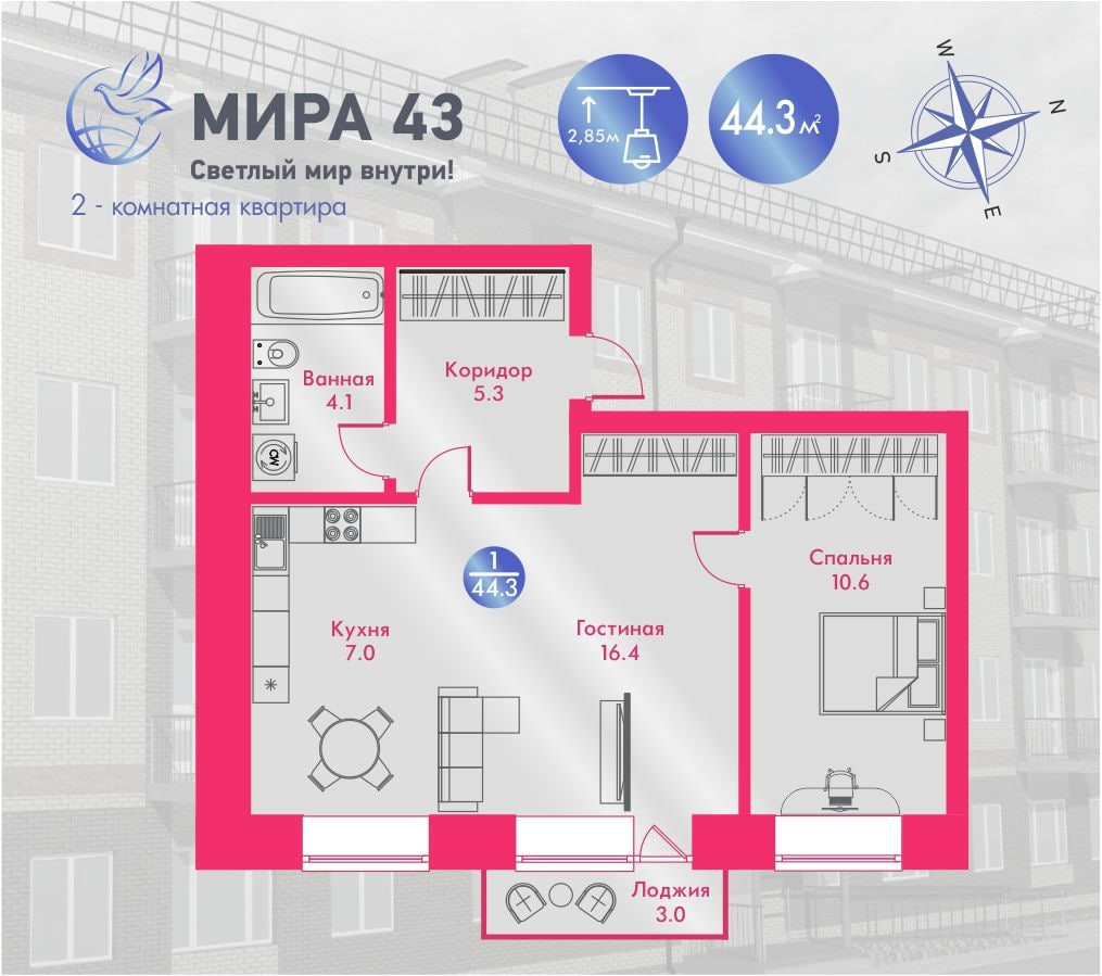 Вашему вниманию 2-х комнатная квартира 44.3м2 современной планировки: кухня-гостиная 23,4 м2, комната отдыха 10,6 м2. Ванна и туалет для экономии пространства совмещены. Балкон 3 м2. Можно выбрать этаж 1-4.