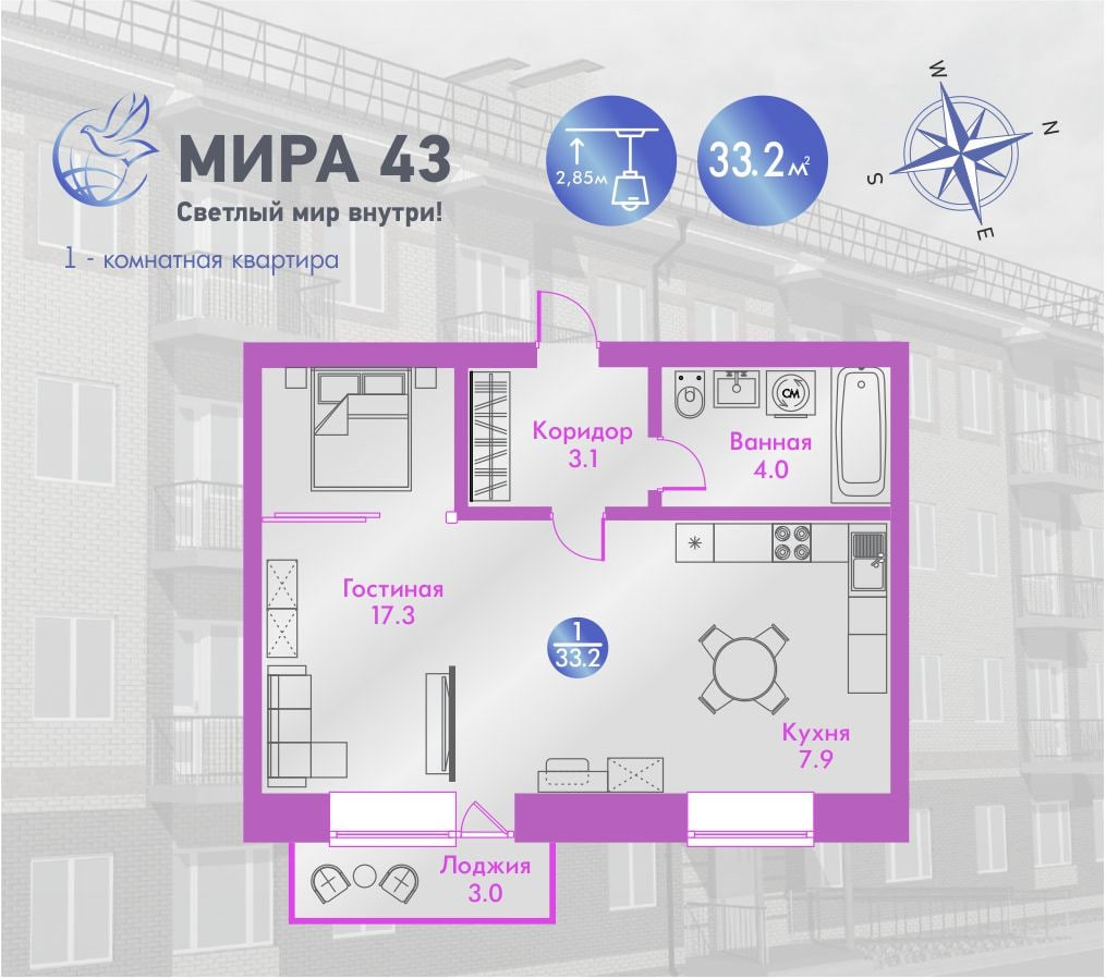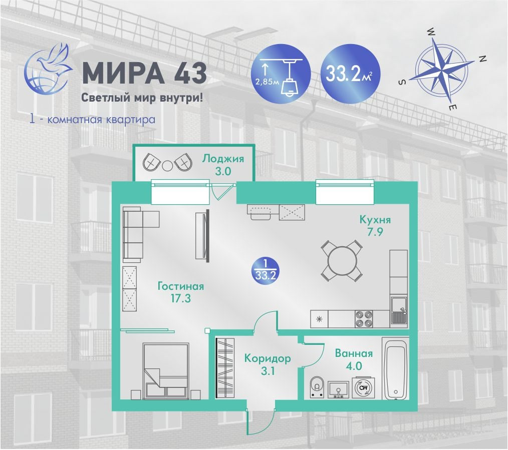 Также можем предложить студии и 1-ком. квартиры площадей 31 , 33.3, 38.3, 43.3 м2.