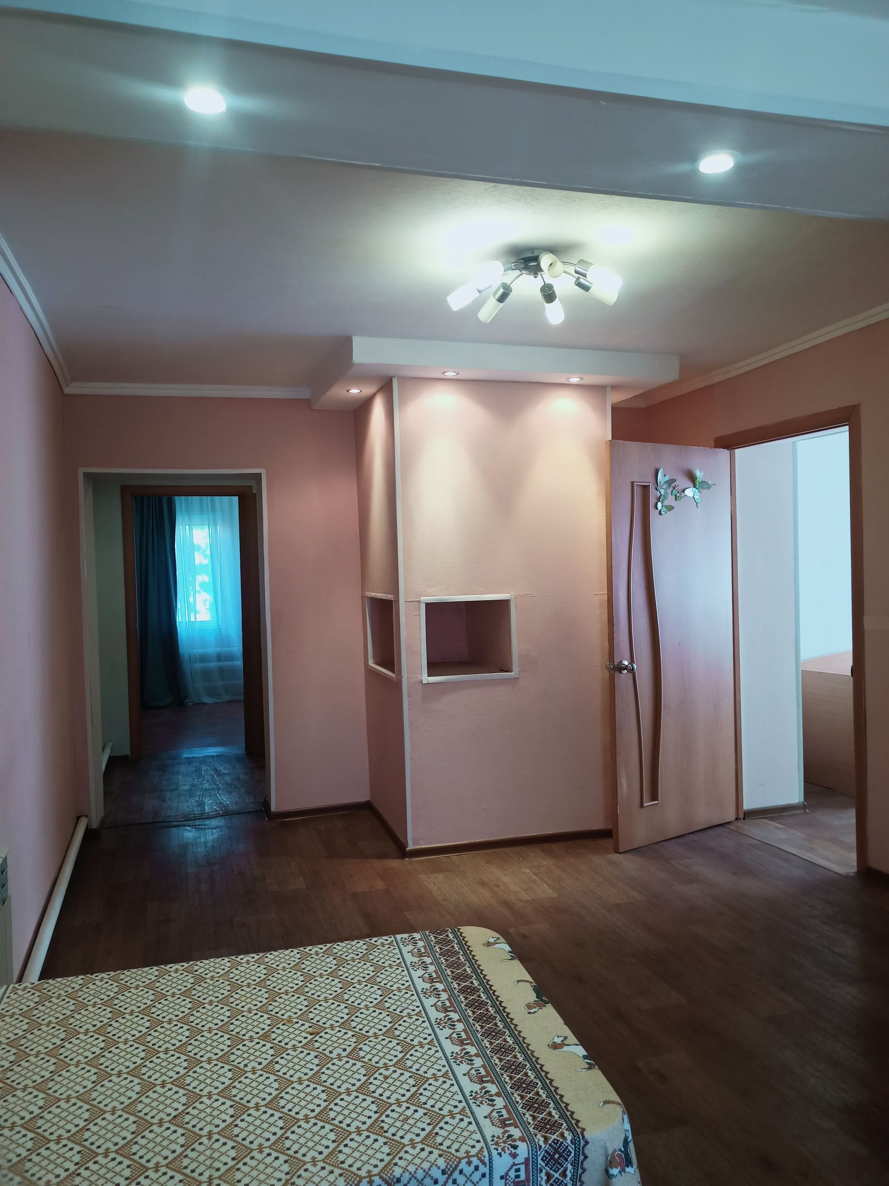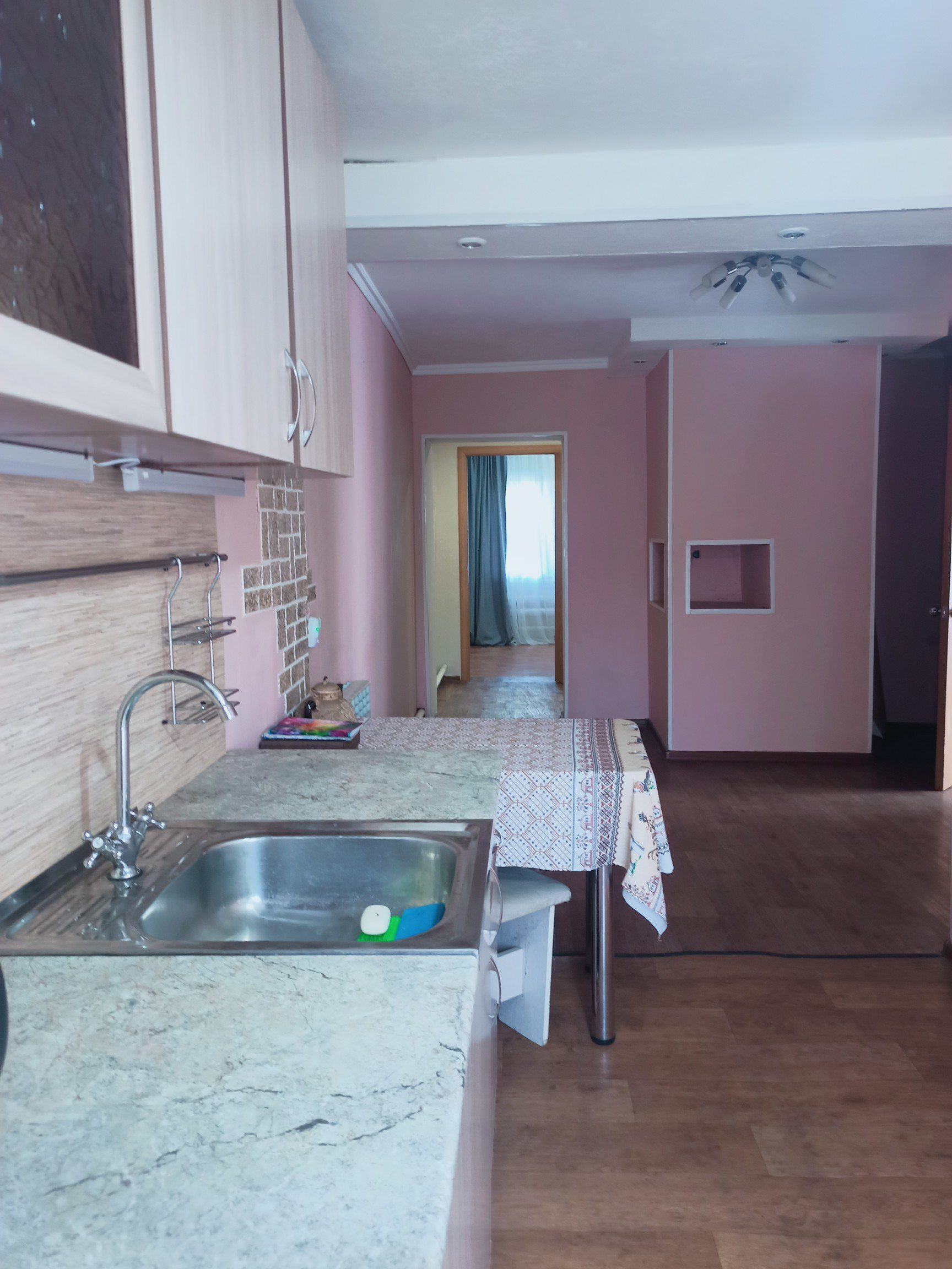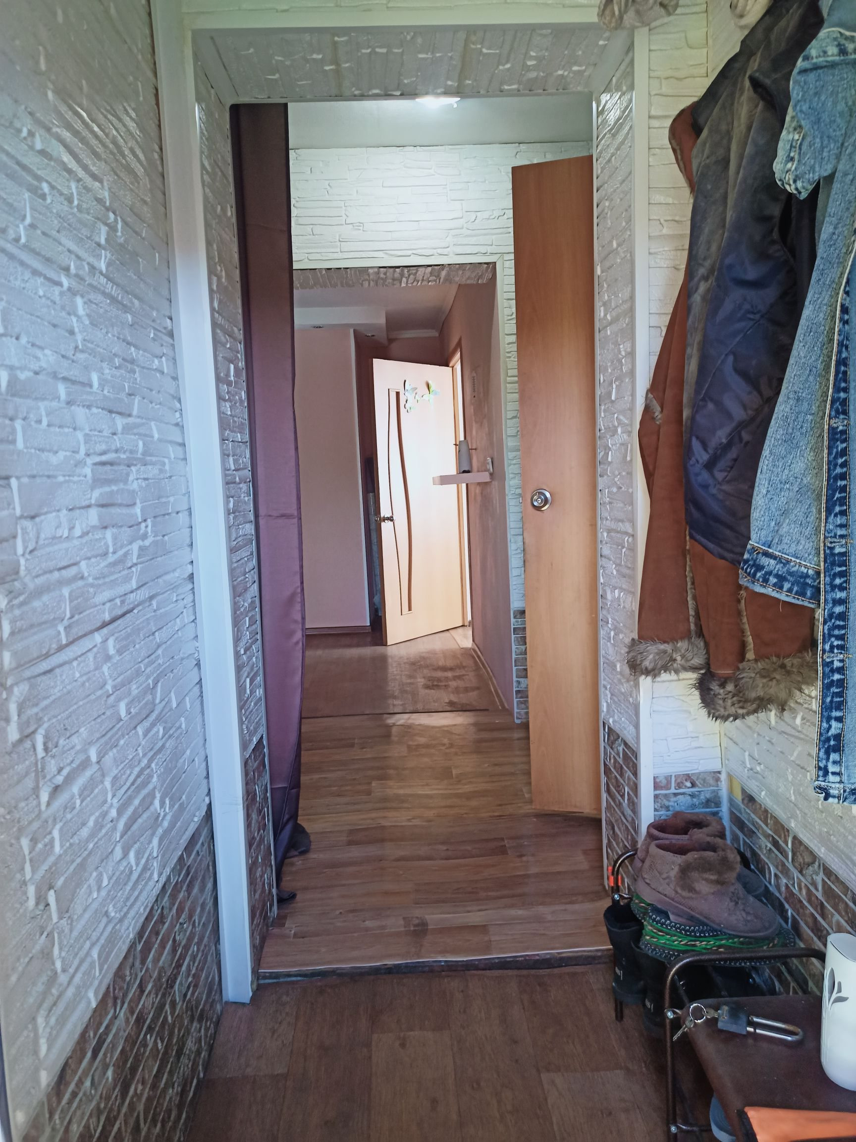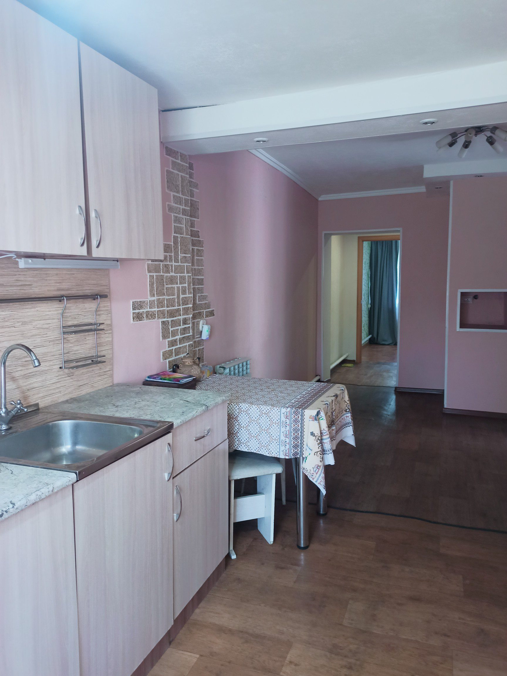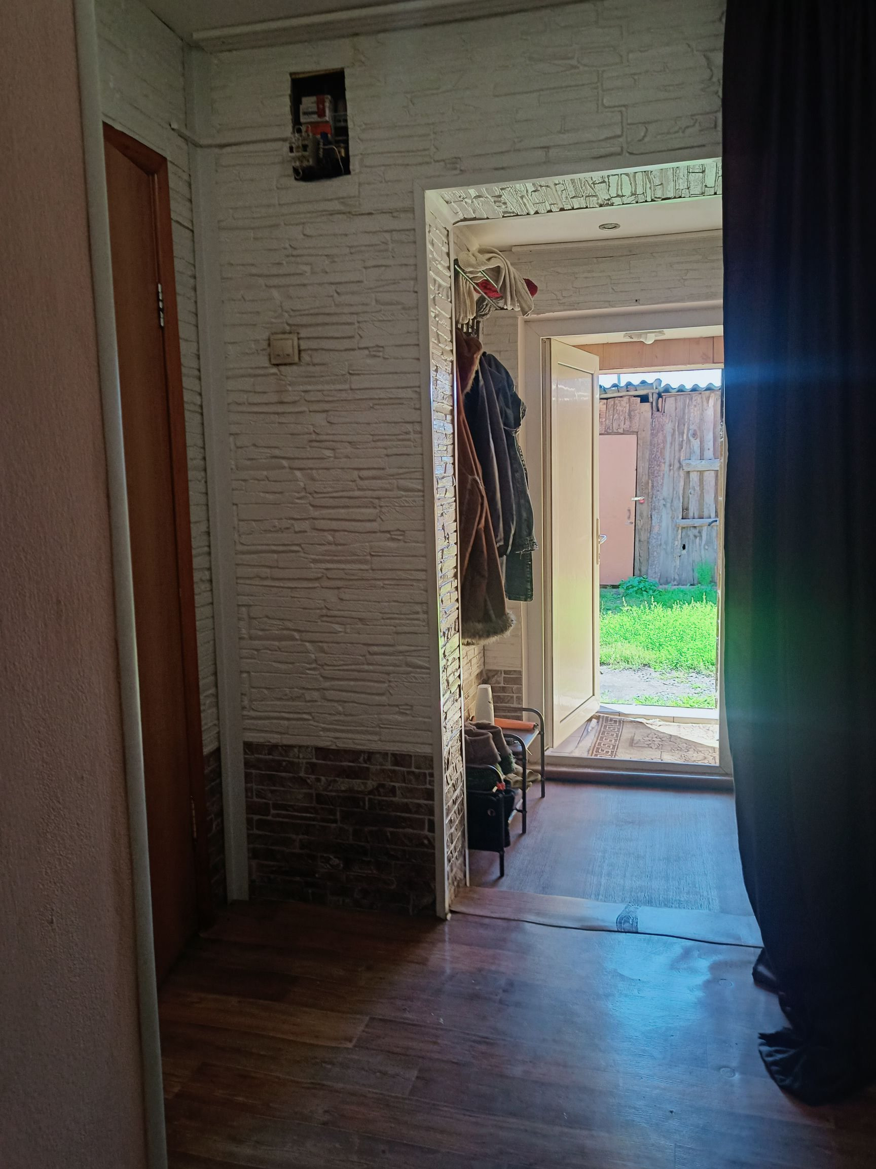 Четыре комнаты, кухня, просторный коридор, санузел совмещен установлен водонагреватель (ещё один установлен на кухне). Два подполья (выложены плетняком). Окна ПВХ, на полу линолеум, межкомнатные двери в одном стиле.