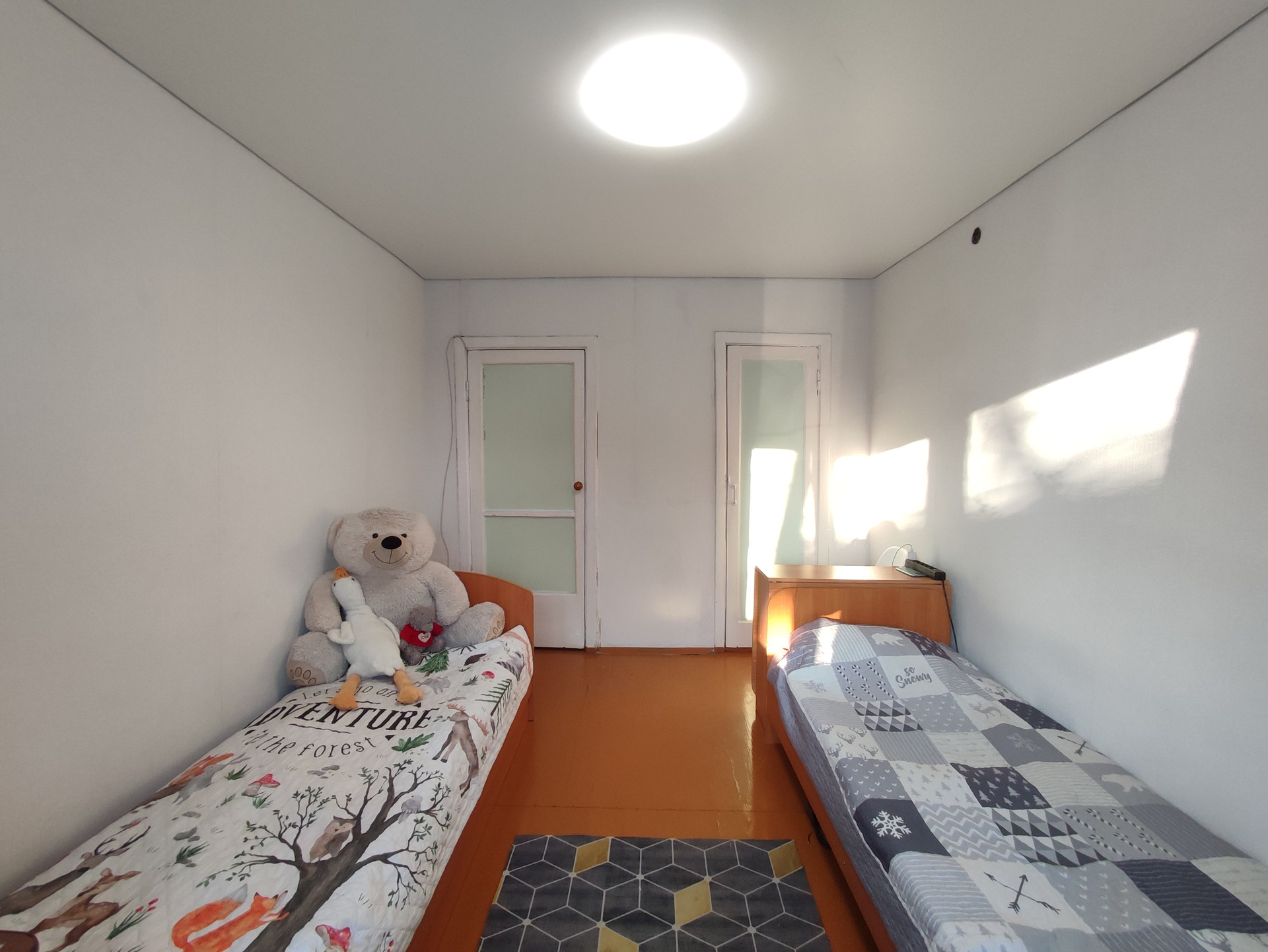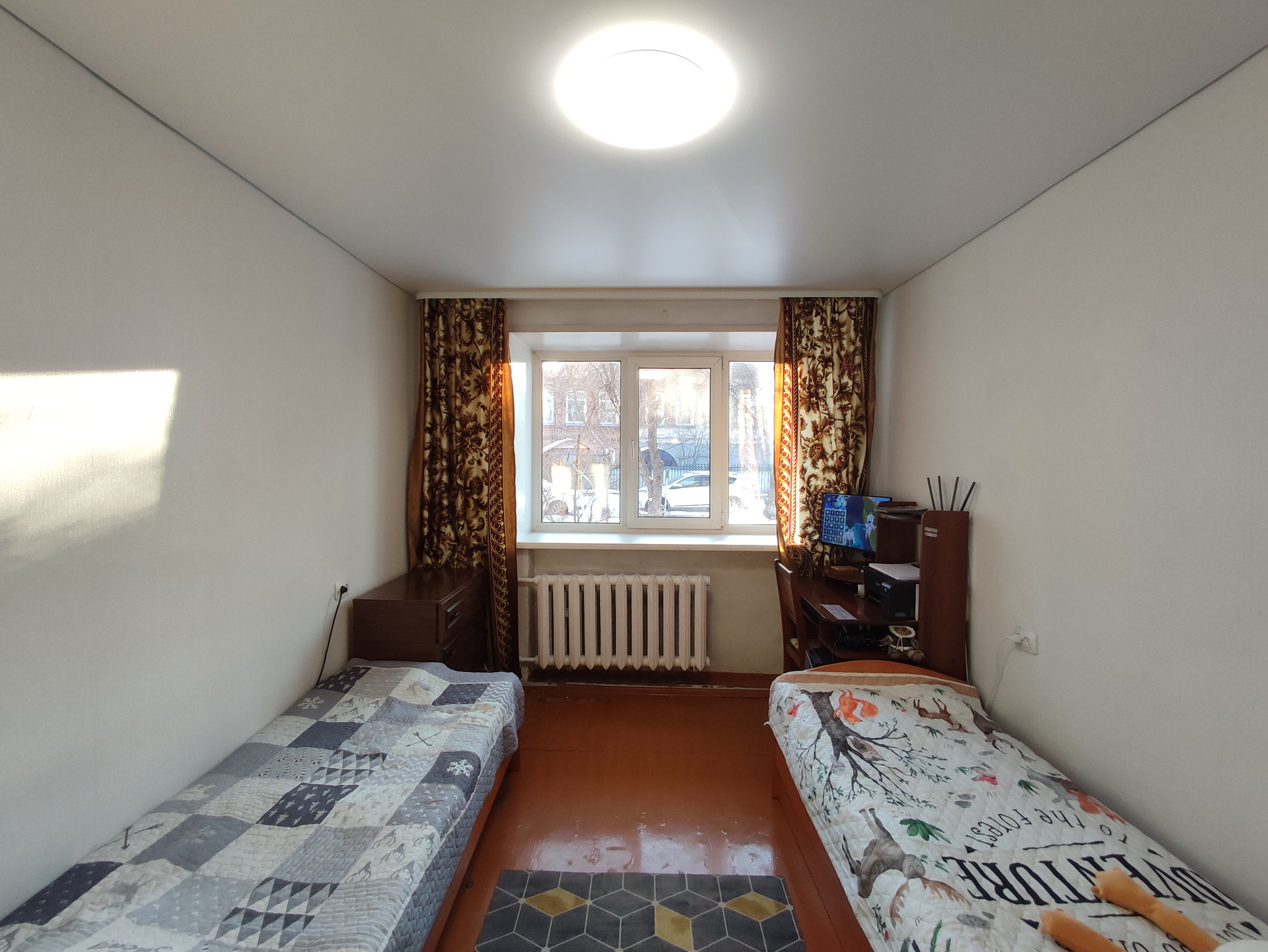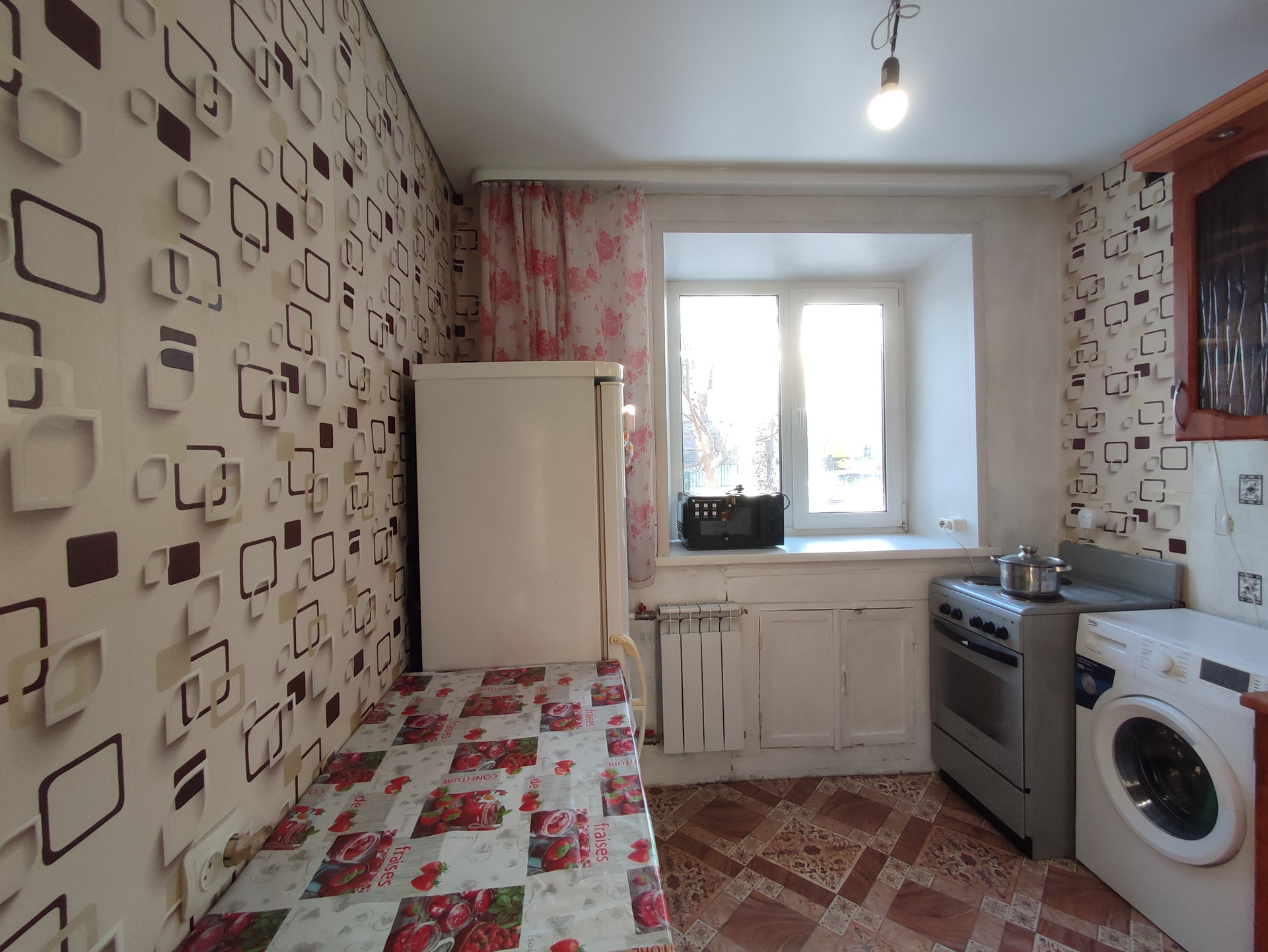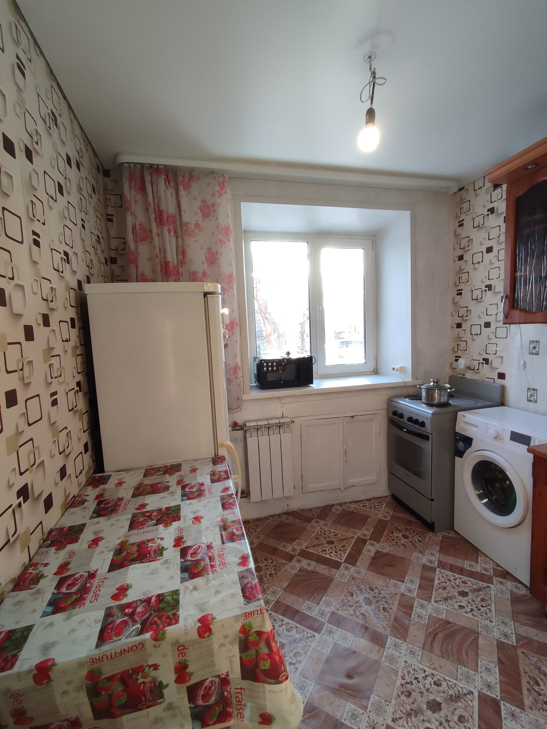 Квартира после косметического ремонта. Выровнены стены,   натяжные   потолки, счётчики на воду, сантехника поменяна.  Установлены пластиковые стеклопакеты. Балкона нет, есть вместительная гардеробная. Хорошая входная дверь.