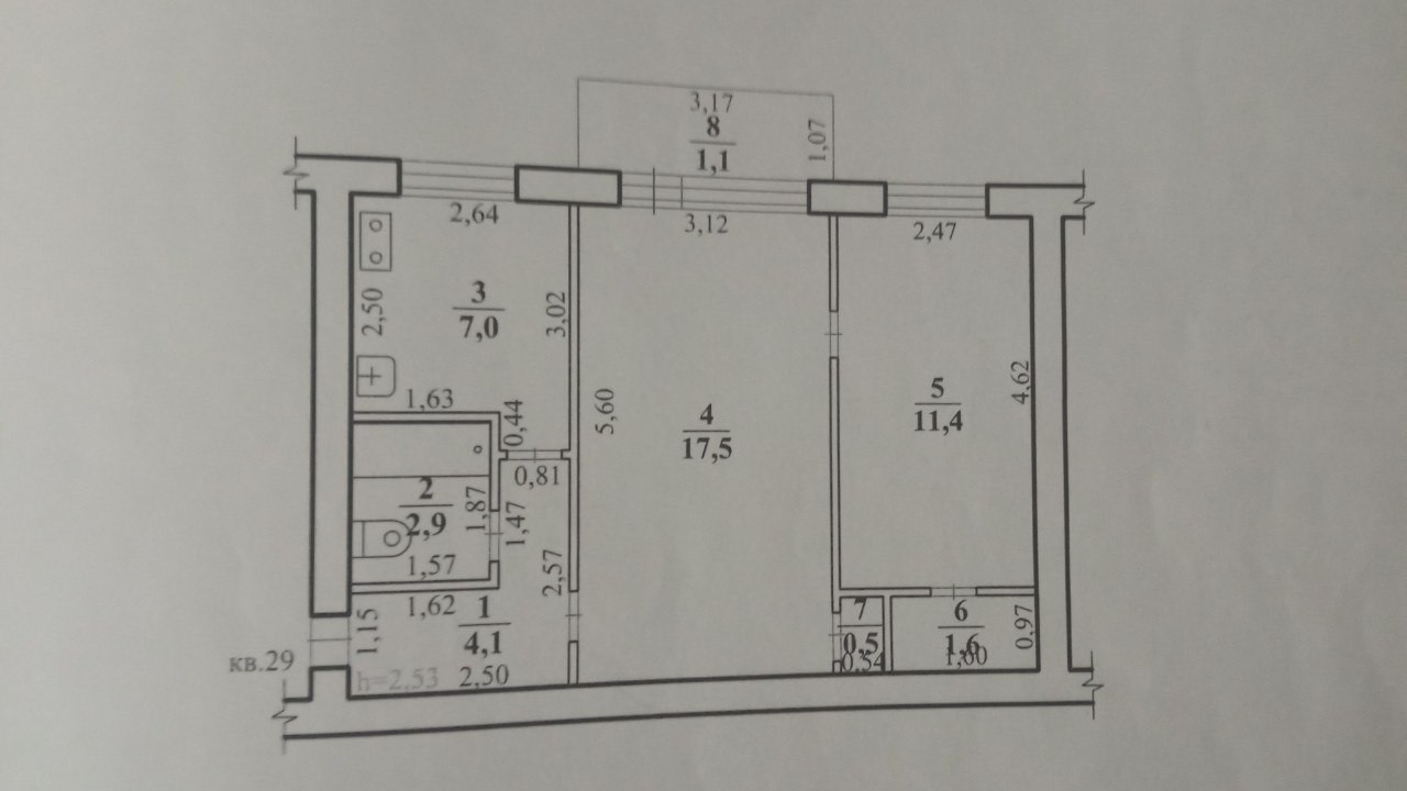 Высота потолков 2.53 м