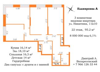 Продам трехкомнатную квартиру, 95.5 м2, улица Никитина, 11к10