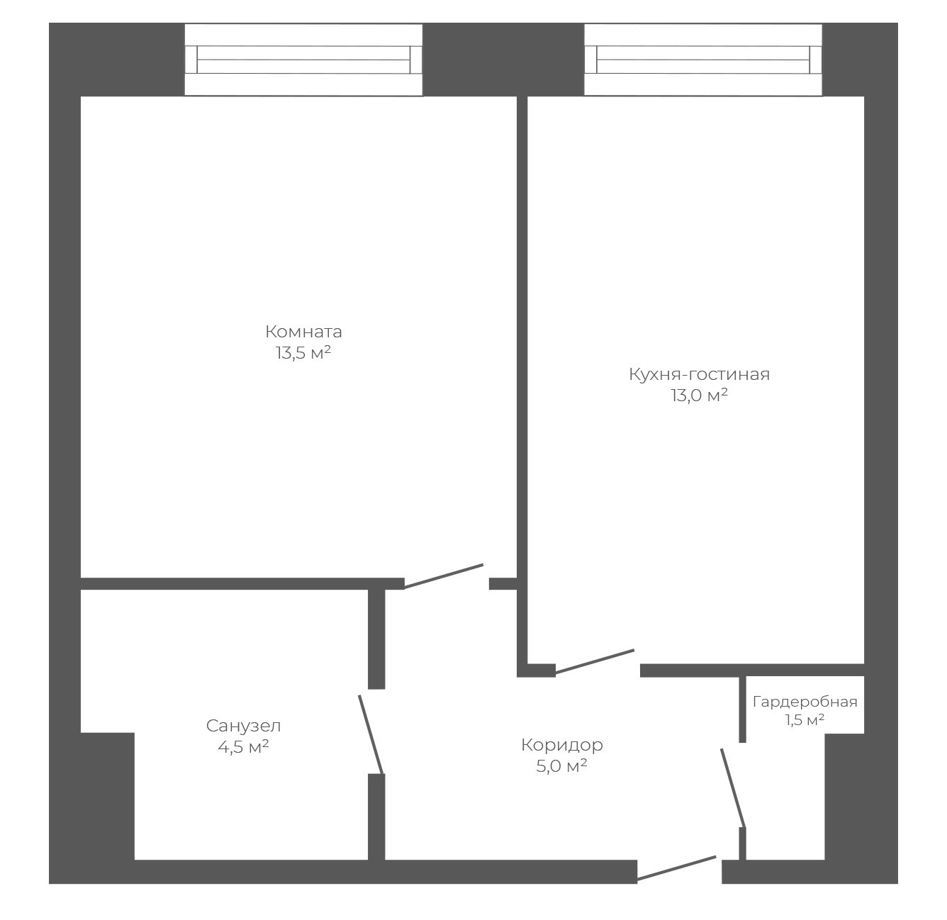 Планировка: коридор 5 м2, гардеробная 1.5 м2, санузел 4.5 м2, комната 13.5 м2, кухня-гостиная 13 м2.