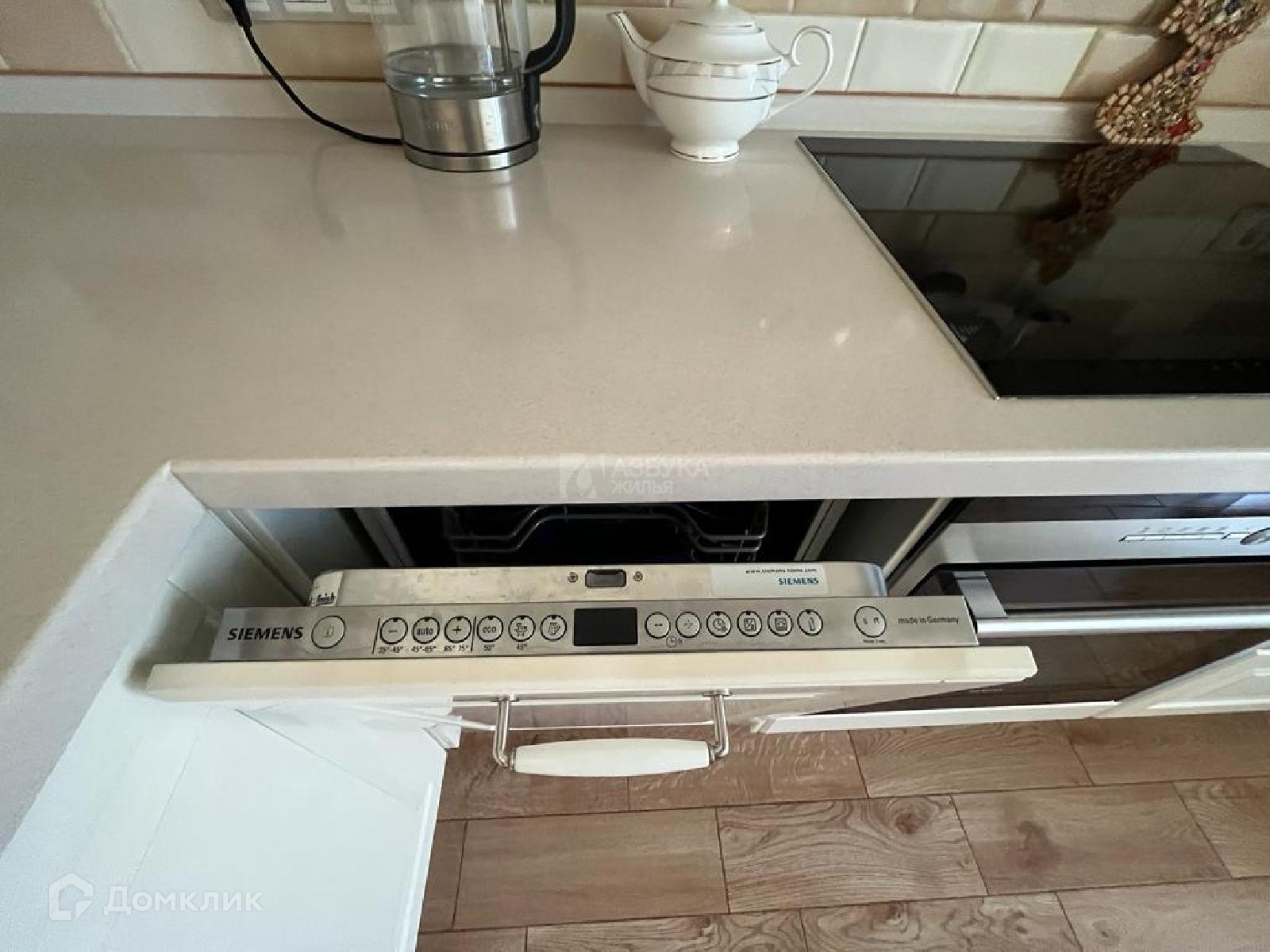 ПРОСТОРНАЯ КУХНЯ со столешницей из искусств. камня и интегрированной в нее мойкой. Встроенная техника Siemens (духовой шкаф, индукц. плита, вытяжка, посудом. машина). Теплые полы, испанская плитка на полу, смеситель с фильтром для питьевой воды Grohe Blue, встроенная микроволновка, итальянская плитка на кухонном фартуке.