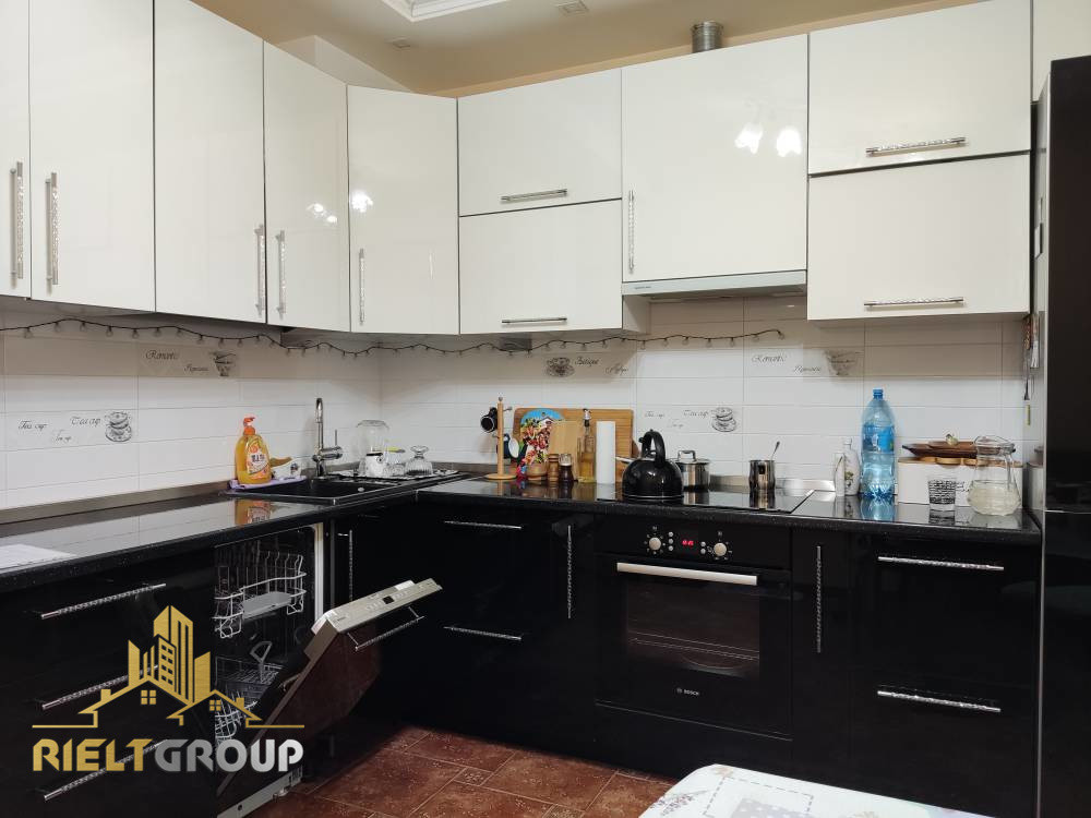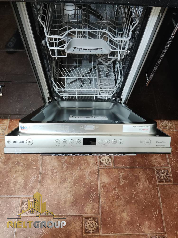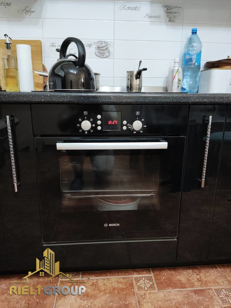 На кухне установлен современный встроенный гарнитур с качественной встроенной техникой BOSCH (встроенная духовка, варочная панель, посудомоечная машина). Имеется вытяжка.