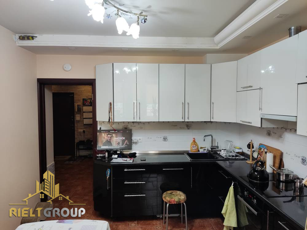 На кухне, лоджии, в прихожей, гардеробной, в ванной комнате и туалете смонтирована система теплых полов. В комнатах уложен ламинат. Потолки достаточно высокие, натяжные, кроме кухни.