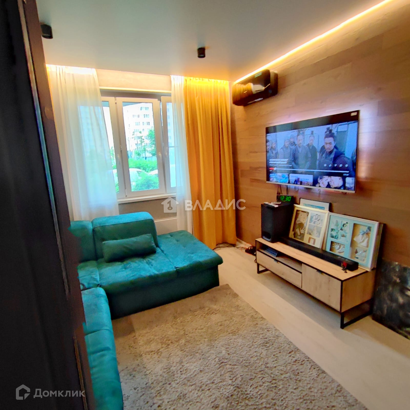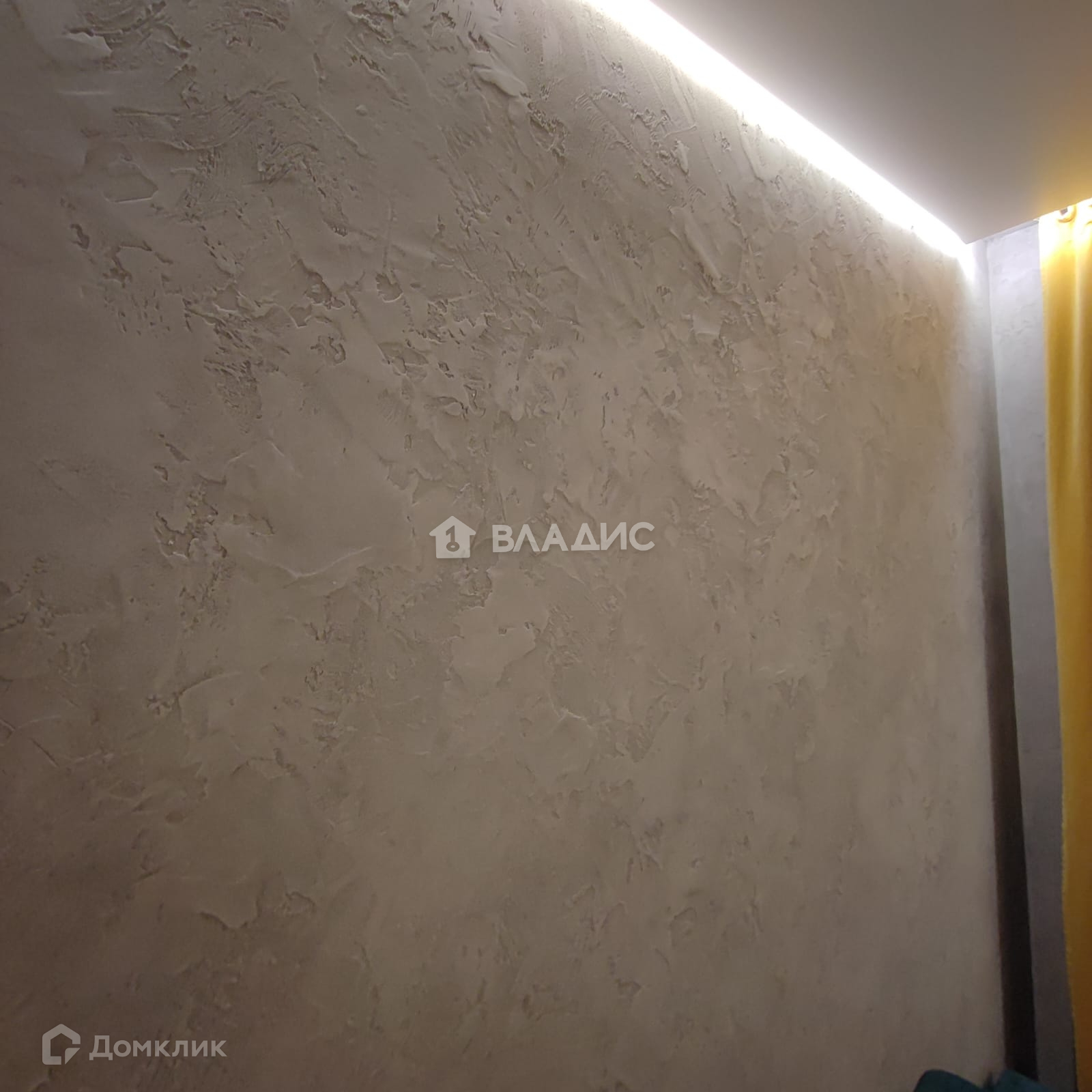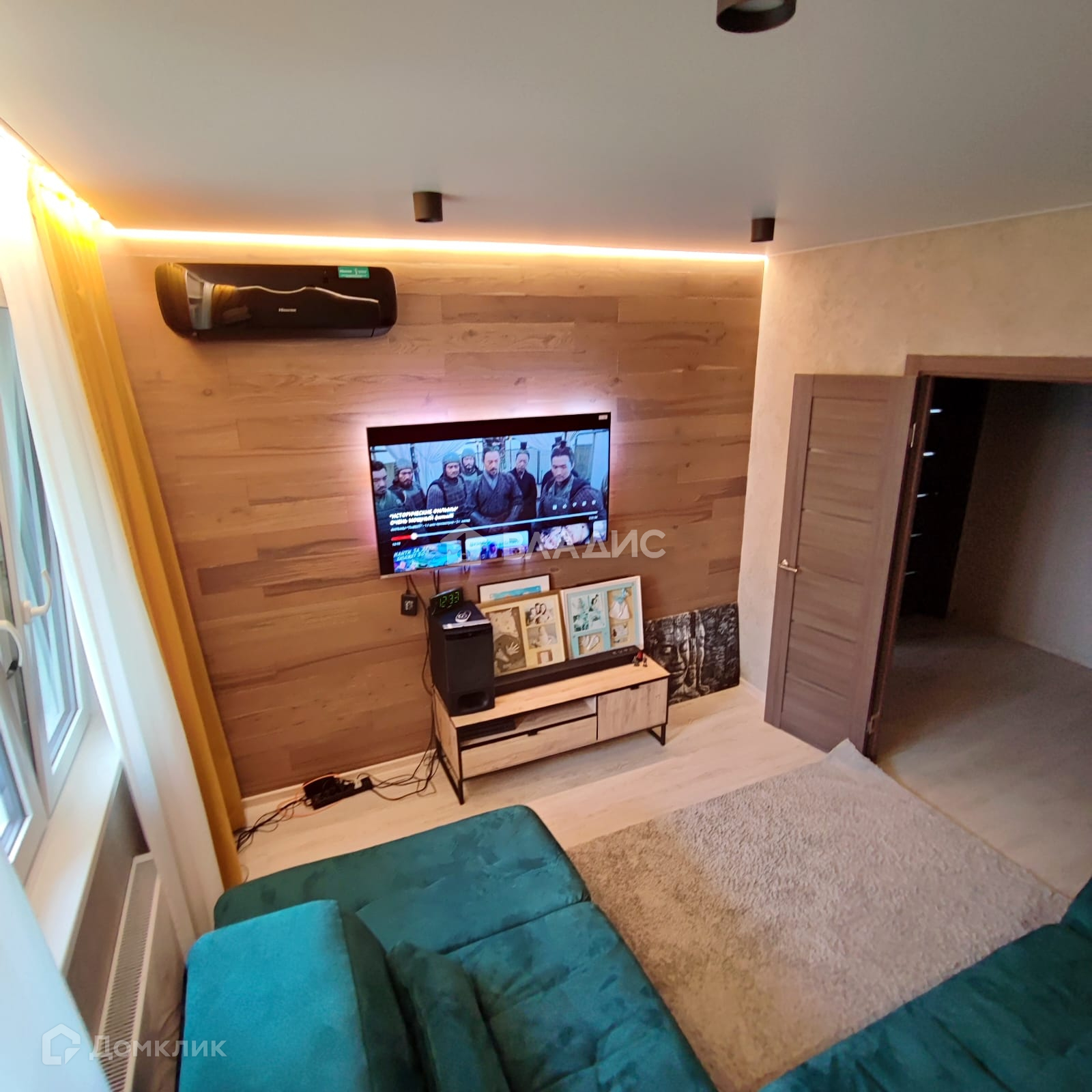 В комнате с ТВ сделан хороший ремонт:штукатурка под бетон, стена с ТВ инженерная доска, два уровня подсветки потолка.