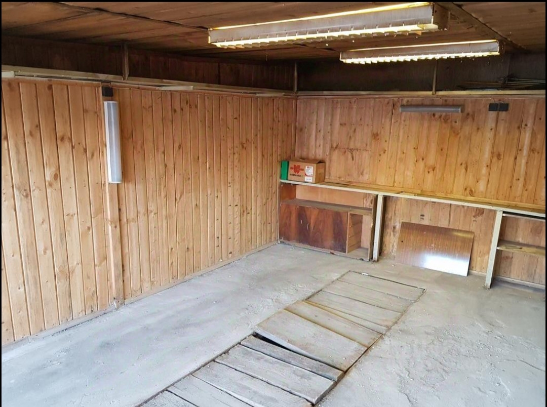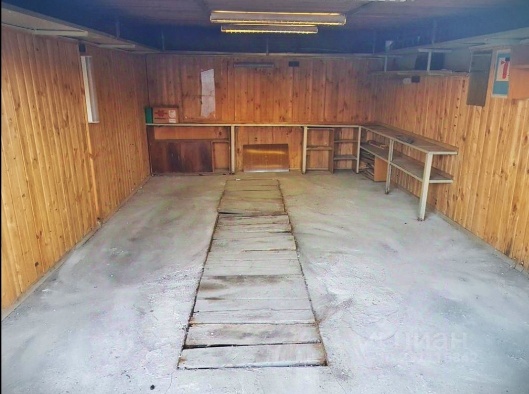 Гараж изнутри отделан вагонкой и есть полки для хранения!