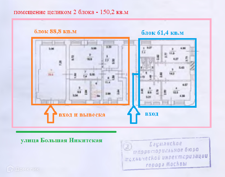 Арт. 40189609 Сдаётся помещение свободного назначения на Большая Никитская ул. ЦАО, престижная локация - внутри садового кольца, в самом центре г. Москвы. До метро "Баррикадная" 9 минут пешком (до метро Арбатская 16 мин, до метро Пушкинская 18 мин пешком). Общая площадь помещения – 150,2 кв.м. (делится на два самостоятельных блока 88,8 кв.м и 61,4 кв.м). Расположено на первом этаже уникального жилого дома 1925 г. постройки. Светлое, удобное помещение (везде окна). Дизайнерский ремонт в стиле "лофт". Максимум полезной площади, минимум коридоров. Свободная планировка позволяет менять назначение помещений под нужды бизнеса: опен спейс, отдельные кабинеты, ресепшн, переговорные, 2 санузла, кухня. 2 входа. Потолки 2,8 м. Кондиционеры. Электроэнергия 19 кВт. Отдельный вход и вывеска видны с ул. Б.Никитская. Место для рекламы - возможность размещения вывески на фасаде. Исторический район Москвы с множеством культурных и архитектурных достопримечательностей, 13 мин пешком до легендарных Патриарших прудов. Текущее использование – под офис, возможно также под офис-продаж, шоу-рум, магазин, центр обучения. Свободно и готово к въезду. Без комиссии.