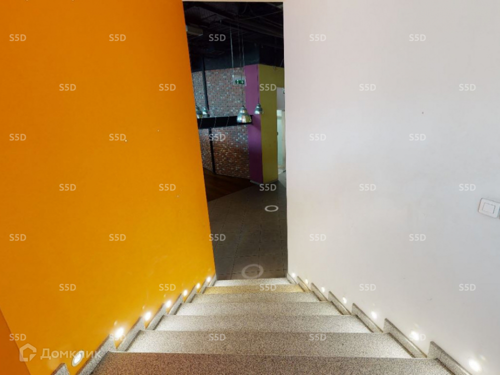 Двухуровневое помещение с высокими потолками, лестницей внутри блока.
