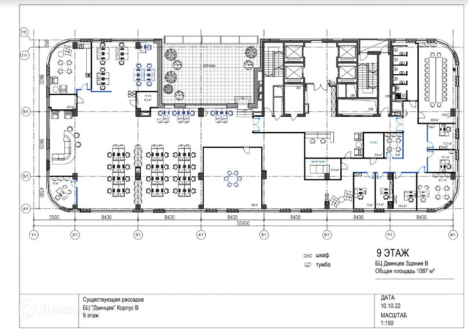Сдается в аренду полностью этаж офисный блок площадью 1087 кв. м, на 9 этаже в бизнес-центра "Двинцев (корпус В)" класс A.