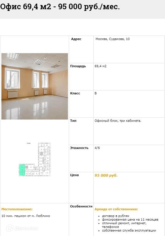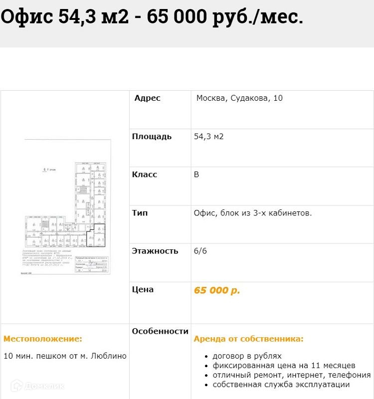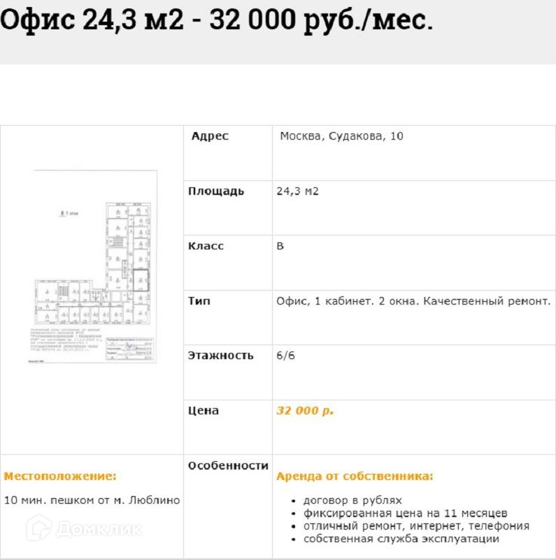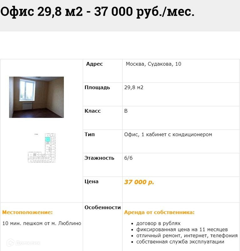 ЛОТ 3721 Вашему вниманию предлагается Аренда Офиса расположенного в БЦ Класса "В" "Судакова Плаза" в 10-ти минутах пешком от м. Люблино. Офис в рабочем состоянии, кабинетной планировки. Общая приточно-вытяжная вентиляция и кондиционирование воздуха. Системы противопожарной сигнализации. Круглосуточная охрана с видеонаблюдением. Охраняемая парковка. Отопление. Водопровод и канализация. В Арендную ставку включено: уборка мест общего пользования, все эксплуатационные расходы. Отдельно оплачивается: уборка Арендуемого помещения, интернет и телефония. УСН. Аренда Офиса с ИФНС № 7723. По всем интересующим вопросам с удовольствием отвечу по телефону.