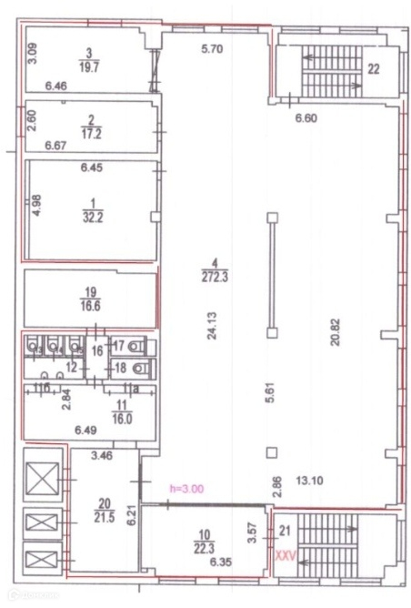 Планировка: опен спейс, кабинеты, кухня и сан узлы.