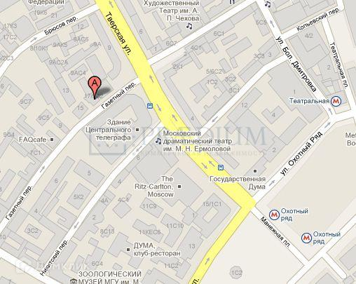 Объект находится на пересечении Тверской ул. и Газетного пер., в непосредственной близости от Кремля и Красной площади. Имеет прекрасный доступ на все центральные магистрали, в том числе Садовое и Бульварное кольца.